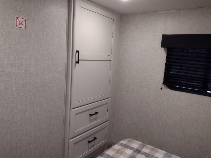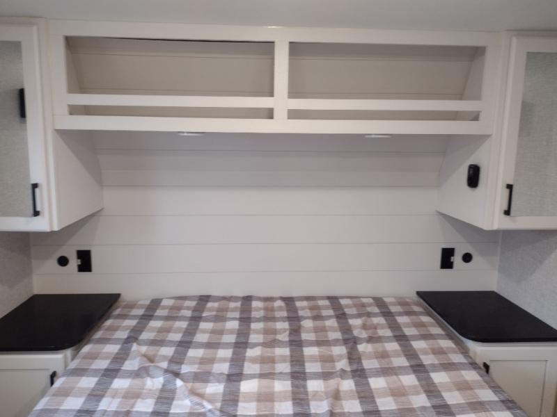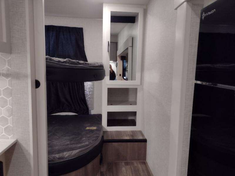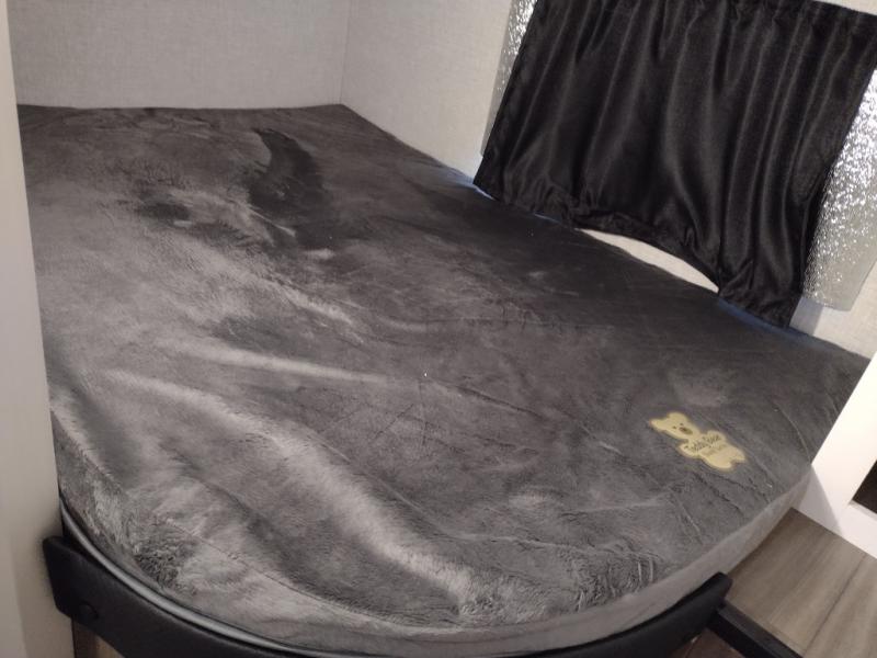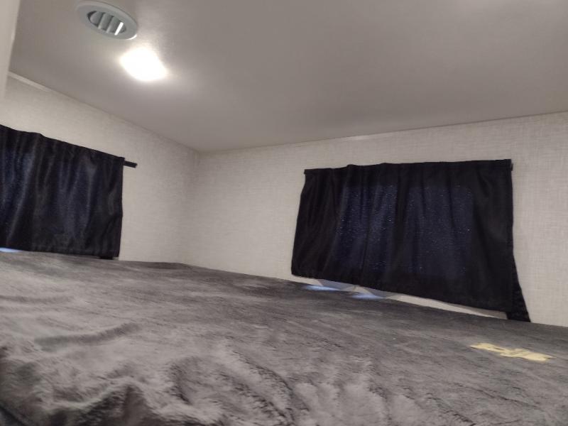 If you enjoy camping with a larger group, this fifth wheel is perfect for you! The rear bunkhouse includes double-size bunks, bunk storage and a wardrobe to keep this space tidy. You'll have the front private bedroom all to yourselves with a queen bed, and if you have any other guests, they can sleep on the tri-fold sofa and U-shaped dinette in the main living area. This space is also shared with the full kitchen, complete with a microwave and range, 12V refrigerator, and plenty of overhead cabinets for storage. After dinner, head outdoors to enjoy the 19' power awning with LED lights as you relax in your camp chairs!