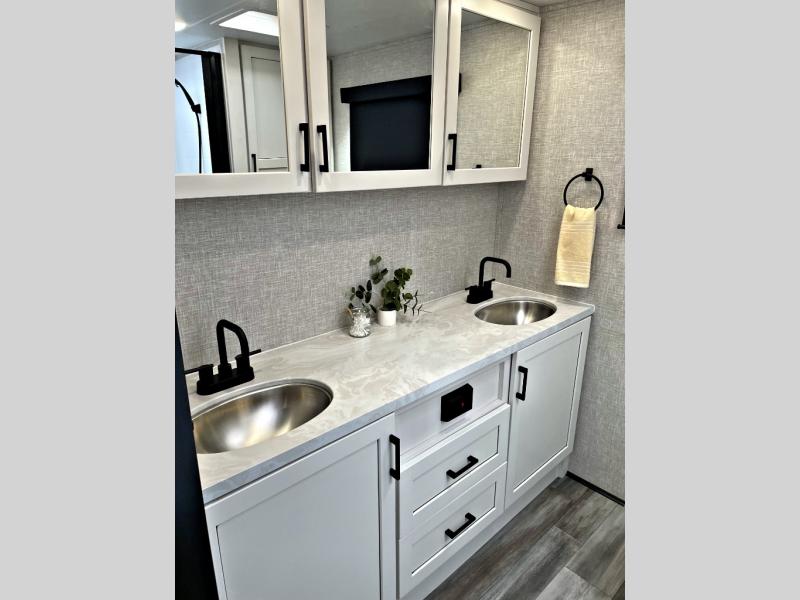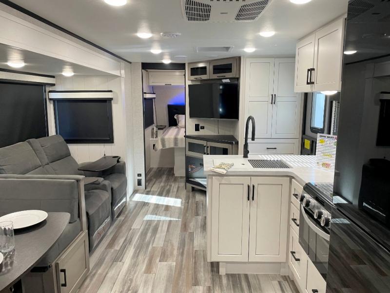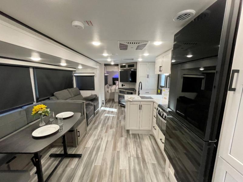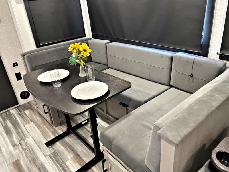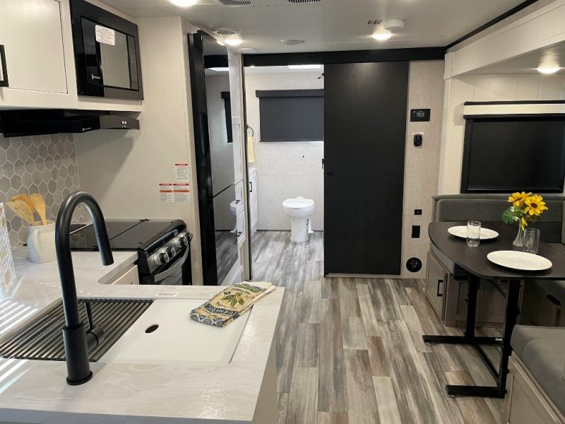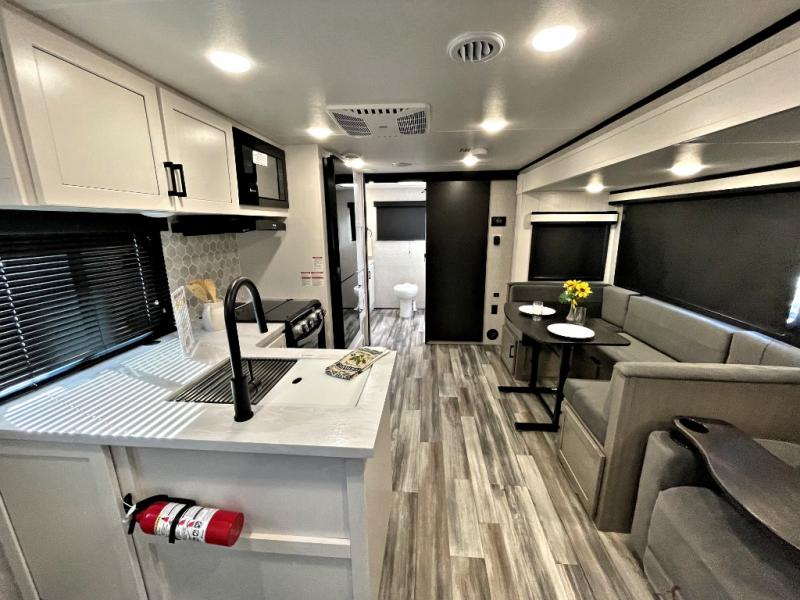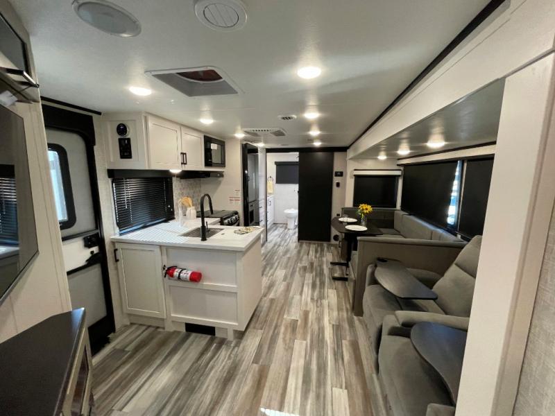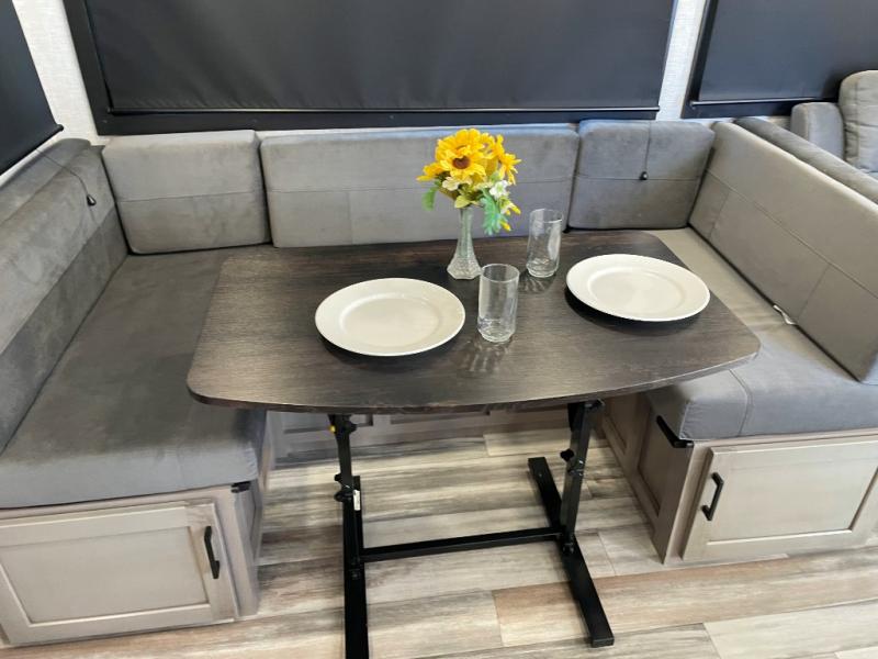 It won't be hard to find comfort in this spacious travel trailer! The large slide out in the main living area will provide more floor space to let the dog nap on the floor and let the cook whip up dinner in the kitchen. There is a tri-fold sofa and U-shaped dinette that will be perfect for meals times, relaxing, and extra sleeping space. This unit includes a full rear bath with dual bath sinks, a linen closet, plus a shower with a seat for added comfort. The front private bedroom includes a queen bed, dual nightstands, and a bedroom closet to keep your space tidy. Head outdoors to visit under the 20' awning, grab your fishing poles from the exterior storage, or fill the dogs water bowl with the external shower!