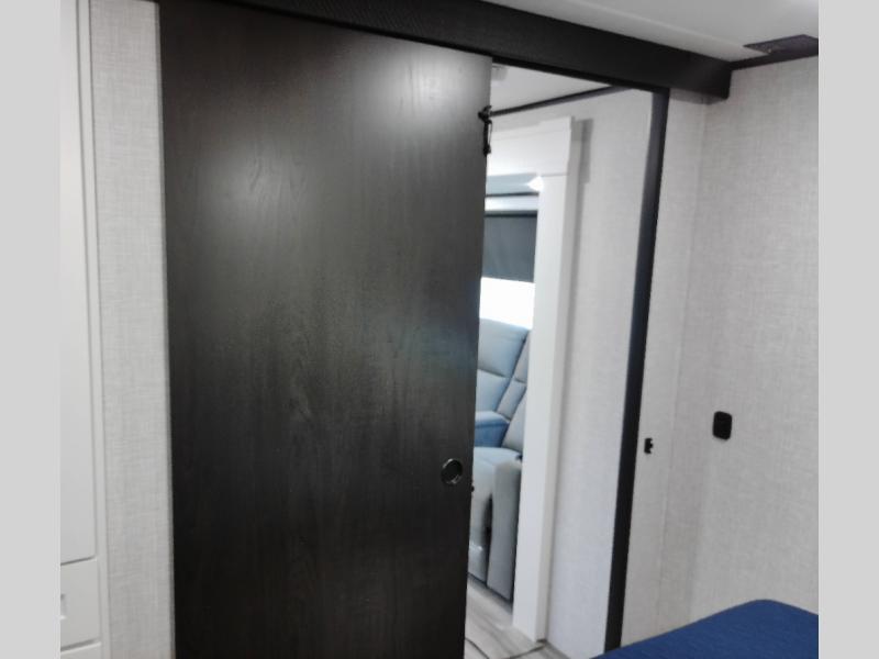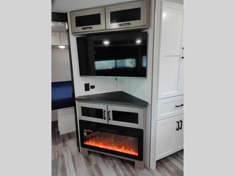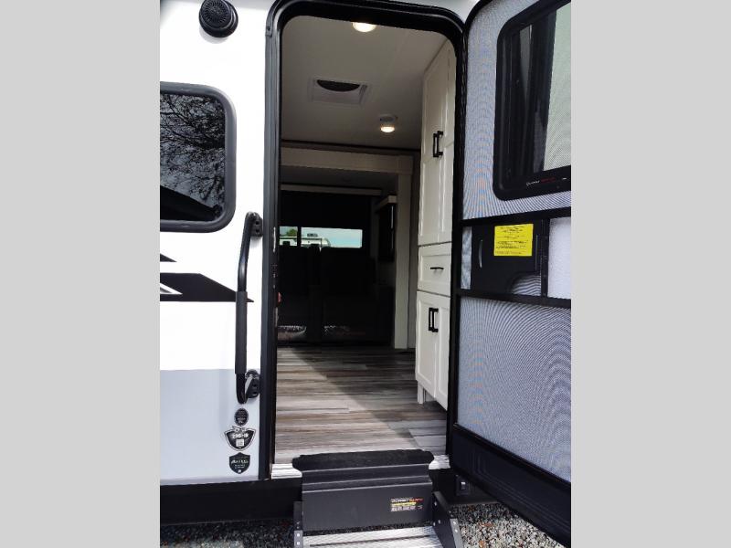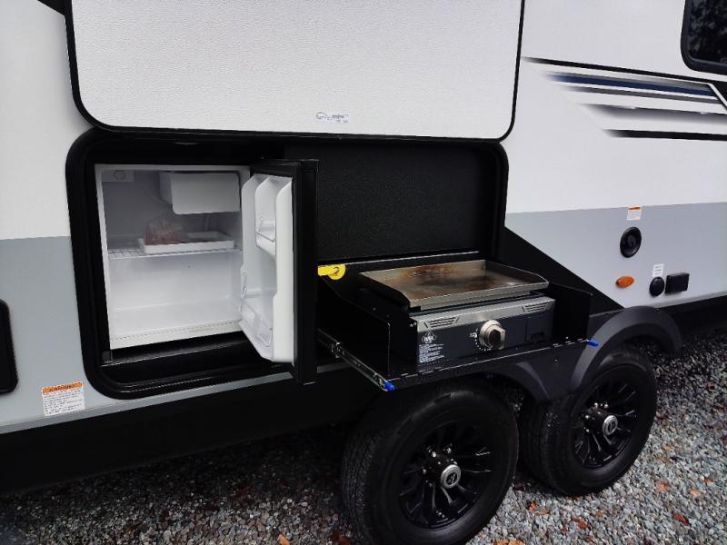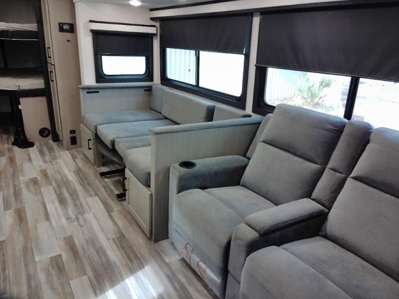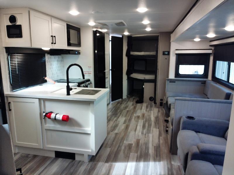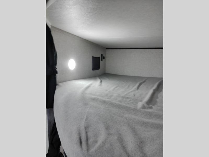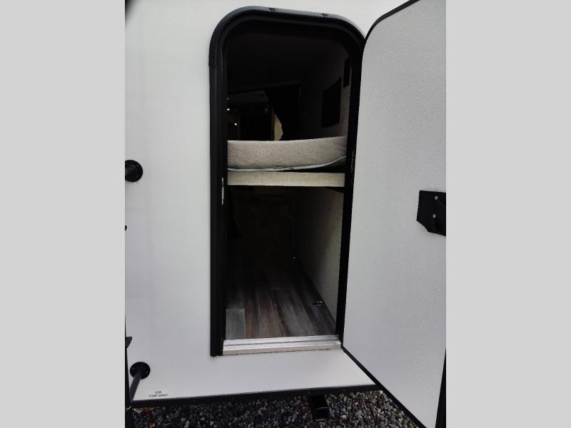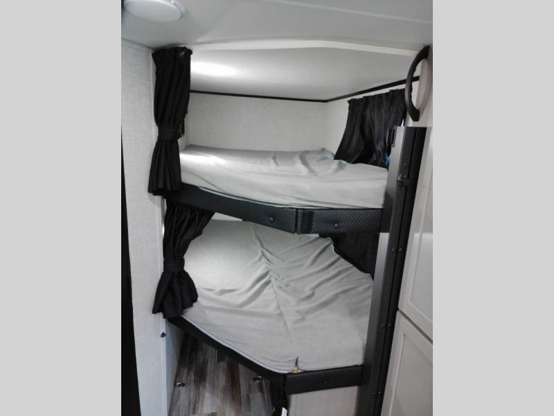 Your whole crew can join along on camping trips with this travel trailer that can sleep ten each night! Not only are there double-size bunks, but also a U-shaped dinette, tri-fold sofa, plus a queen bed in the front bedroom! There is also pass-thru storage under the bed so luggage, board games, and blankets can be kept out of the way. The chef of your group can cook indoors on the three burner cooktop or at the outside kitchen on the pull-out griddle. This model also includes a full bath with one of the dual entry doors for added convenience!