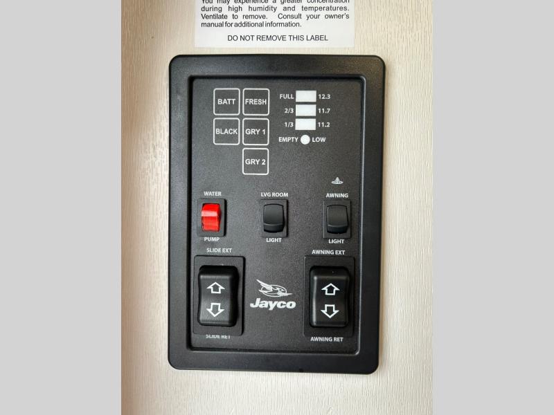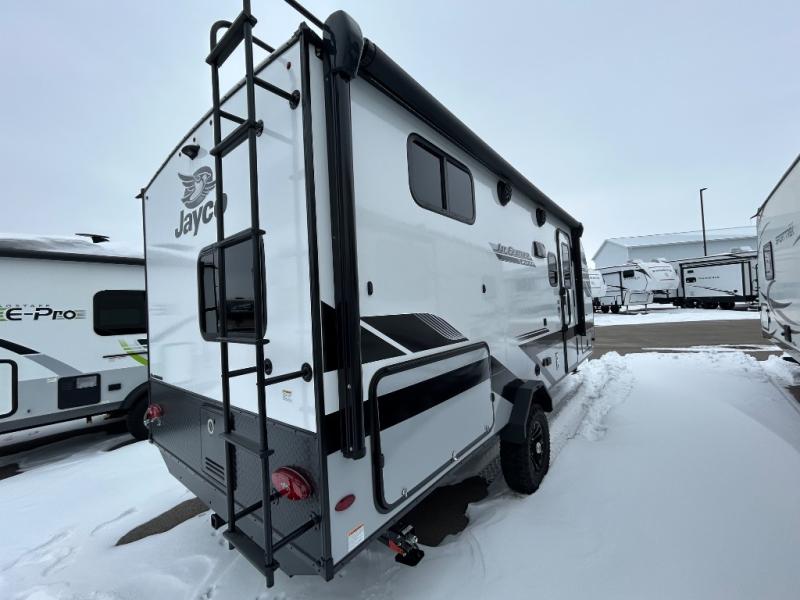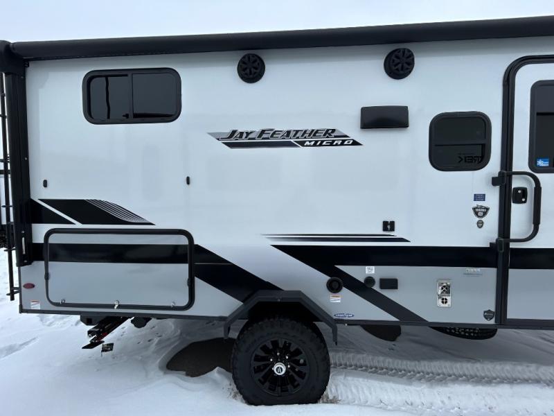 Jayco's Jay Feather Micro travel trailer is ready for adventure at the drop of a hat! The Climate Shield weather protection will let you camp well into the colder months and the Stronghold VBL with double-sized Azdel is ultra durable. The Jay Pro Package includes radial tires with self-adjusting brakes, a rear-mounted roof ladder, and the Overlander 1 Solar Package with a 200W solar panel. Additional exterior features include marine grade exterior speakers, a swing-out entry door assist handle, a power tongue jack, and more! Inside, you will love the 4-inch high-density dinette cushions with vinyl backing for easy cleaning, along with the handcrafted hardwood door/drawer fronts, residential style kitchen countertops, and decorative roller shades with a reflective barrier for better insulation.