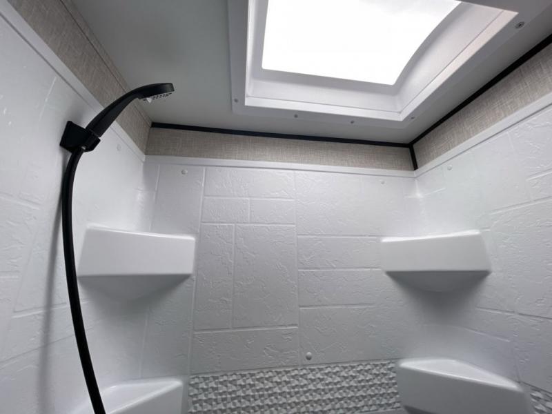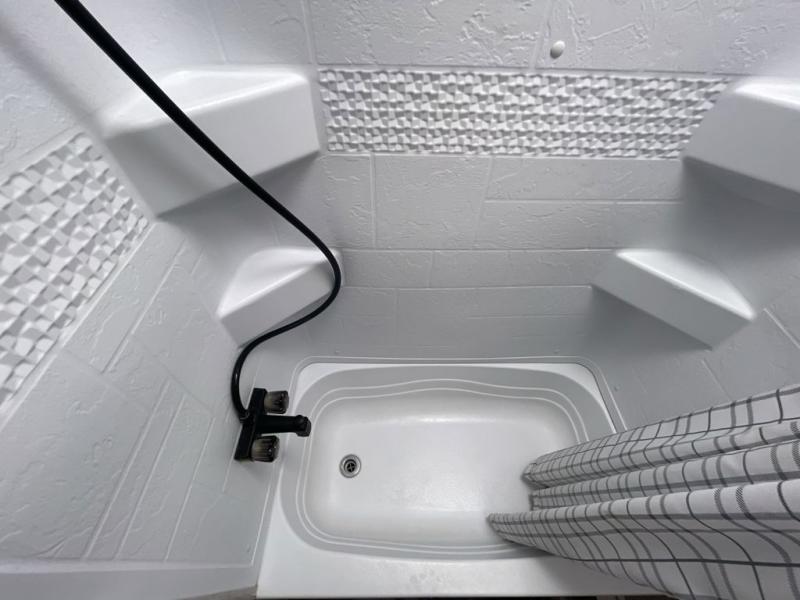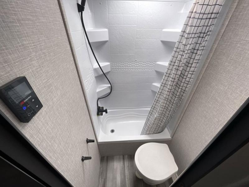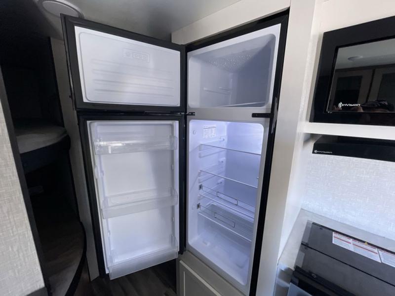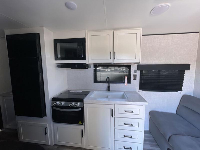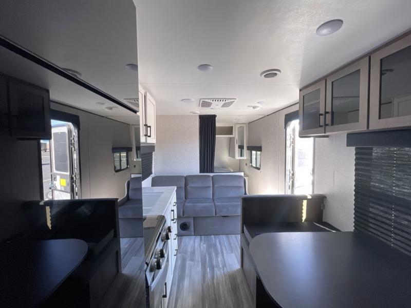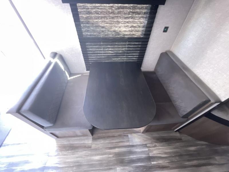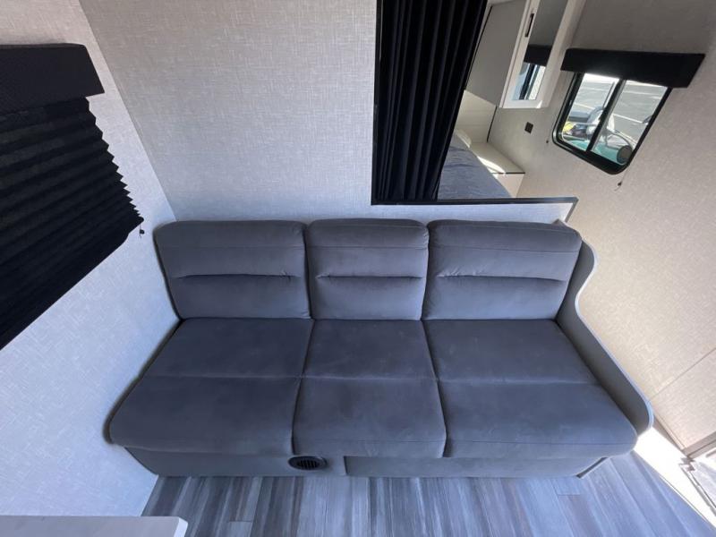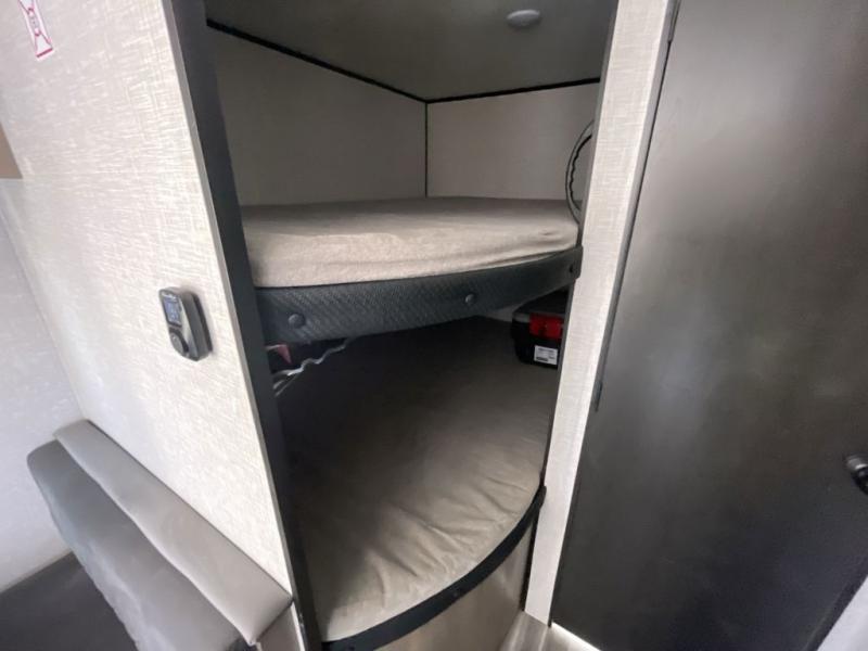 You can comfortably sleep up to eight people in this trailer thanks to the double-size bunks, the RV queen bed in the front bedroom, plus the booth dinette and jack-knife sofa in the main living area! The chef of your crew will have a three burner cooktop and microwave oven to prepare meals, and everyone can store their favorite drinks in the 8 cu. ft. 12V refrigerator. The bathroom includes a tub/shower and a toilet, with the sink just outside of this room so others can brush their teeth if one is taking a shower before bed. The outside storage will let you bring along fishing poles and the 16' power awning with LED lights will create a nice place to gather in the evenings!