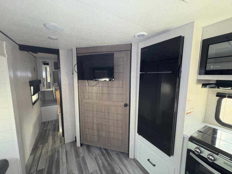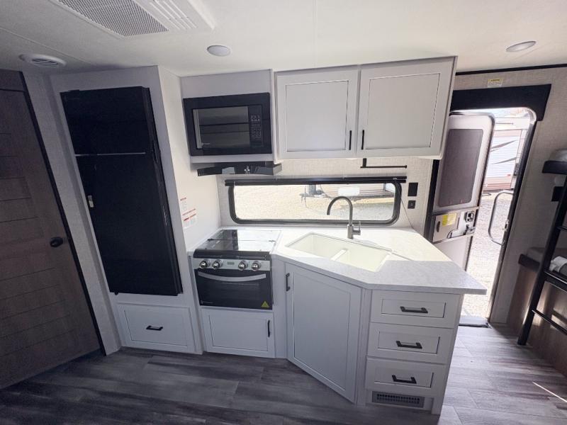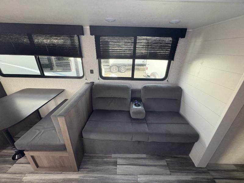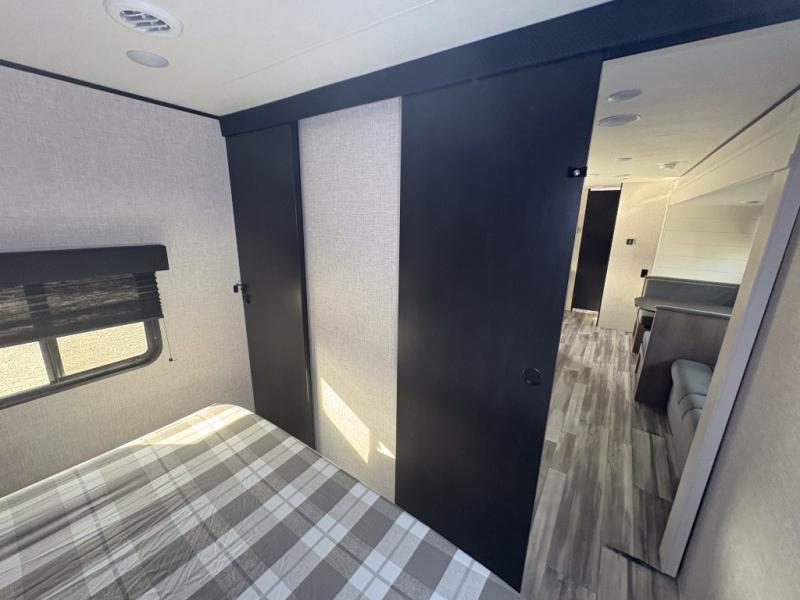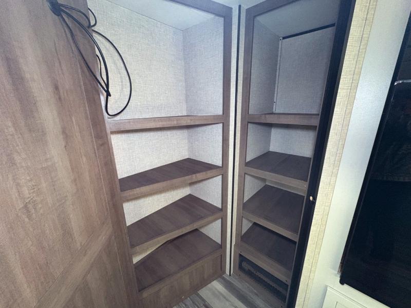 If space is what you're looking for in your next trailer, space is what you'll get this this Jay Flight SLX! The large slide houses the jack-knife sofa and booth dinette, and the added space here will provide everyone room to move about. The chef of your group will love cooking inside, or they can head outside to cook on the outdoor kitchen. Double-size bunks are sure to be a big hit with the little ones, and you'll love having your own space up front in the private bedroom. This unit includes ample storage space, including a hidden pantry with shelves, a bedroom closet plus dual bedside wardrobes, plus exterior storage for hiking or fishing gear!