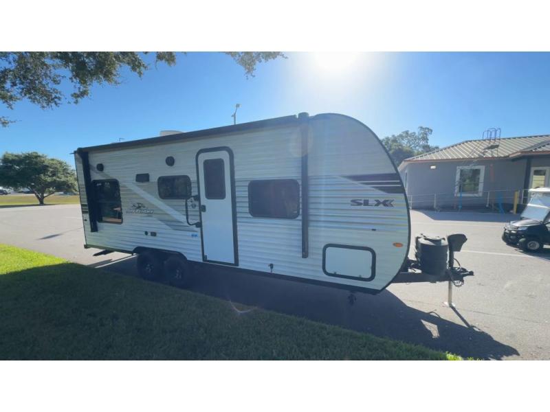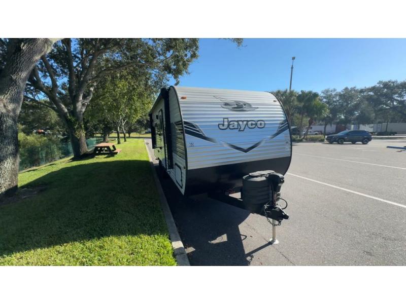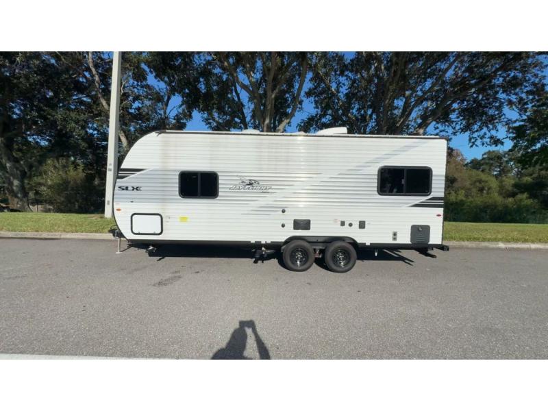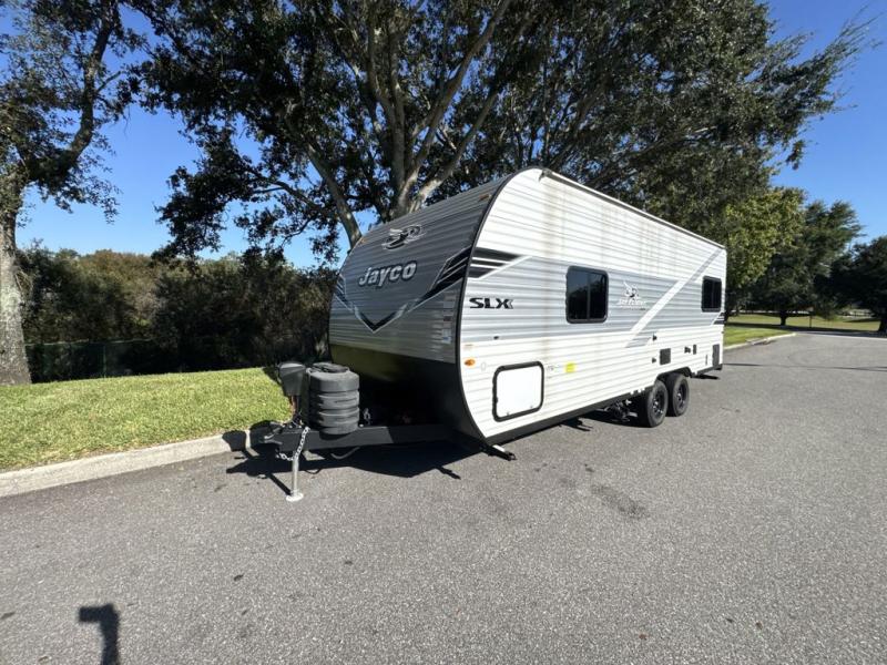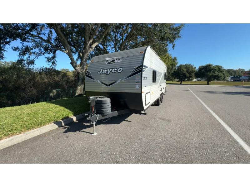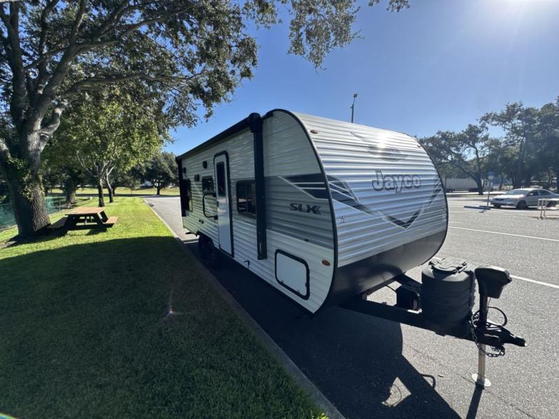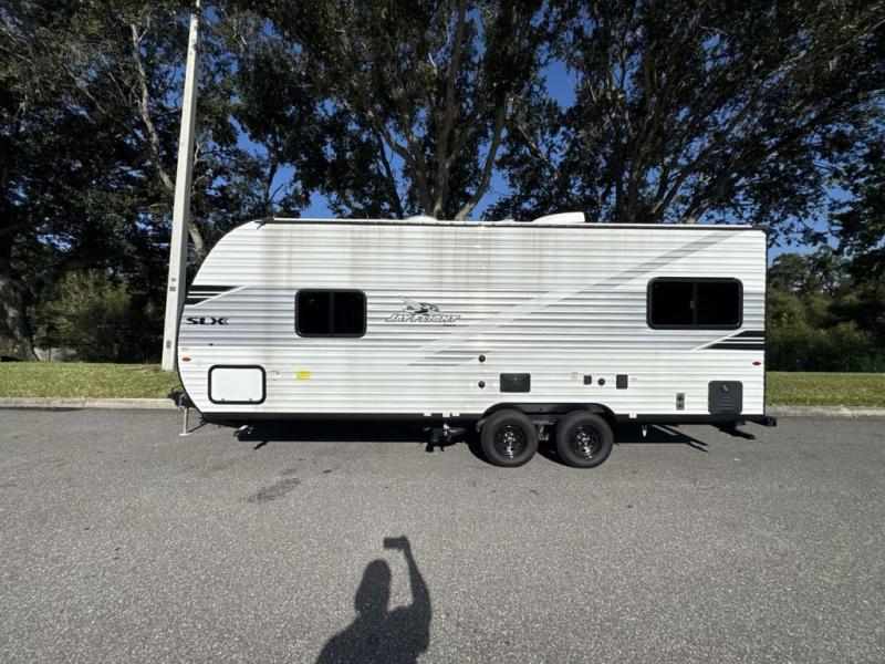 The Jayco Jay Flight SLX travel trailer is quite easy to own because it is lightweight for an easier towing experience. Built on a fully integrated A-frame with galvanized-steel, impact-resistant wheel wells, the Jay Flight SLX has quality at its very foundation. That quality continues on to the electric self-adjusting brakes, easy-lube hubs, Magnum Truss roof system, and LP quick connect. Some of what the mandatory Customer Value Package includes is backup camera prep, Keyed-Alike entry and baggage doors, marine grade exterior speakers, and an on-demand tankless water heater.