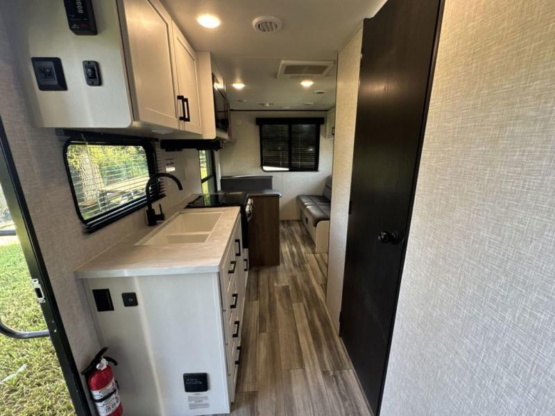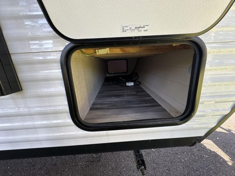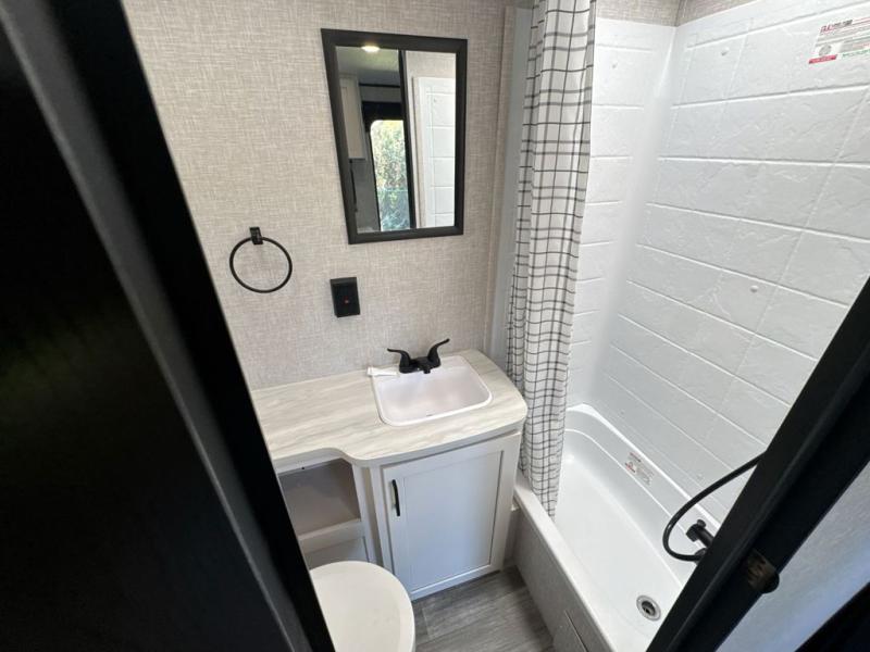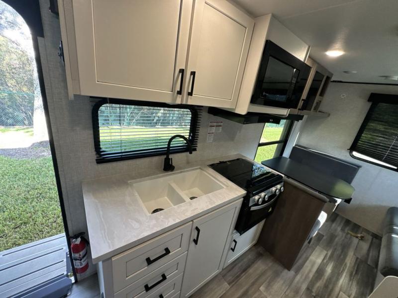 Camping in the woods is just what the doctor ordered and this trailer will provide all the interior comforts you need! There is a three burner cooktop and a microwave oven to prepare meals each day, plus an 8 cu. ft. 12V refrigerator for cold items. After your meal is made, you can dine at the booth dinette or relax on the jack-knife sofa, and these areas can become sleeping space for two to three guests at night. The full bath with a tub/shower means you won't have to use the camp's facilities and the 16' power awning will provide protection from the sun as you visit with other campers!