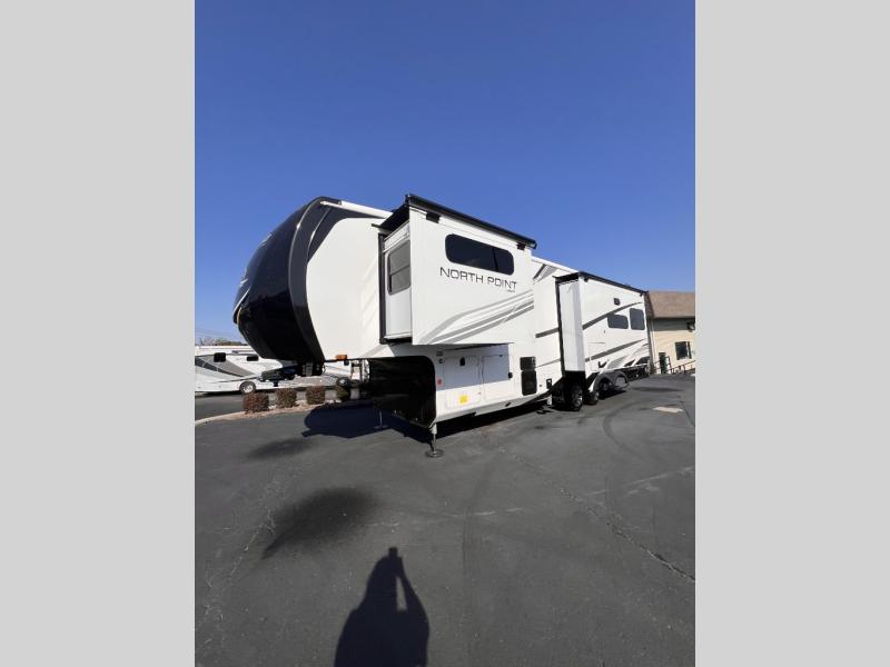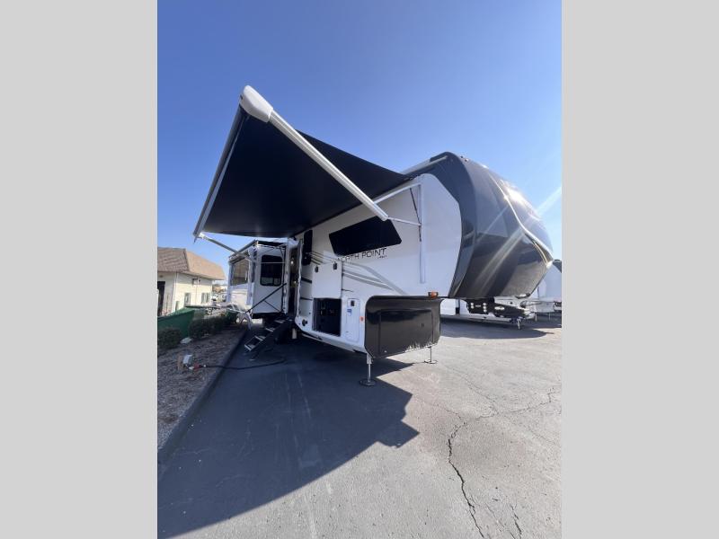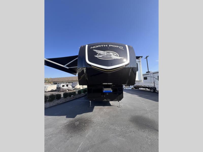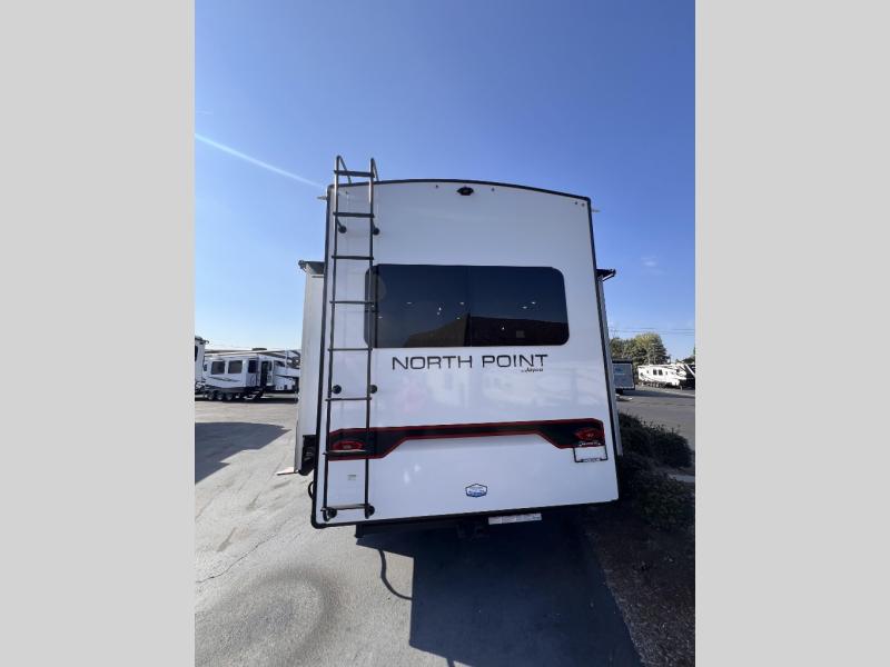 With any North Point fifth wheel by Jayco you begin with a strong foundation with a custom frame, designed and sized specifically to best support each unit. Constructed with Stronghold VBL™ aluminum framed, vacuum bond laminated walls and the Magnum Truss™ XL6™ roof system with an Alpha roof membrane system, which is the strongest tested roof in the industry. The 5-Star Handling package is included with Uniroyal tires, a MORryde rubber pin box, Dexter axles with Nev-R-Adjust brakes, MORryde CRE-3000 rubberized suspension and wet bolt fasteners and bronze bushings. The interior has handcrafted hardwood glazed doors and drawers, vinyl flooring throughout, an integrated under-mount sink in the main bathroom, plus so much more you just have to see one to believe it all!