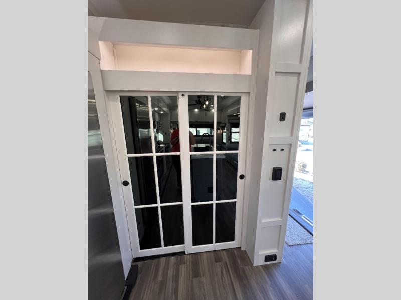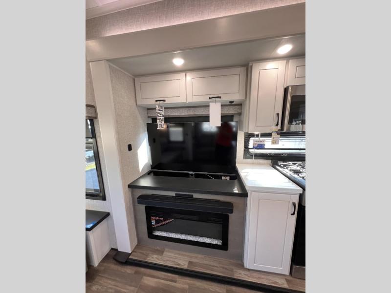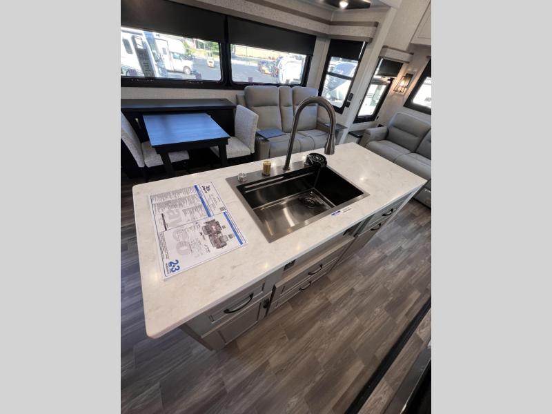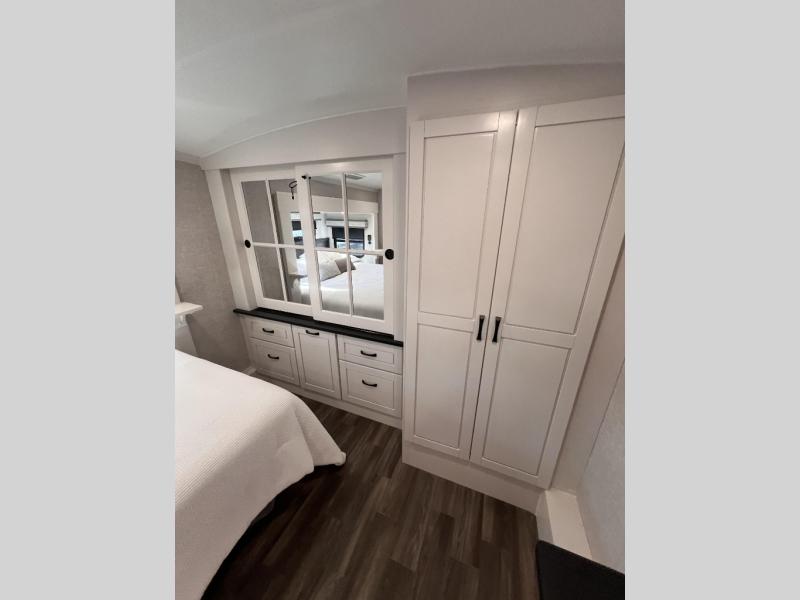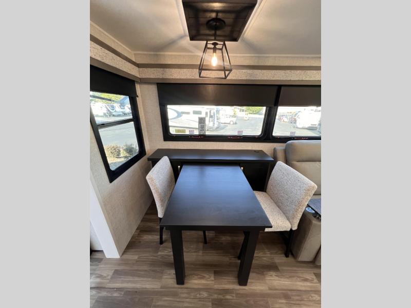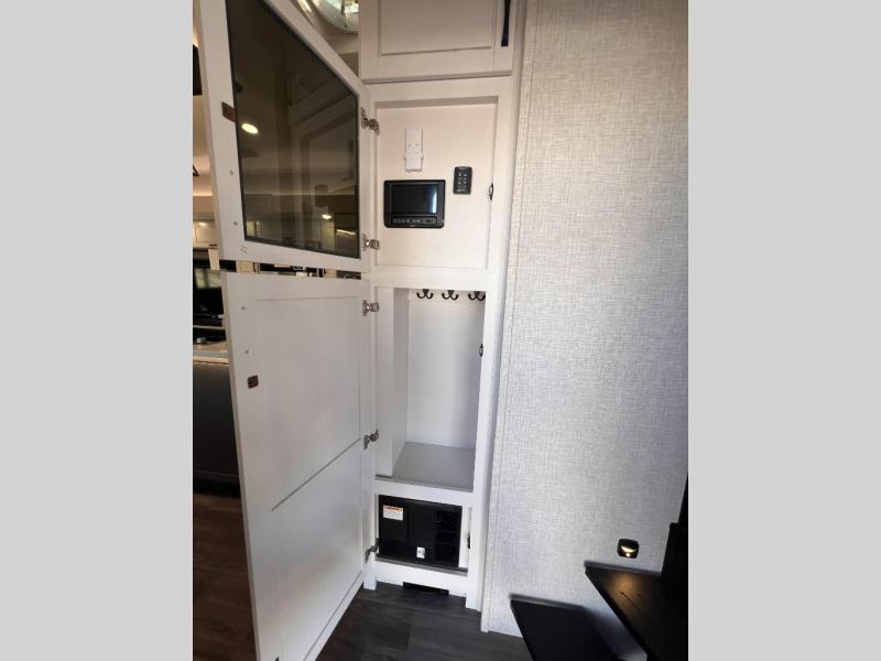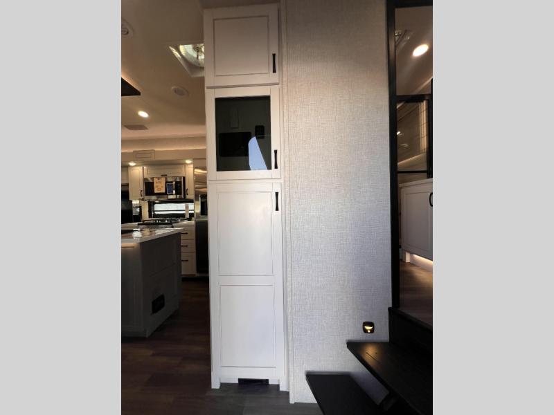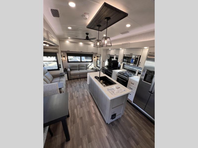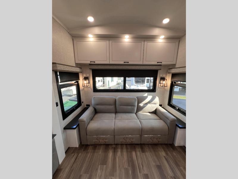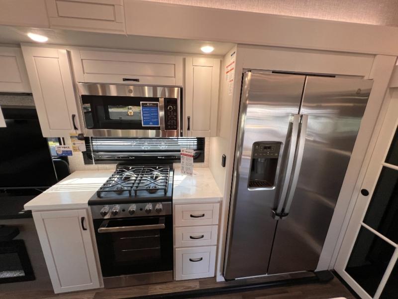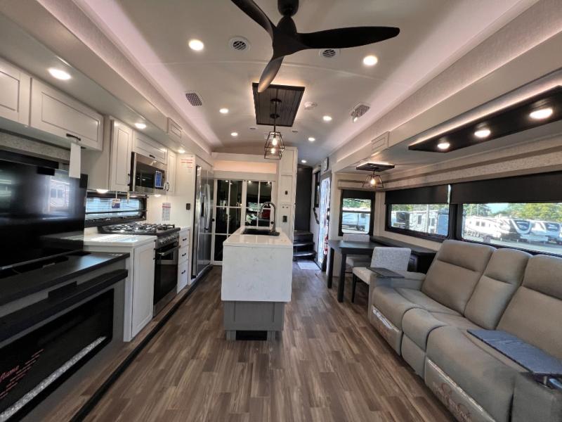 Whether you want to live in this fifth wheel or travel for long periods at a time, you will enjoy the spacious main living and kitchen area with dual slide outs as well as the bedroom with a slide out king bed. You will also find a walk-in closet with hamper and prepped space for a washer/dryer option, and a flip-top dresser with 32" TV. Easily get cleaned up in the full bathroom which also has linen storage. The cook will have a residential refrigerator to store all the cold items and beverages, a kitchen island, a pantry and a residential 24" stove. The 50" Smart LED HDTV with fully digital HDMI output and home entertainment system with subwoofer and fireplace below will provide a cozy place to watch your shows while relaxing on the theater seats, the tri-fold sofa, or the roll-top dinette table.