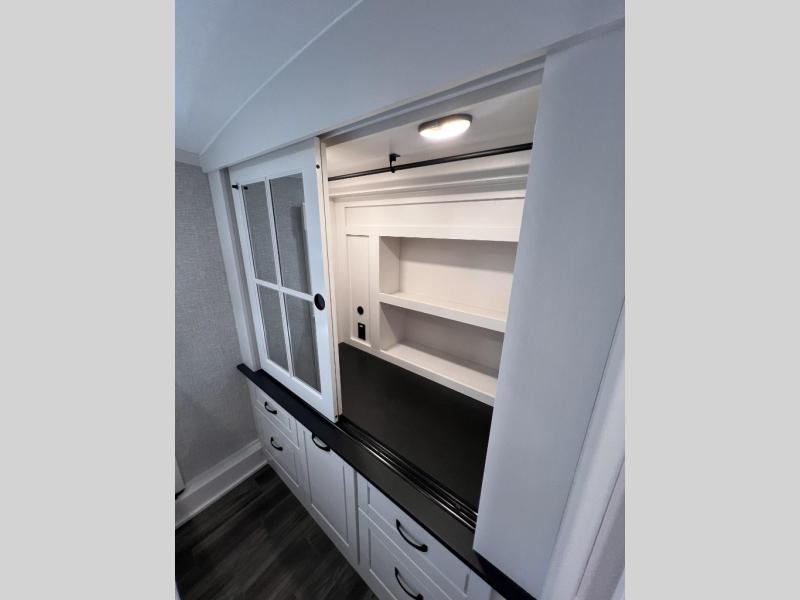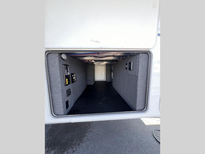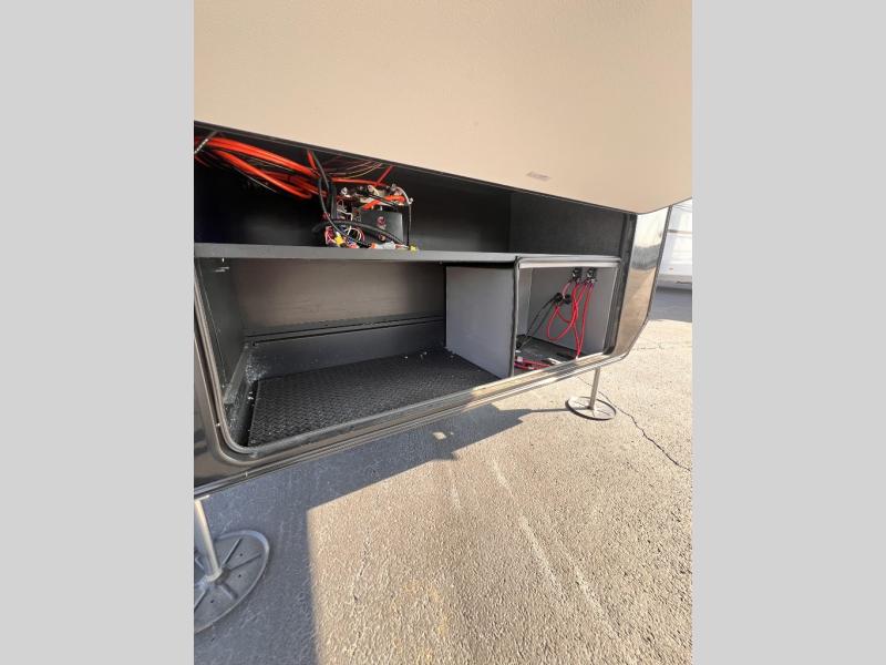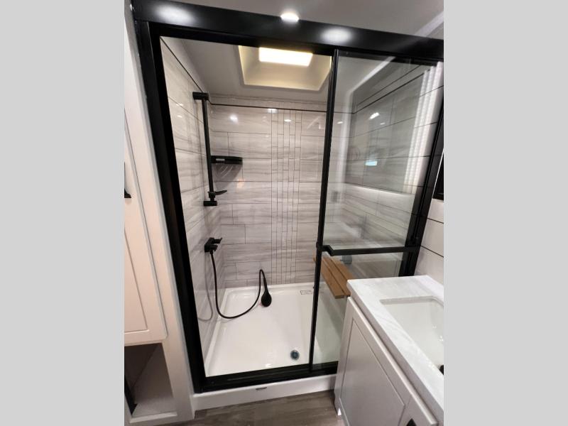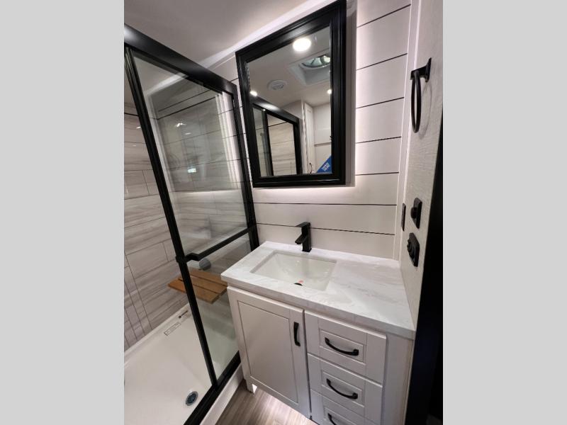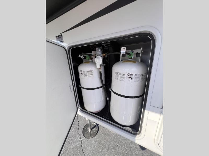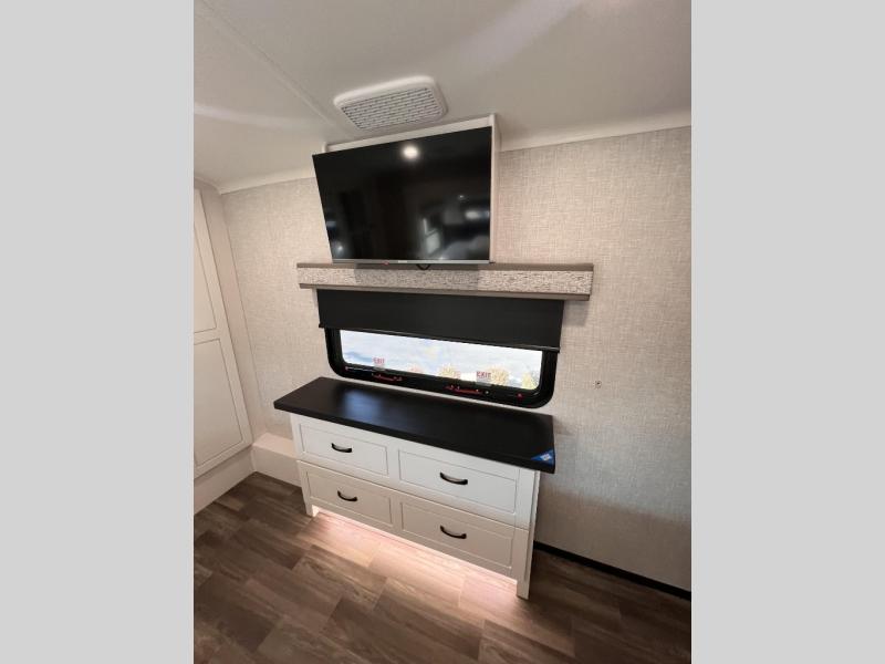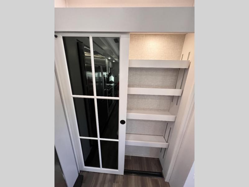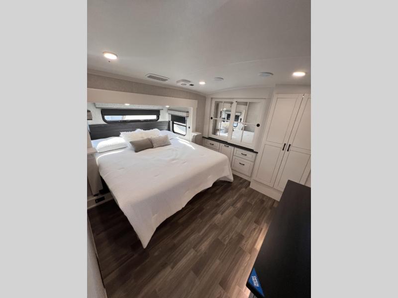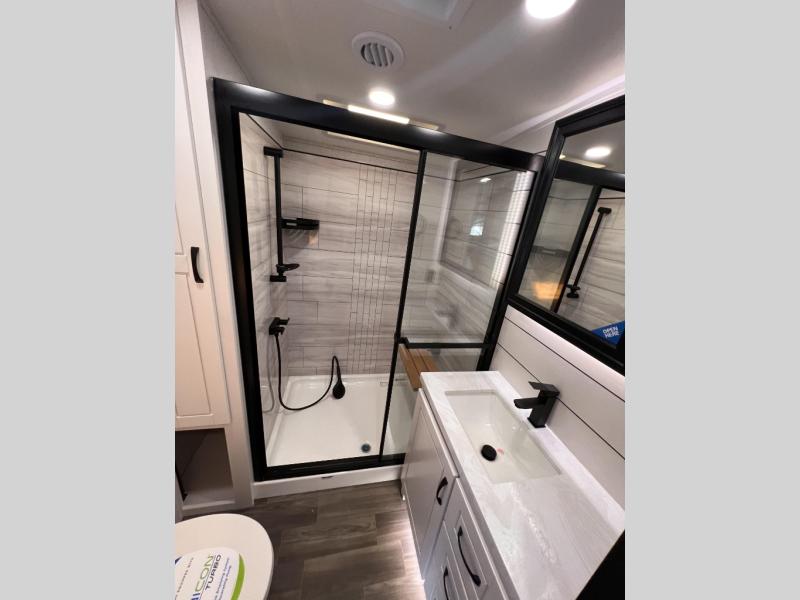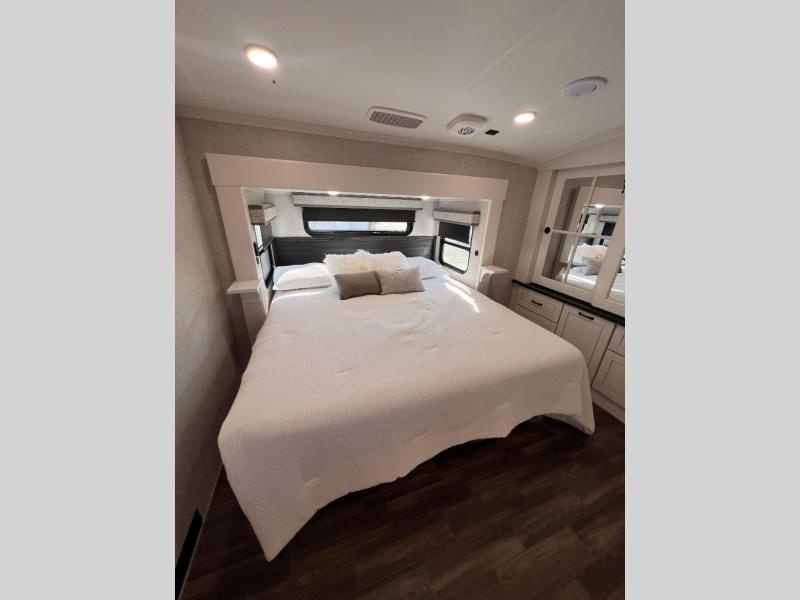 Whether you want to live in this fifth wheel or travel for long periods at a time, you will enjoy the spacious main living and kitchen area with dual slide outs as well as the bedroom with a slide out king bed. You will also find a walk-in closet with hamper and prepped space for a washer/dryer option, and a flip-top dresser with 32" TV. Easily get cleaned up in the full bathroom which also has linen storage. The cook will have a residential refrigerator to store all the cold items and beverages, a kitchen island, a pantry and a residential 24" stove. The 50" Smart LED HDTV with fully digital HDMI output and home entertainment system with subwoofer and fireplace below will provide a cozy place to watch your shows while relaxing on the theater seats, the tri-fold sofa, or the roll-top dinette table.