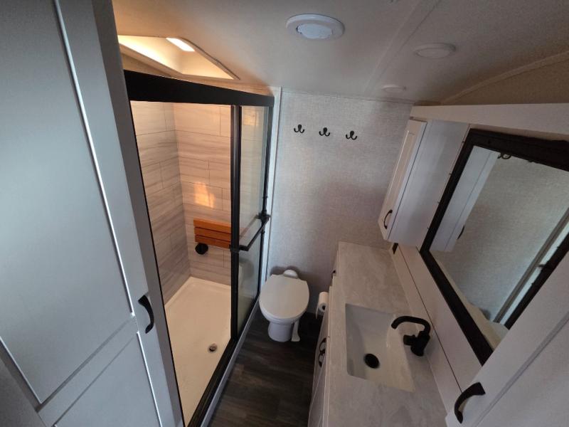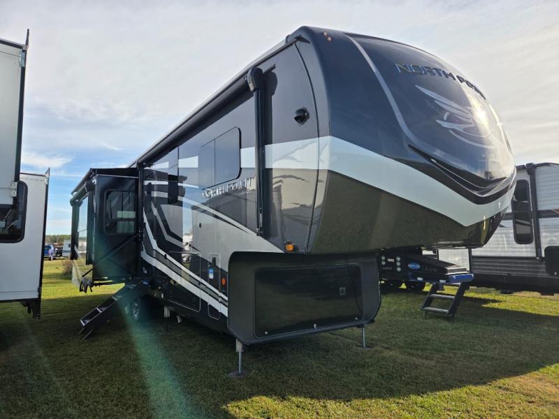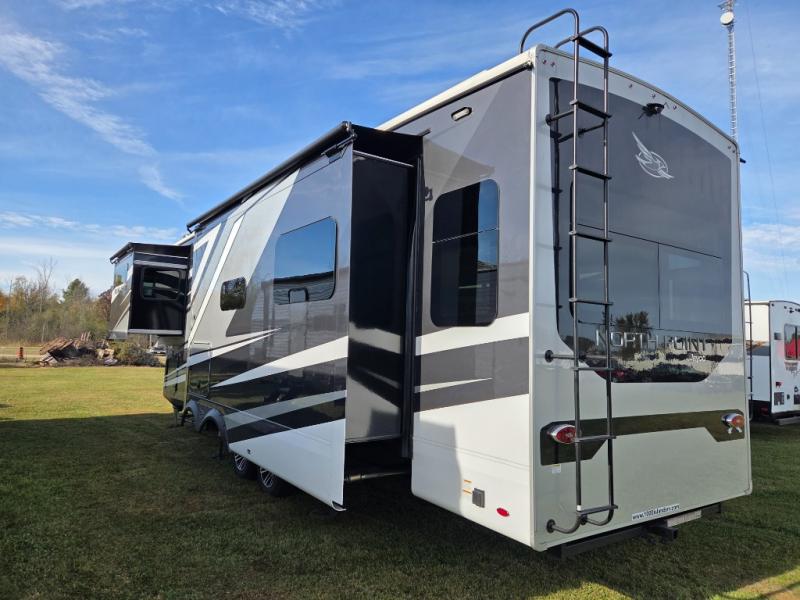 With any North Point fifth wheel by Jayco you begin with a strong foundation with a custom frame, designed and sized specifically to best support each unit. Constructed with Stronghold VBL™ aluminum framed, vacuum bond laminated walls and the Magnum Truss™ XL6™ roof system with an Alpha roof membrane system, which is the strongest tested roof in the industry. The 5-Star Handling package is included with Uniroyal tires, a MORryde rubber pin box, Dexter axles with Nev-R-Adjust brakes, MORryde CRE-3000 rubberized suspension and wet bolt fasteners and bronze bushings. The interior has handcrafted hardwood glazed doors and drawers, vinyl flooring throughout, an integrated under-mount sink in the main bathroom, plus so much more you just have to see one to believe it all!