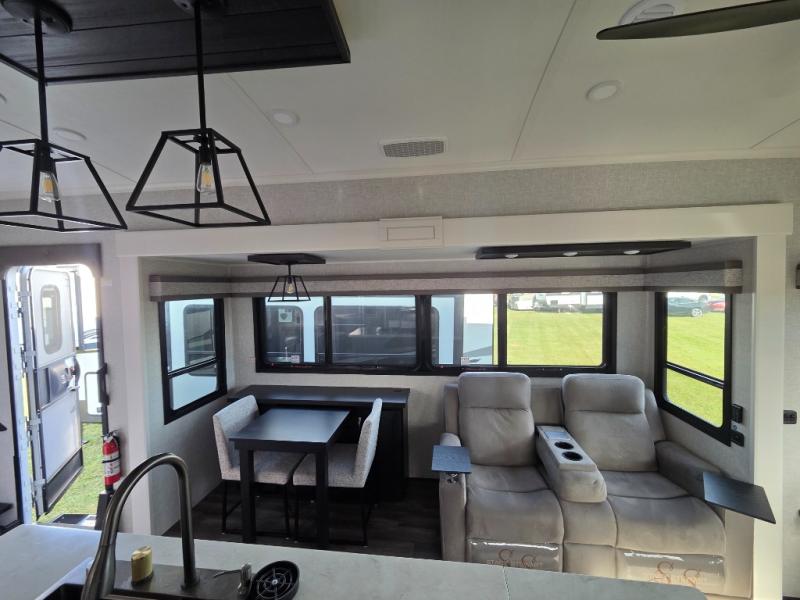 Finding the perfect RV park or campground is all you have to do, then you can load up and hit the road whether you are a full-timer or weekend warrior. The two electric awnings and the three slides are easy to set up and close, and you will have lots of interior and exterior storage to bring everything you might need. The kitchen offers a residential refrigerator and 24" stove, a 30" residential microwave, a kitchen island, a pantry and a pull-out countertop. You can relax on the tri-fold sofa and the theater seats while watching your shows on the 50" Smart LED HDTV with fully digital HDMI output and home entertainment system with subwoofer plus there is a fireplace below. Dine at the free standing table which includes a leaf, two free standing chairs and two folding chairs, or you can work from here as well. The front bedroom offers a king bed slide, a walk-in closet with hamper and prepped space for a washer/dryer option, and a flip-top dresser with 32" TV.