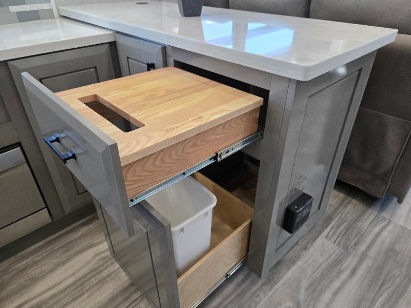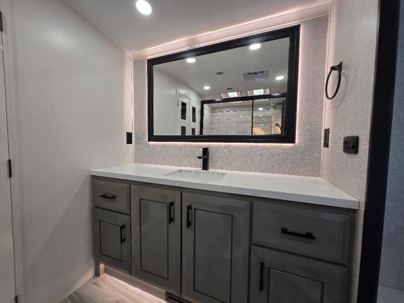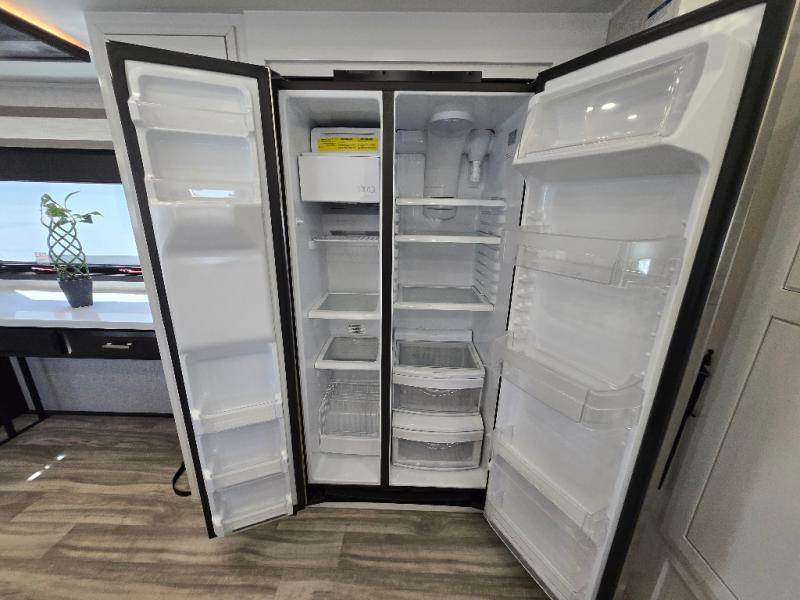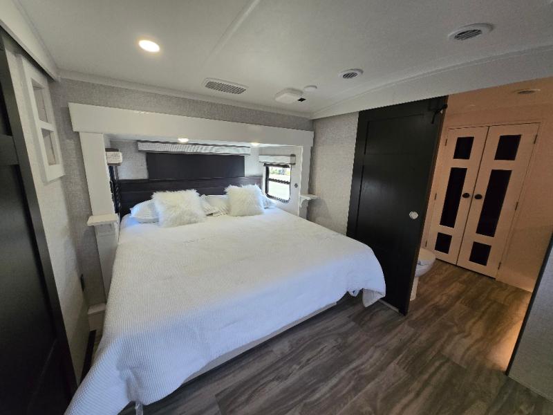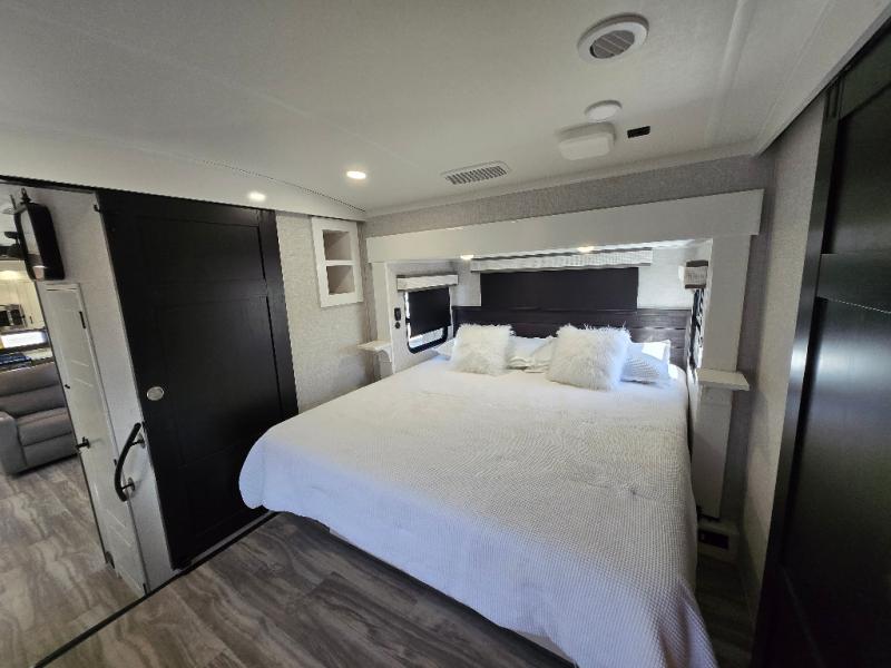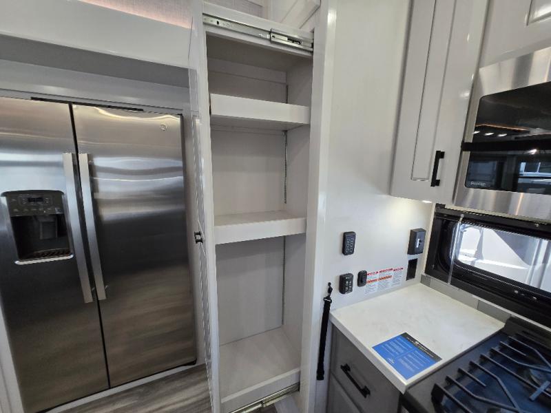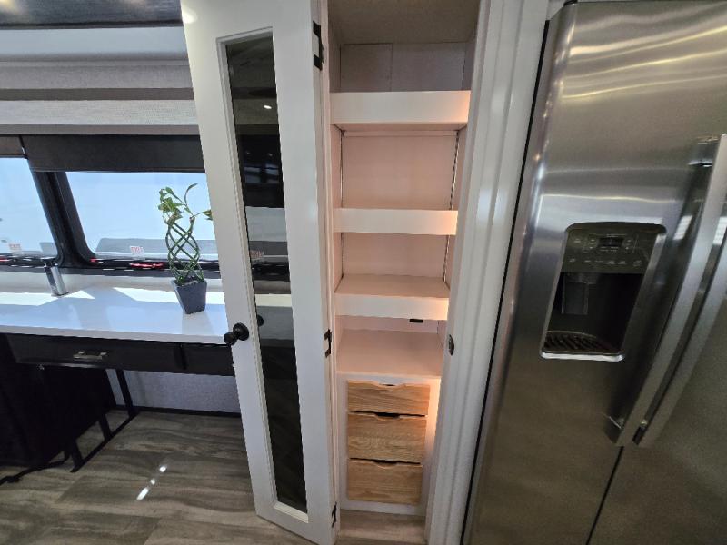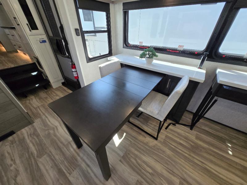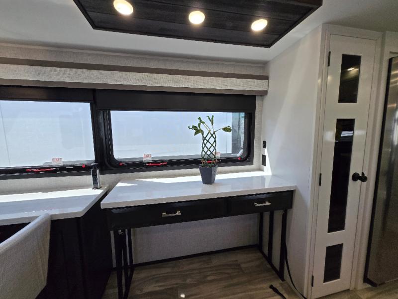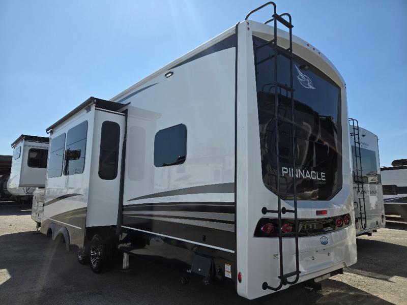 Triples slides, a desk/coffee bar, fireplace, and a huge master bath in front all indicate the kind of vacation you will experience in this Pinnacle Fifth Wheel! As you enter, a convenient half bath is located straight ahead. Slightly to your left, a nice seating area for gathering with family or friends to relax and watch TV, enjoy the fireplace while reading a book or watching a movie, and the dining table with chairs. The dinette slide also houses a 21 cu. ft. residential refrigerator and pantry. The rear kitchen features a u-shaped counter, all the appliances you need to cook like at home, even a pull-out butcher block space for chopping up your veggies. Back through and up the steps to your right in front, the master bedroom will make you feel like royalty with its king bed, plus luxurious full rear bath. A huge vanity with dual bath sinks will allow you both to get ready at the same time, plus there is a walk-in shower with a seat for added convenience. Speaking of walk-in, you will also love the spacious walk-in closet that includes washer/dryer prep.