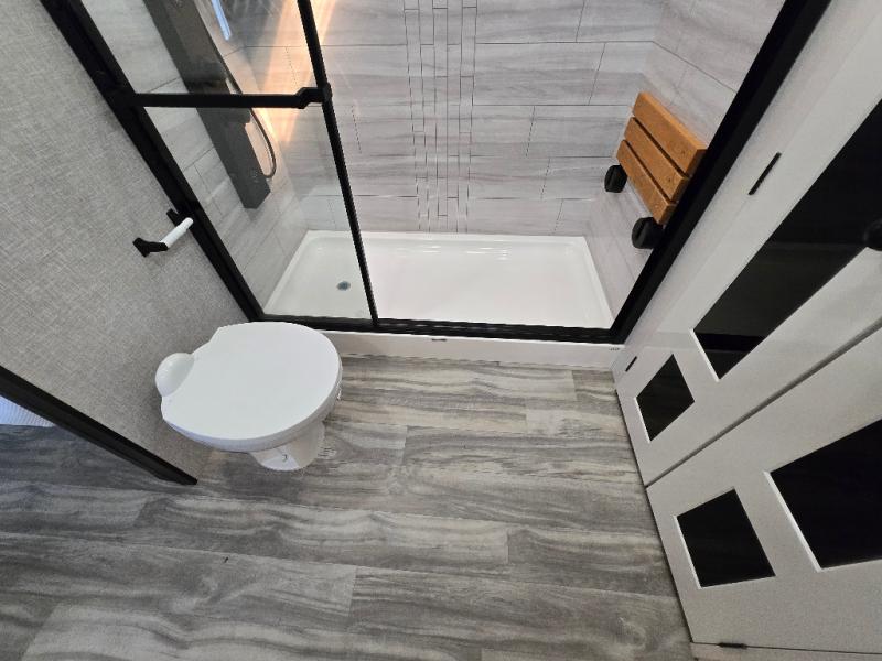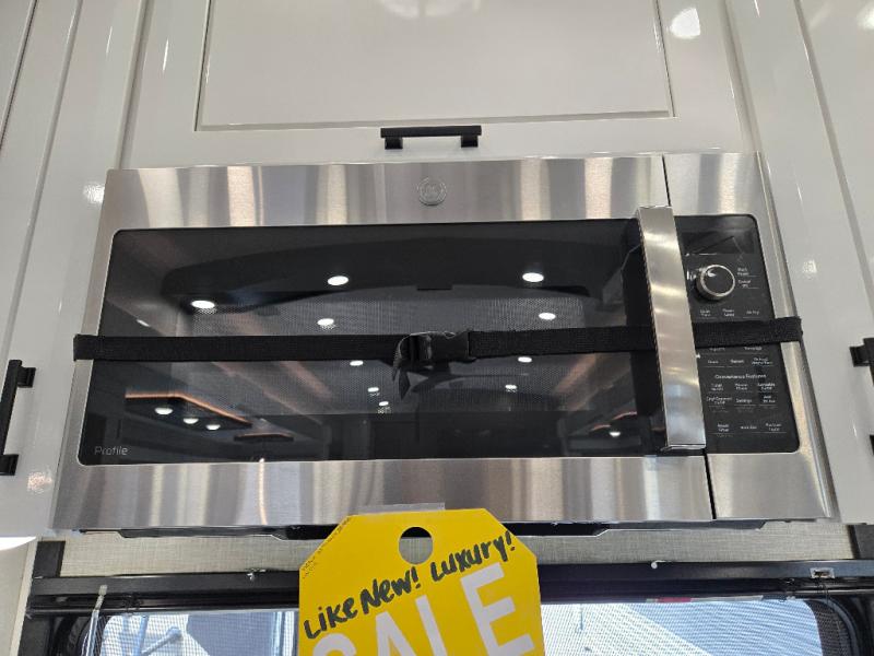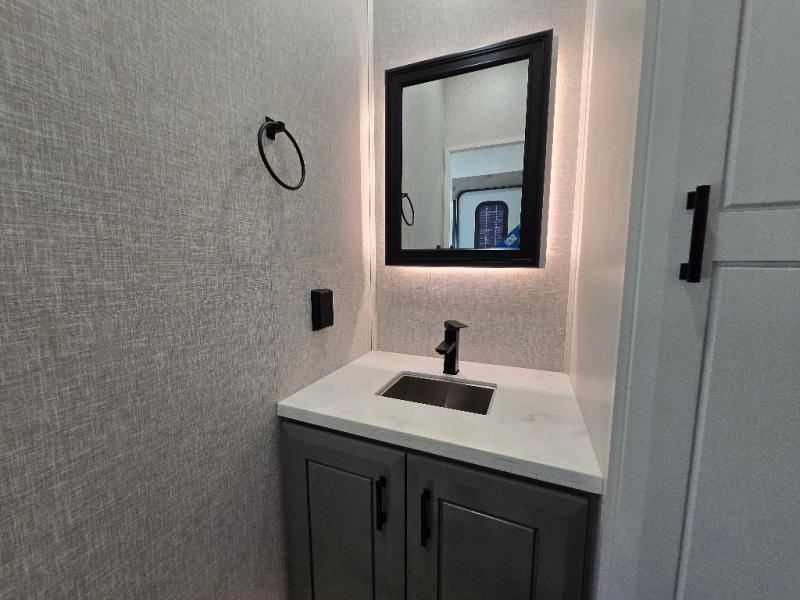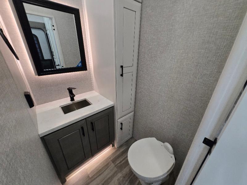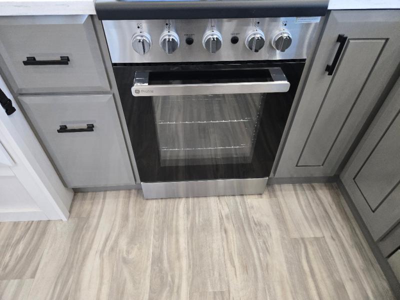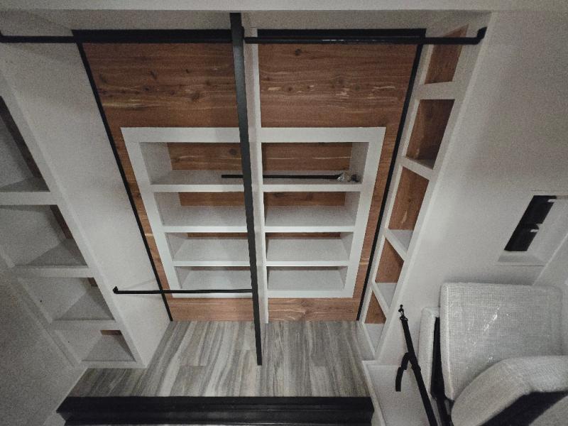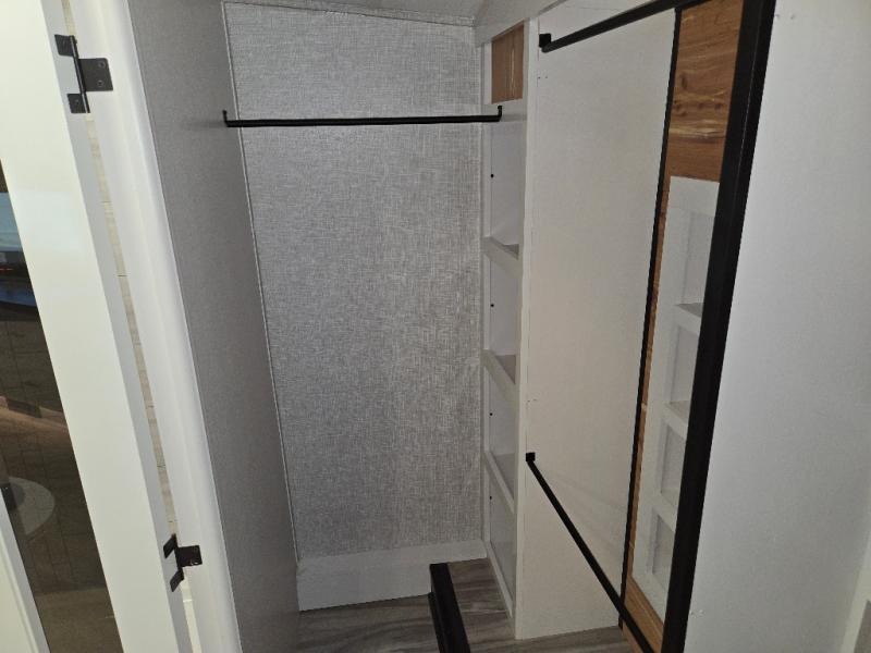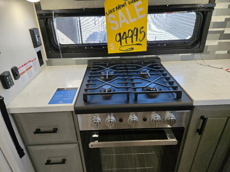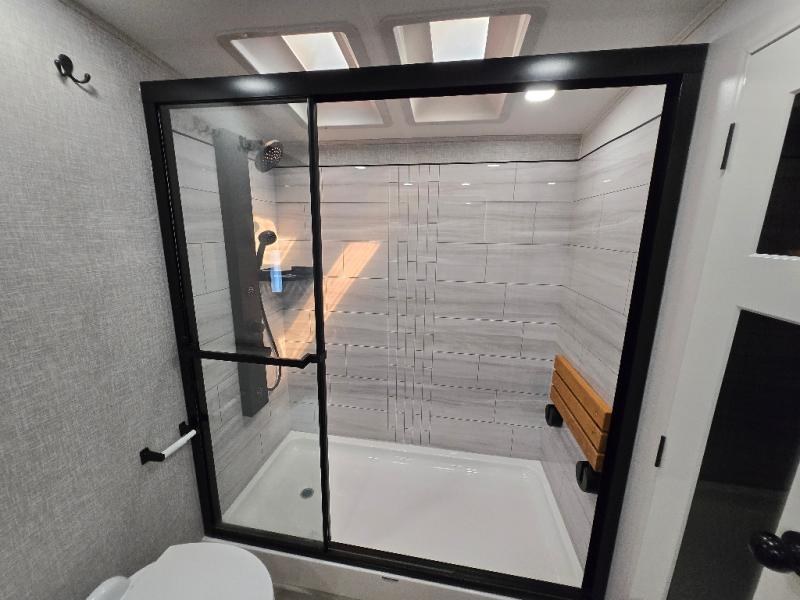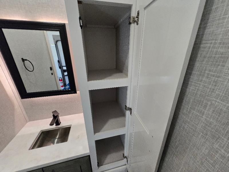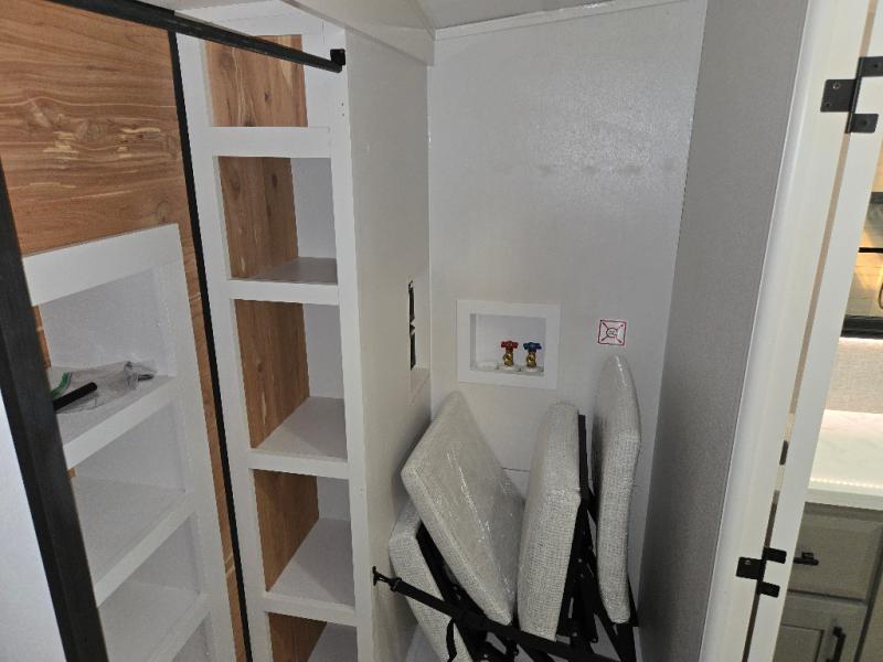 Triples slides, a desk/coffee bar, fireplace, and a huge master bath in front all indicate the kind of vacation you will experience in this Pinnacle Fifth Wheel! As you enter, a convenient half bath is located straight ahead. Slightly to your left, a nice seating area for gathering with family or friends to relax and watch TV, enjoy the fireplace while reading a book or watching a movie, and the dining table with chairs. The dinette slide also houses a 21 cu. ft. residential refrigerator and pantry. The rear kitchen features a u-shaped counter, all the appliances you need to cook like at home, even a pull-out butcher block space for chopping up your veggies. Back through and up the steps to your right in front, the master bedroom will make you feel like royalty with its king bed, plus luxurious full rear bath. A huge vanity with dual bath sinks will allow you both to get ready at the same time, plus there is a walk-in shower with a seat for added convenience. Speaking of walk-in, you will also love the spacious walk-in closet that includes washer/dryer prep.