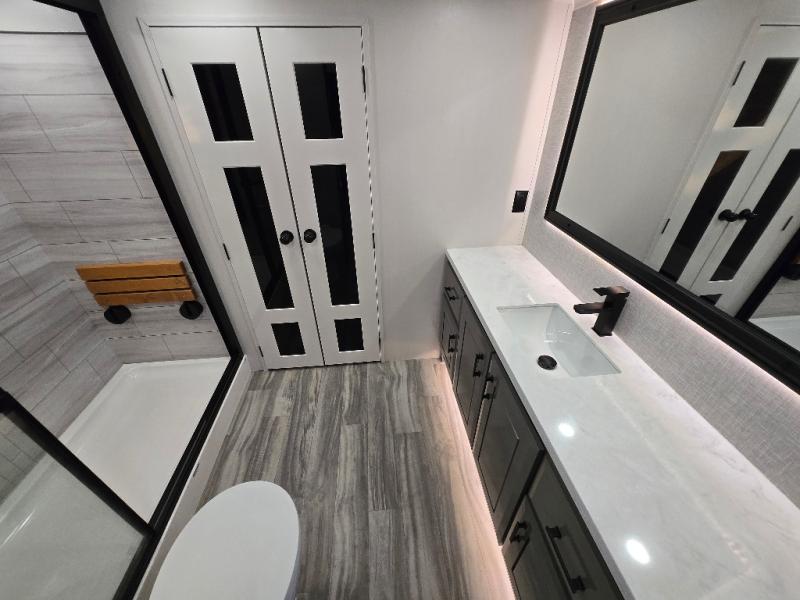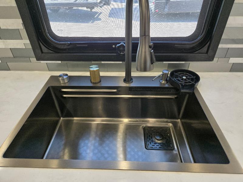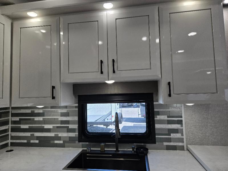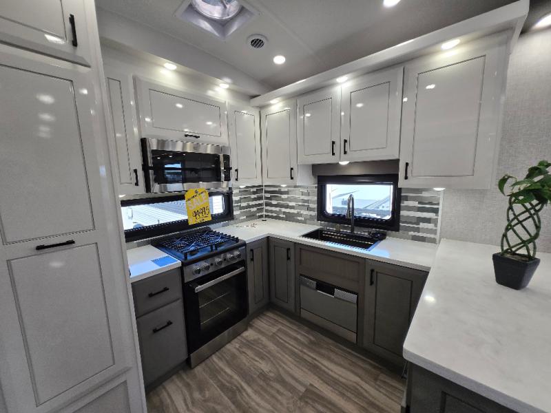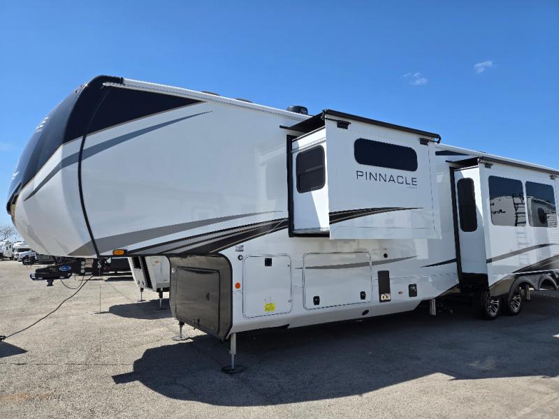 Each Pinnacle fifth wheel features Stronghold VBL lamination for the lightest, yet strongest construction in the RV industry. Add that to the Magnum Truss XL6 roof system and Climate Shield zero-degree tested weather protection and you'll be enjoying your fifth wheel for years to come. Some of the exterior conveniences you will appreciate are the Keyed-Alike lock system, the fully enclosed, universal docking center, and the 6-point hydraulic auto-leveling system for quick and easy set up. The 5 Star Handling Package will make towing a fifth wheel a walk in the park, and the two Whisper Quiet A/C units will keep you comfortable during the hot summer months. Inside, you'll enjoy the residential "Do it all" sink with pull-out kitchen faucet, glass rinse, and vegetable rinse, the handcrafted hardwood glazed cabinetry, the vinyl flooring throughout, plus many more comforts. There is even a central vacuum system, a wireless remote control system, USB ports throughout, plus many more conveniences to make each trip enjoyable.