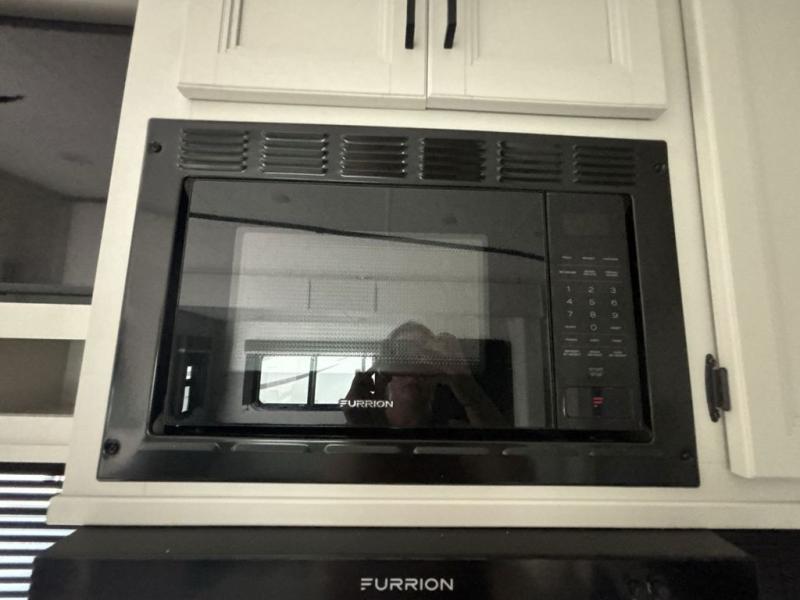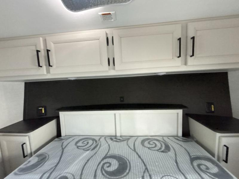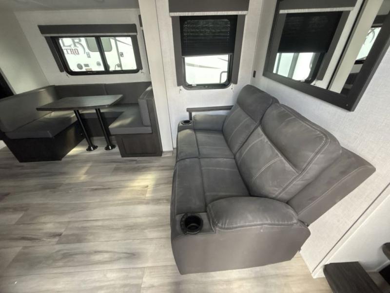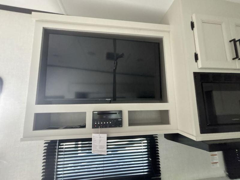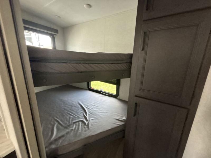 This fifth wheel with an open concept kitchen and living area is sure to feel just like home! You can relax with friends and family around the U-shaped dinette or on the tri-fold sleeper sofa, and there is a TV/radio in this space for entertainment. The rear private bunkhouse includes double-size triple bunks and a wardrobe for your guests' things, and you'll have your own wardrobes up front in the private bedroom. There is also a queen bed here and dual nightstands to keep your phone and glasses close by. And don't overlook the exterior with its 20' electric awning and LCI Solid Steps!
