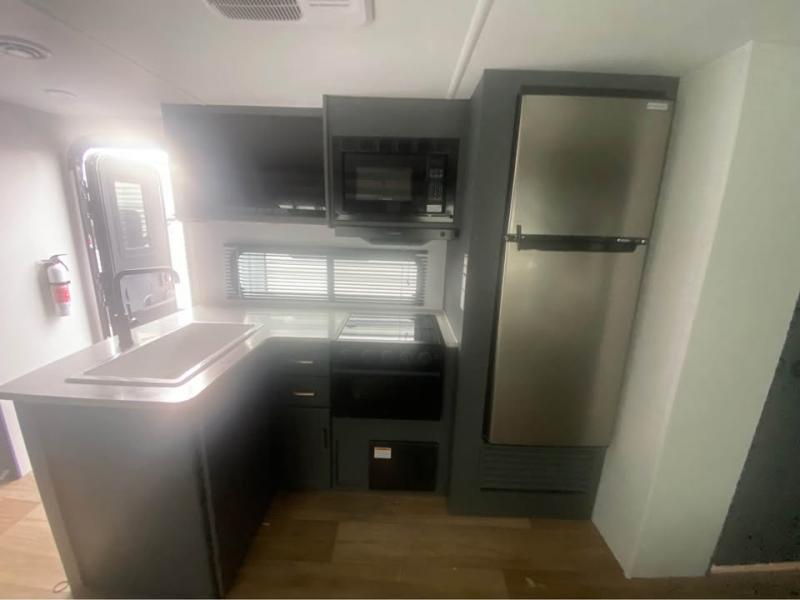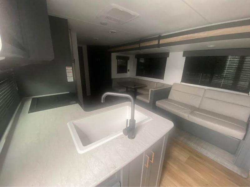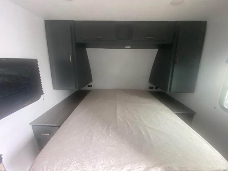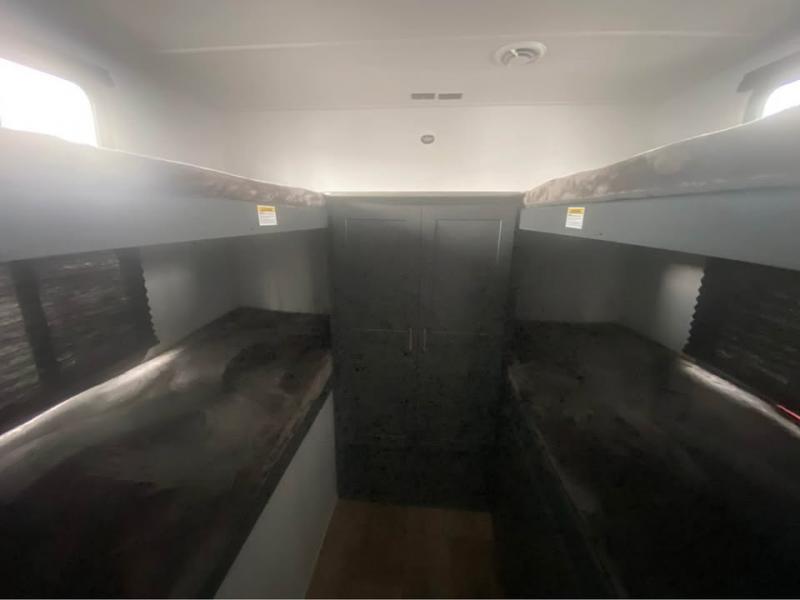 You're going to love this travel trailer with a front private bedroom for you and a rear private bunkhouse for your guests. There are four bunk beds, plus a wardrobe and additional storage to keep this space tidy. And the front bedroom includes a queen bed, dual wardrobes and dual nightstands to keep your phone and books on. Everyone can meet in the main living area that is made spacious by the large slide out. When your crew has worked up an appetite, you can make lunch on the two burner range or use the microwave oven. There is also a large 12V refrigerator to keep cold drinks stocked. Outside, you'll appreciate multiple pass-through storage compartments and a power awning to provide shade!