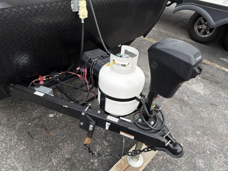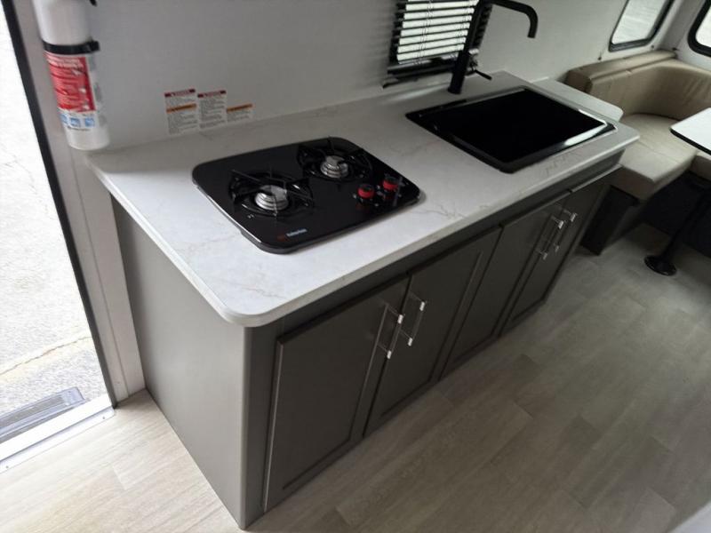 Simple and lightweight; this travel trailer is the unit you've been searching for! Once you arrive at your destination, unload the pass-thru storage, then head inside to start lunch in the full kitchen. Here, you'll find a microwave oven, two burner cooktop to cook meals on, and an 8 cu. ft. refrigerator for perishables. The rear U-shaped dinette can serve as dining and sleeping space for your guests, while you take the front corner queen bed. Don't let this travel trailer slip away!