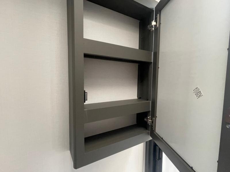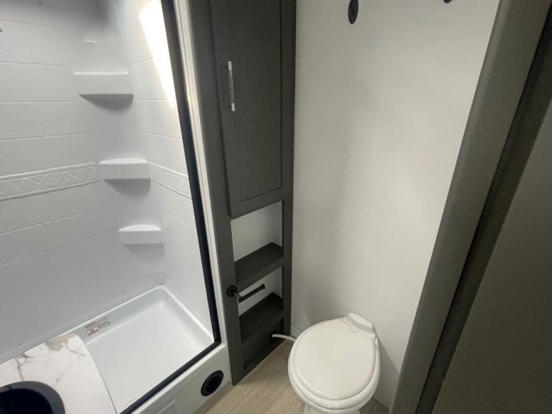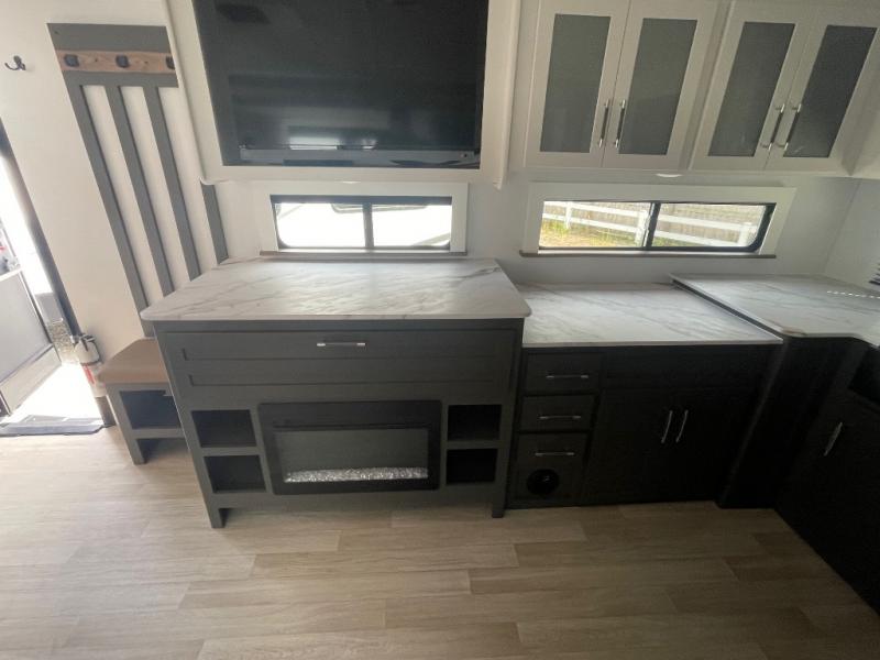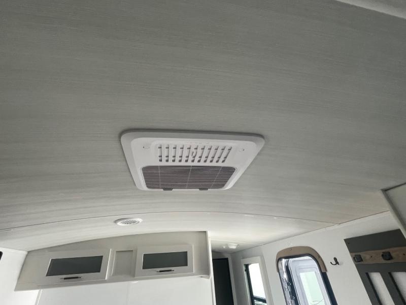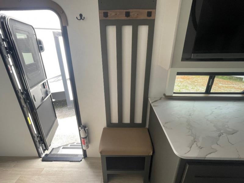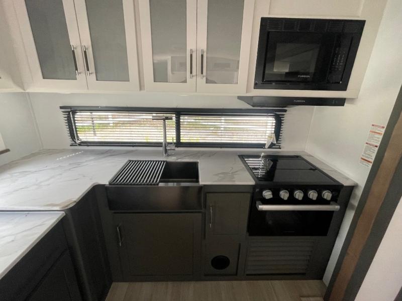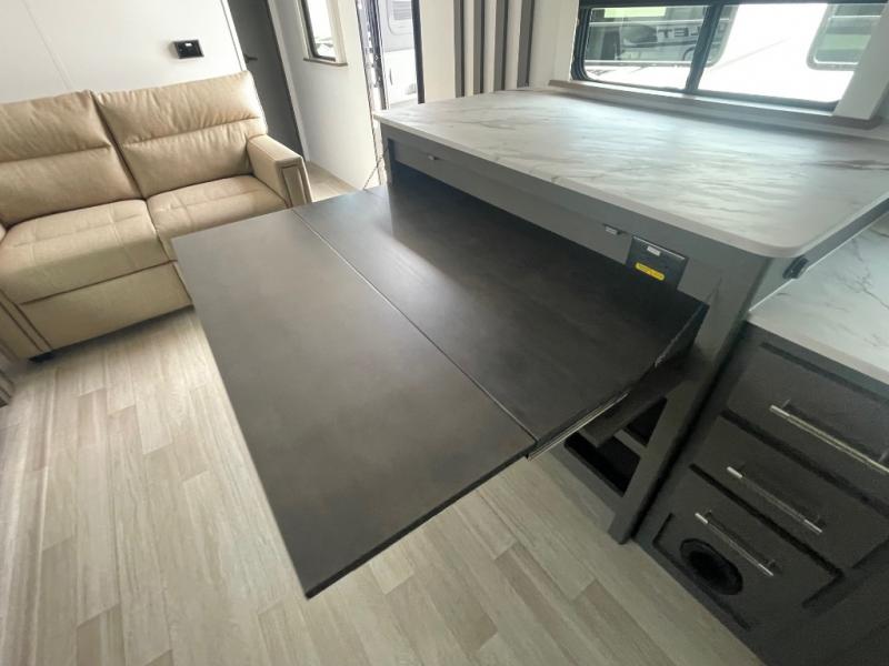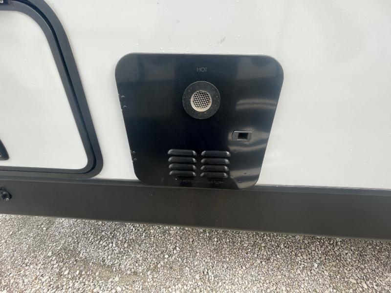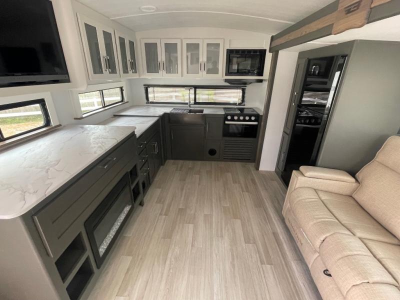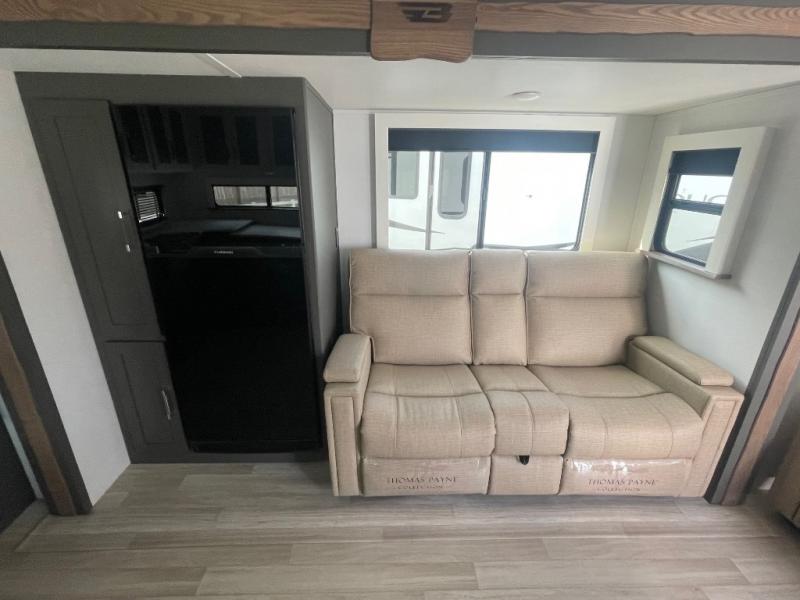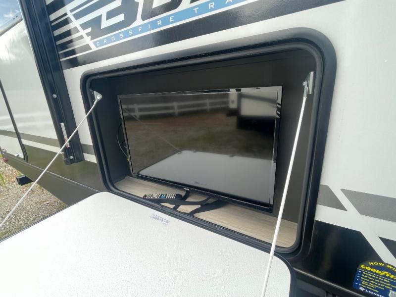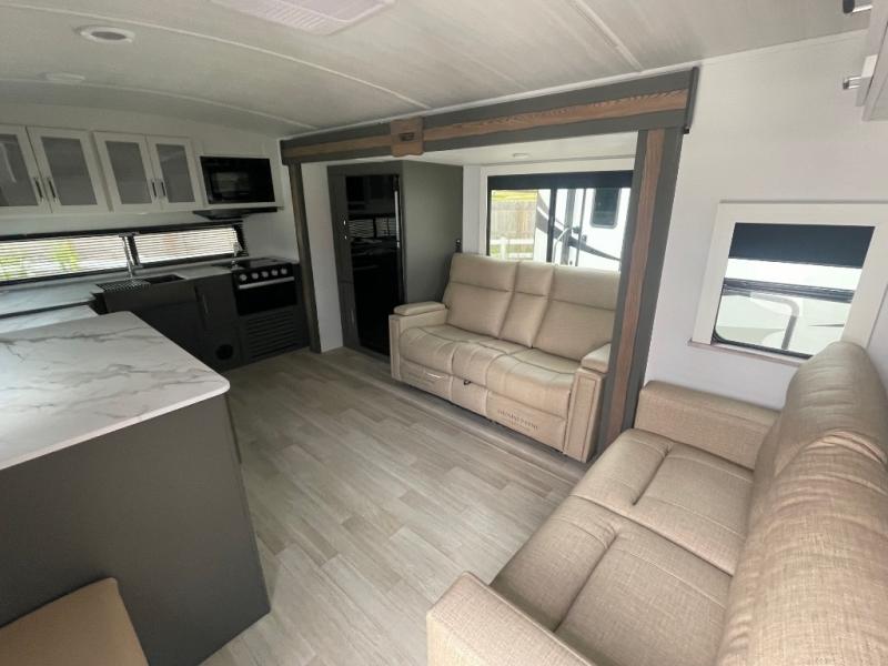 You'll enjoy the added space in this travel trailer thanks to the large slide out that houses the theater seating, pantry, and 12V refrigerator. And the 12V TV is in direct view so you can watch movies in the evenings. If you have guests staying over, they can sleep on the tri-fold sofa, while you take the queen bed in the front private bedroom. A rear kitchen includes extended counter space to prep meals, or you can use the outdoor kitchen with a mini fridge and griddle. The pull-out dinette table provides a place to dine together, or you can sit outdoors under the 19' awning. There is even an exterior TV here for added convenience!
