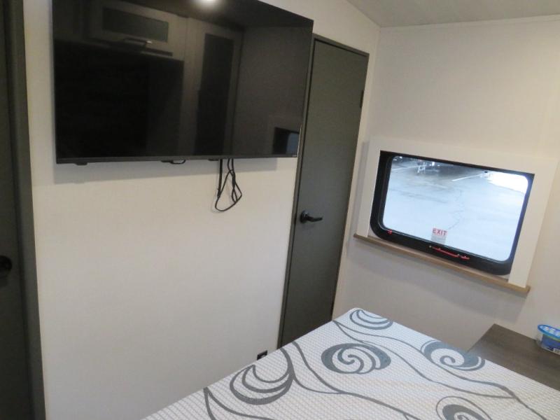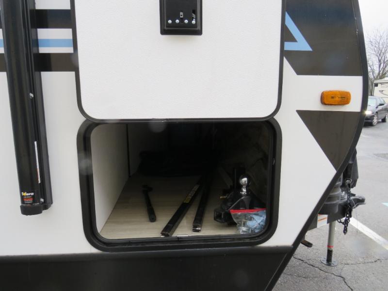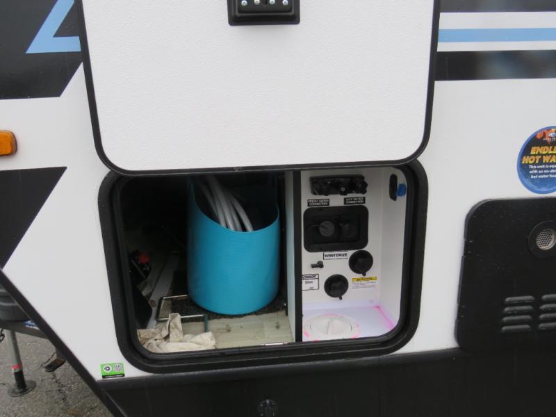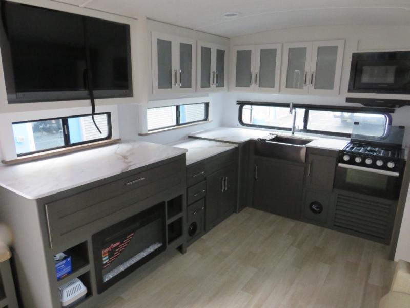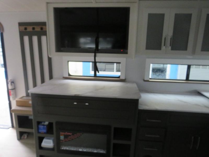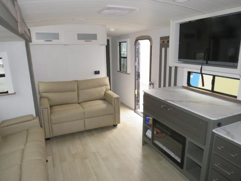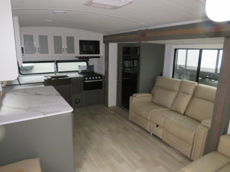 You'll enjoy the added space in this travel trailer thanks to the large slide out that houses the theater seating, pantry, and 12V refrigerator. And the 12V TV is in direct view so you can watch movies in the evenings. If you have guests staying over, they can sleep on the tri-fold sofa, while you take the queen bed in the front private bedroom. A rear kitchen includes extended counter space to prep meals, or you can use the outdoor kitchen with a mini fridge and griddle. The pull-out dinette table provides a place to dine together, or you can sit outdoors under the 19' awning. There is even an exterior TV here for added convenience!