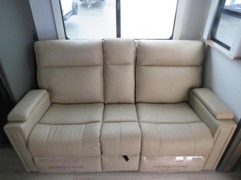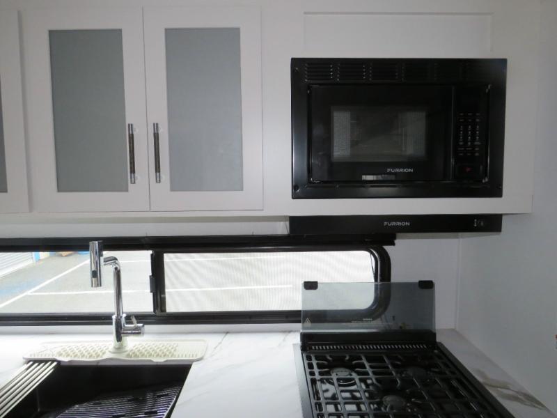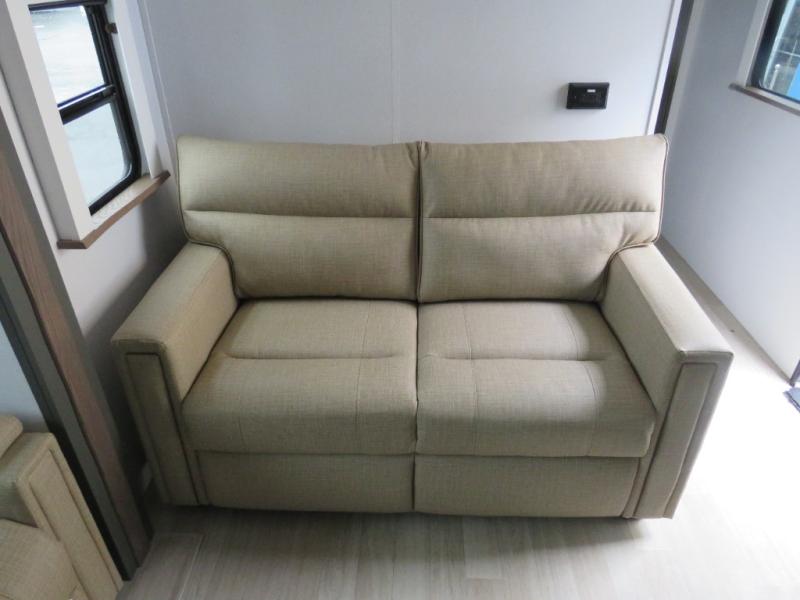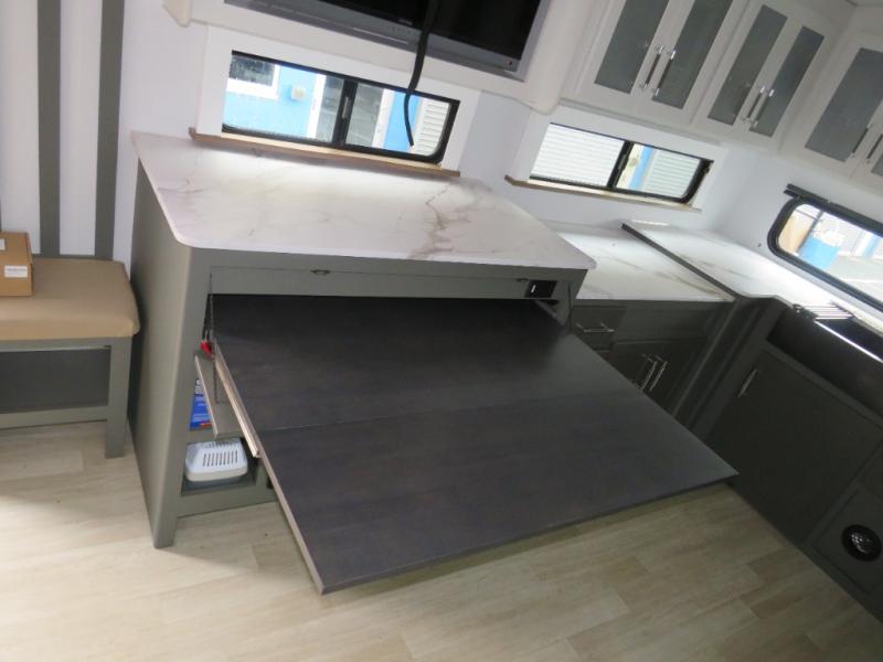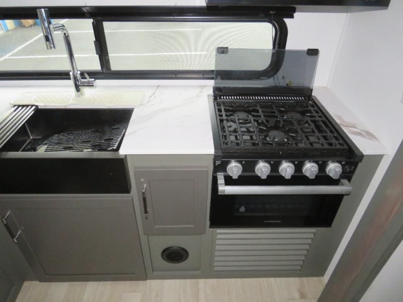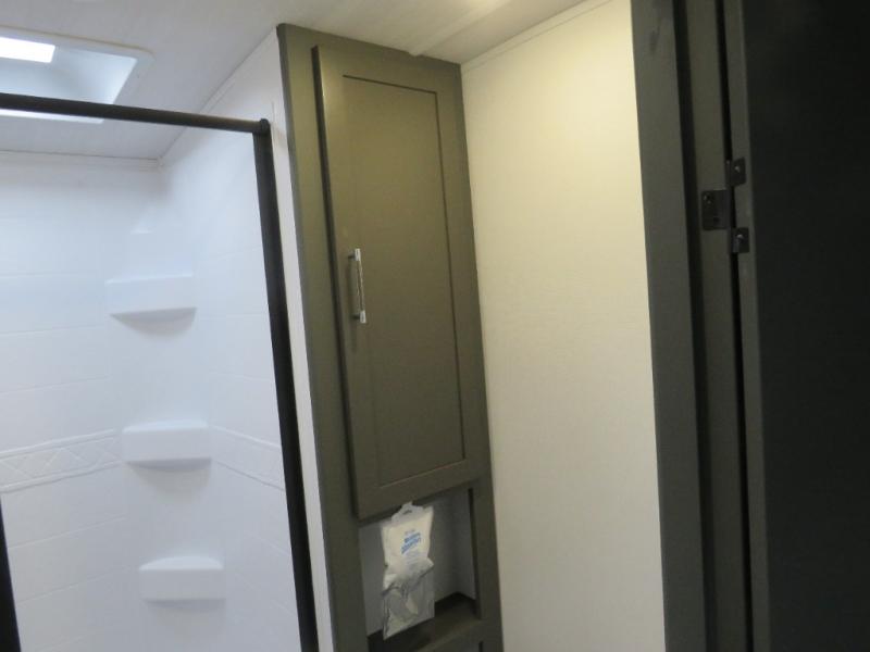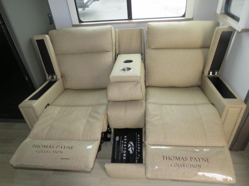You'll enjoy the added space in this travel trailer thanks to the large slide out that houses the theater seating, pantry, and 12V refrigerator. And the 12V TV is in direct view so you can watch movies in the evenings. If you have guests staying over, they can sleep on the tri-fold sofa, while you take the queen bed in the front private bedroom. A rear kitchen includes extended counter space to prep meals, or you can use the outdoor kitchen with a mini fridge and griddle. The pull-out dinette table provides a place to dine together, or you can sit outdoors under the 19' awning. There is even an exterior TV here for added convenience!