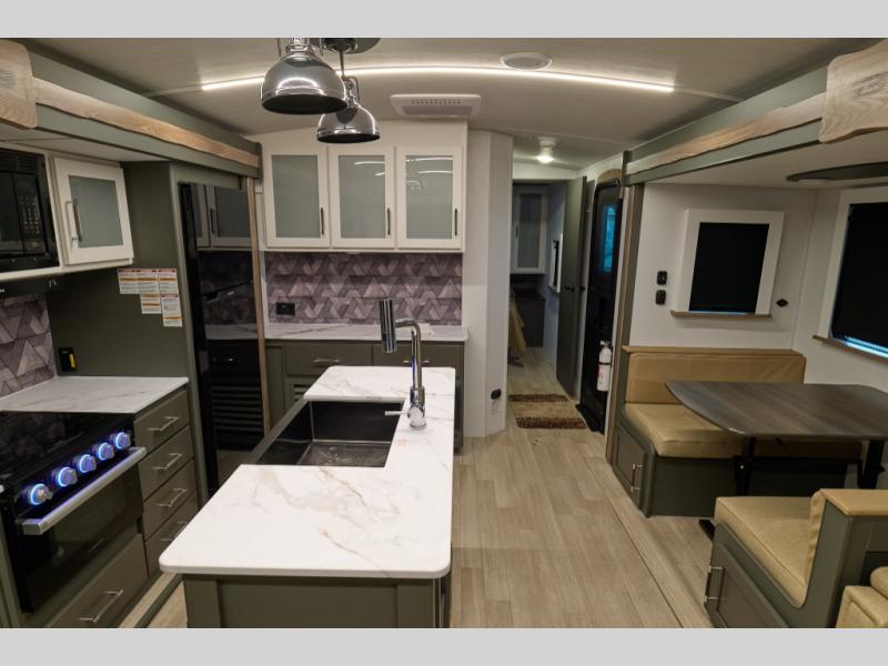 Weekend trips to the campground are made easy in this travel trailer! There are dual opposing slides in the combined kitchen and living area to provide you with ample space to stretch out. A kitchen island will come in handy when prepping meals, plus you'll have all the appliances needed to cook them. You will find comfortable seating on the rear tri-fold sofa sleeper, Do-More dinette table, and theater seats across from the entertainment center and fireplace. When you're ready to call it a night, the front private bedroom with a queen bed will be calling your name, and the full bath onboard will let you freshen up each day!