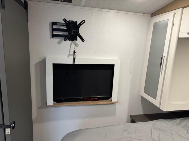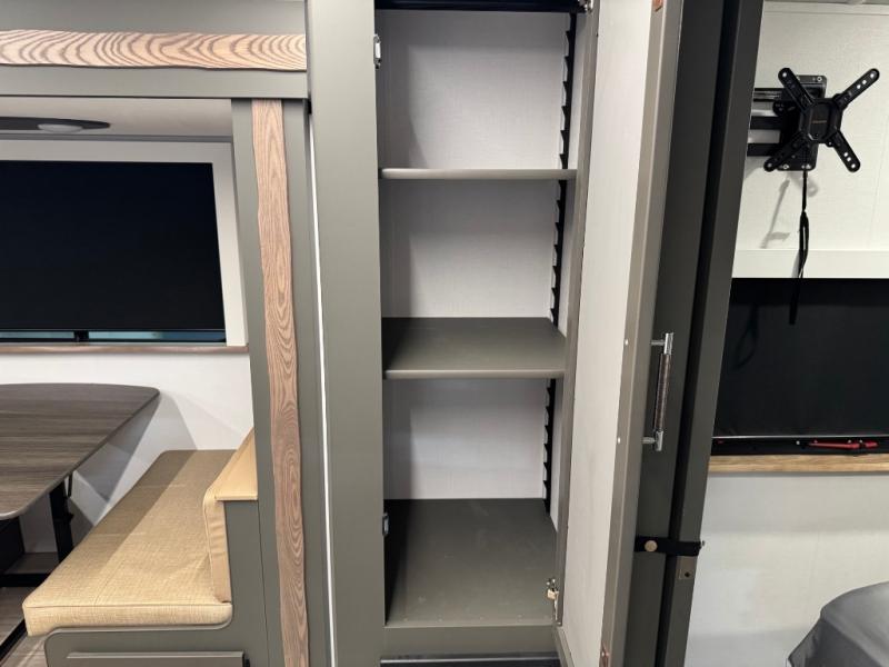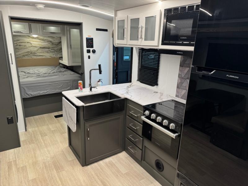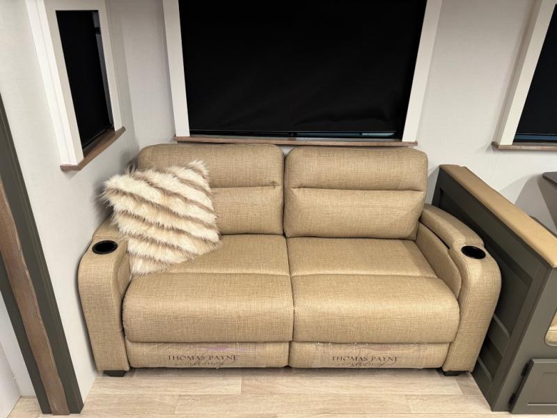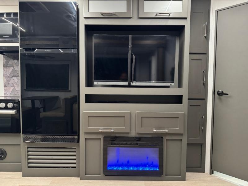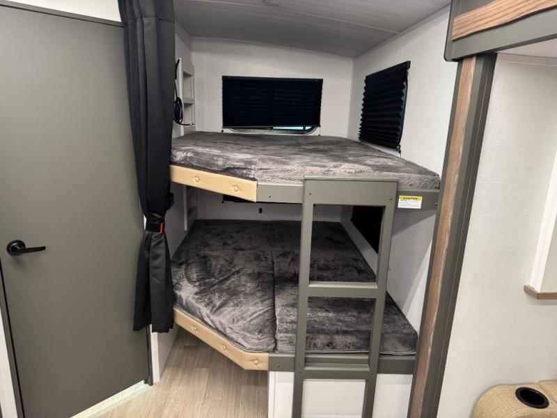 The whole gang will love camping in this travel trailer with double-size bunks, an outdoor kitchen, and a front private bedroom for the owners. You will find plenty of storage throughout, including storage under the flip-up bunk, a kitchen pantry, and an exterior pass-thru storage. Everyone can meet in the main living area to relax on the tri-fold sofa or play a game at the Do-More dinette table. There is even a fireplace across from the sofa for a cozy evening indoors. The chef of your group will have a fully-equipped indoor kitchen plus an outdoor kitchen to cook meals each day. And since there are dual entry doors, you can enter in through the kitchen or full bathroom for convenience!