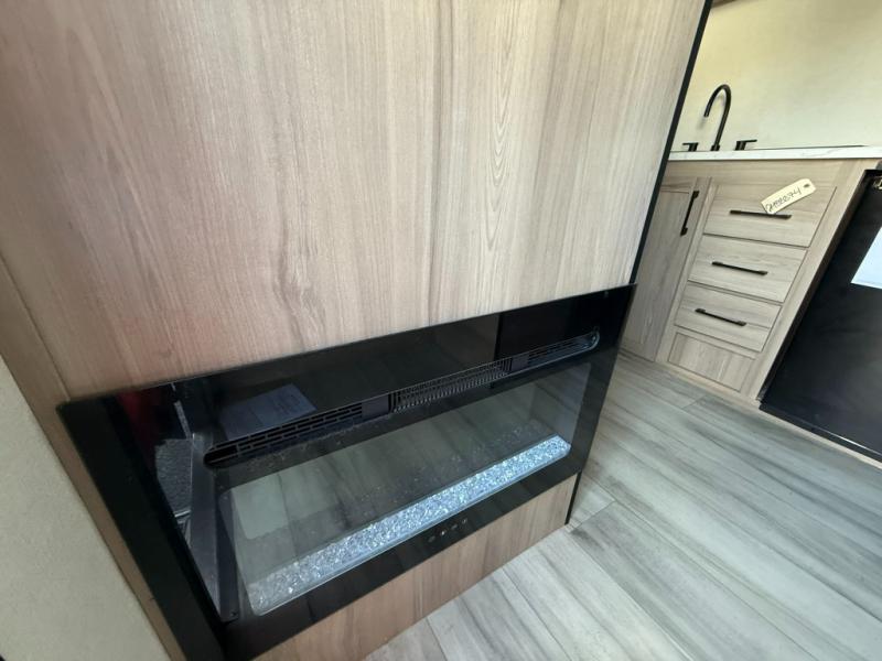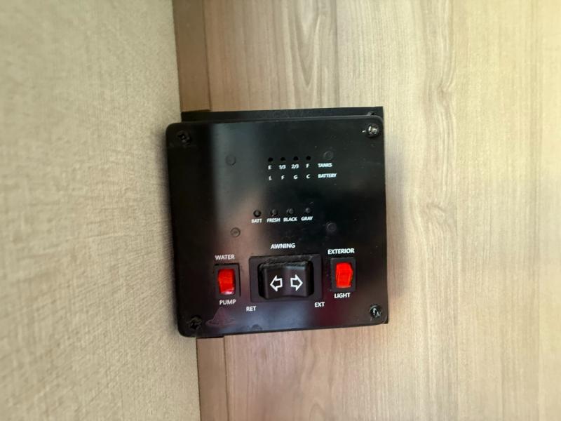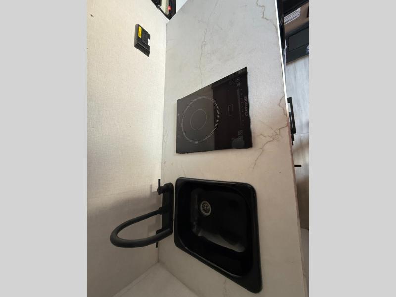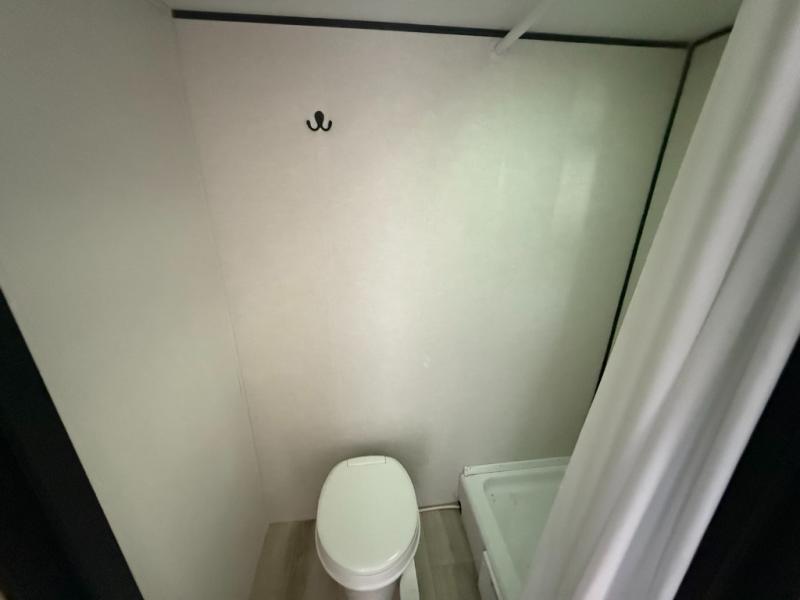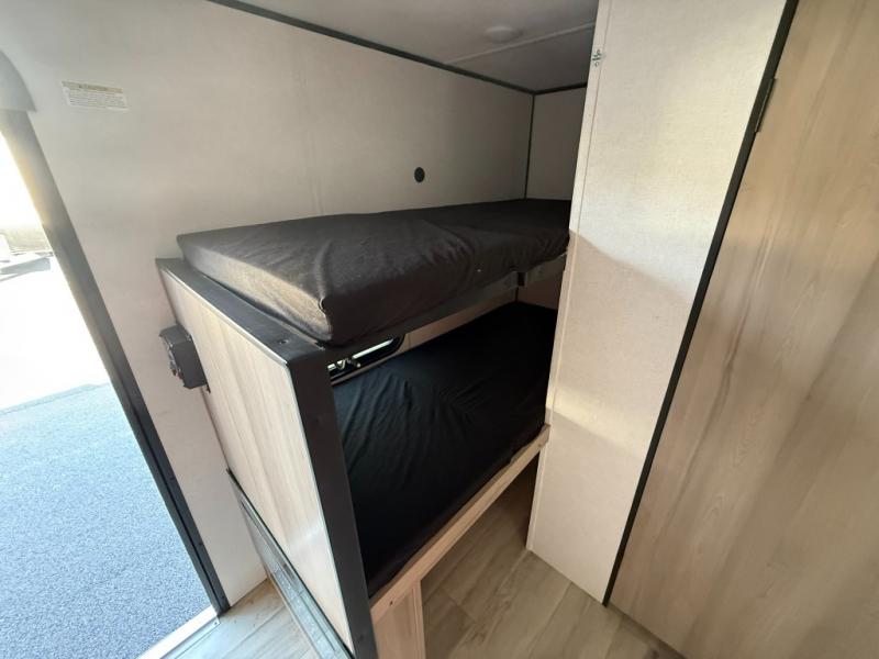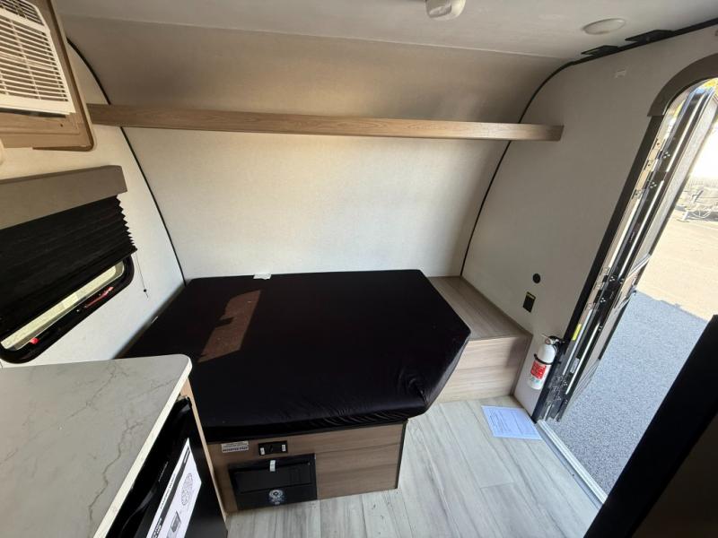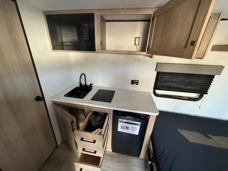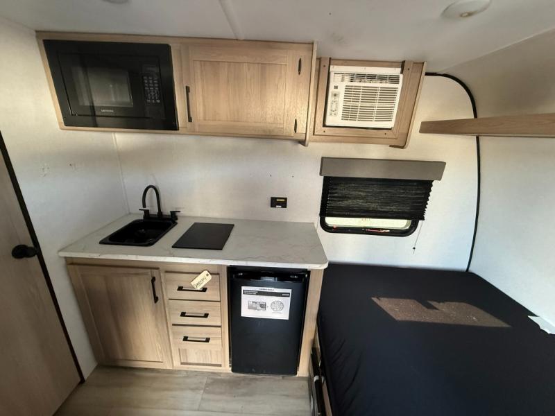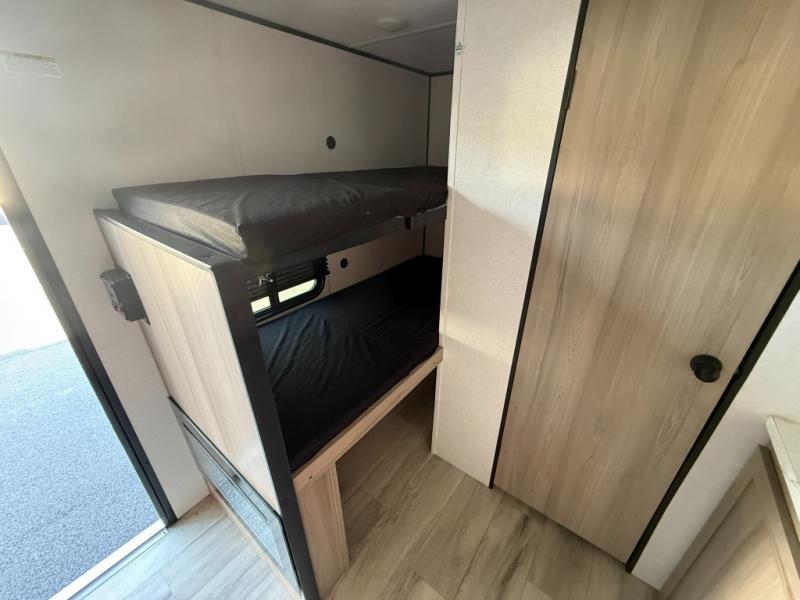 This compact travel trailer lets you camp in comfort at the location of your choice! Since there is a front queen bed, you won't have to sleep on an air mattress, and the shelf above the bed will be perfect for your belongings. Bunk beds provide additional sleeping space for your guests or little ones, and the private bath includes a shower and toilet so you won't have to use the camp's facilities at night. This model includes an induction cooktop and microwave oven to cook meals, plus a 3.2 cu. ft. 110V refrigerator for food storage. And the 8' power awning outdoors provides a place for you to sit in your camp chairs after dinner!