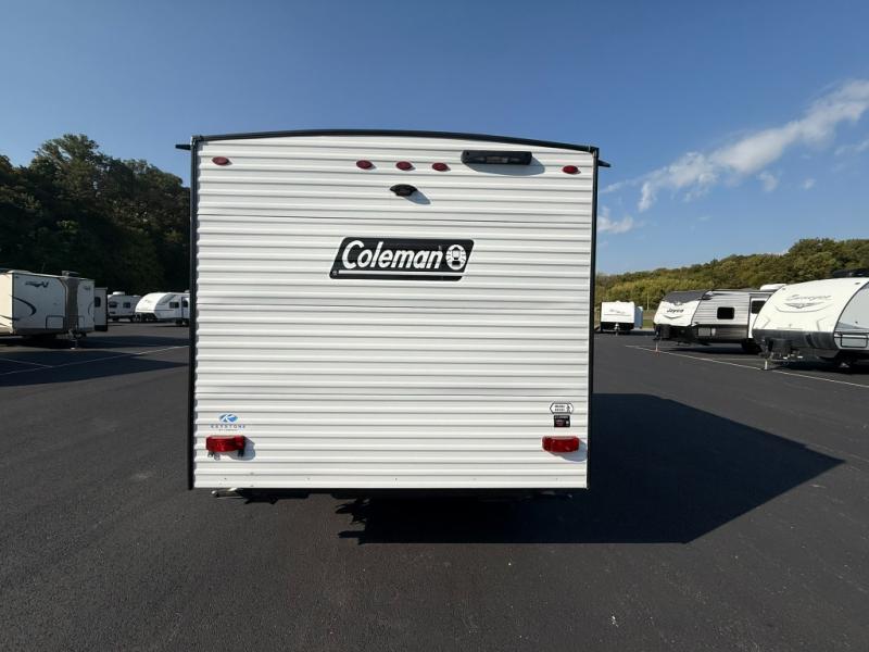 With any Coleman travel trailer, you will experience Keystone's quality throughout, plus enjoy lightweight towing to the campground or RV park. There is a walkable roof, tinted safety glass windows, and a power awning outdoors for an inviting space to relax. The friction hinge entry door is another convenience you'll appreciate, and there is Furrion backup camera prep if you want the option to make parking easier. Inside, you'll find blackout night shades, a 6' 6" ceiling height, bedside outlets, and many more comforts.