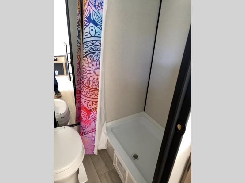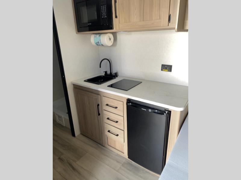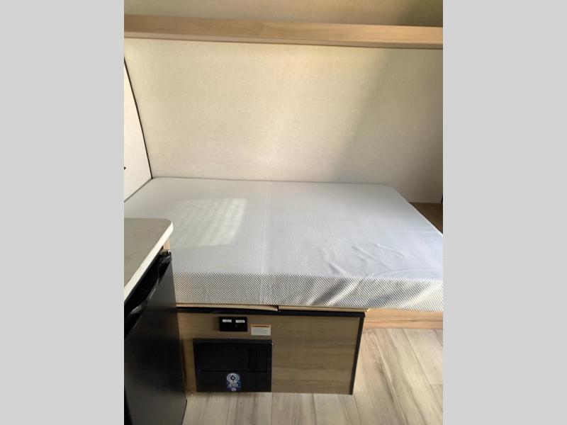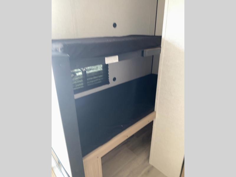 This compact travel trailer lets you camp in comfort at the location of your choice! Since there is a front queen bed, you won't have to sleep on an air mattress, and the shelf above the bed will be perfect for your belongings. Bunk beds provide additional sleeping space for your guests or little ones, and the private bath includes a shower and toilet so you won't have to use the camp's facilities at night. This model includes an induction cooktop and microwave oven to cook meals, plus a 3.2 cu. ft. 110V refrigerator for food storage. And the 8' power awning outdoors provides a place for you to sit in your camp chairs after dinner!