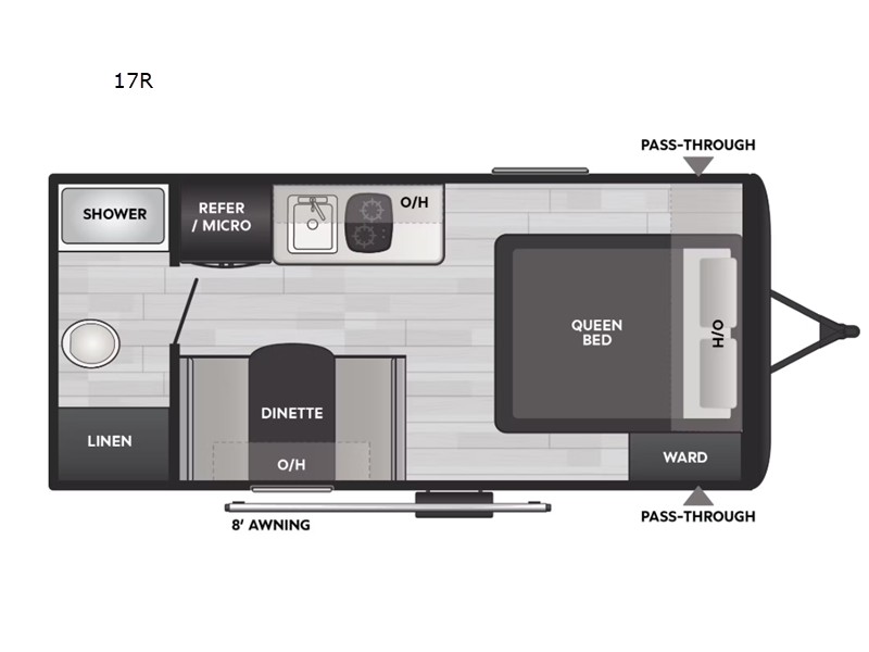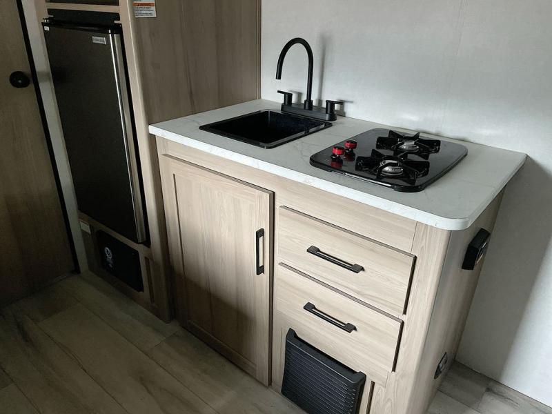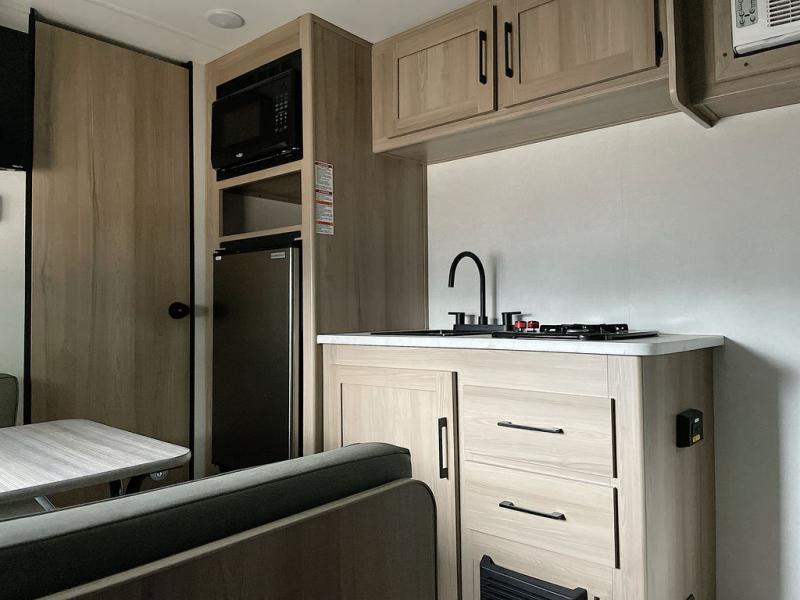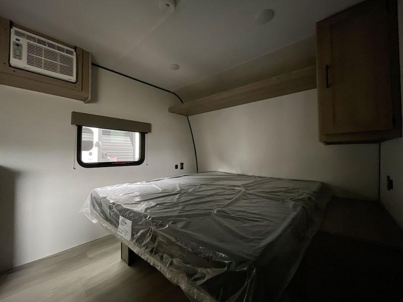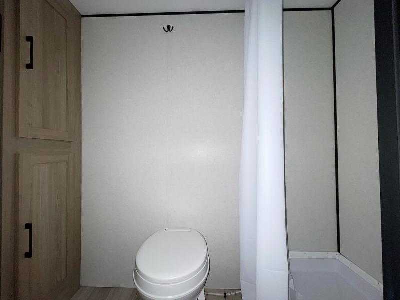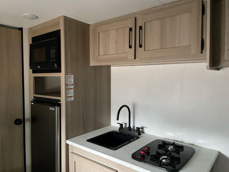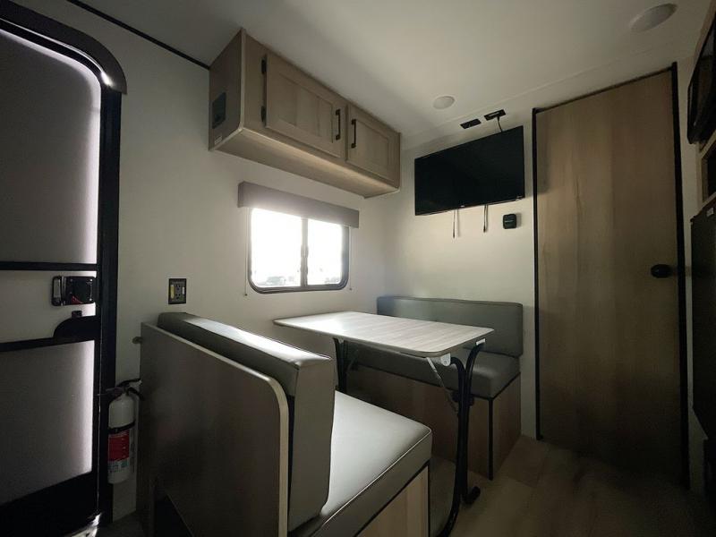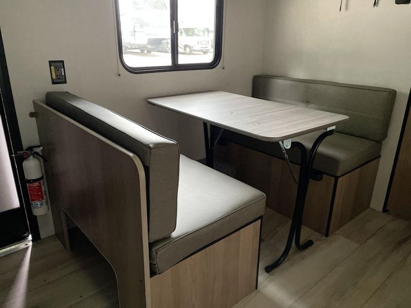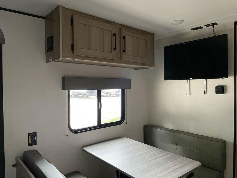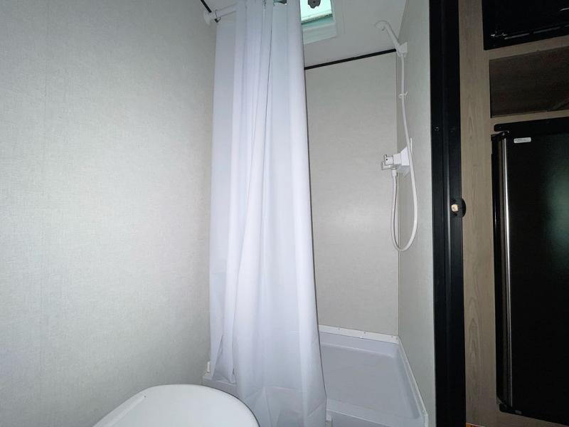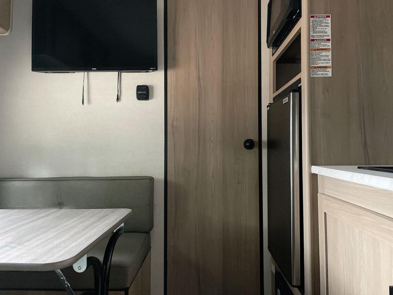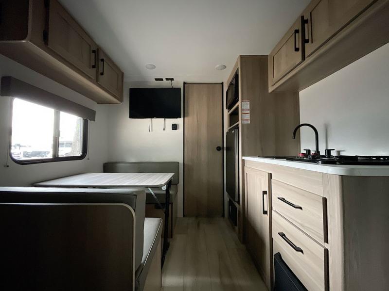 After making dinner on the two burner cooktop or microwave, you can dine at the booth dinette or outside under the 8' power awning if you brought along your camping chairs. Either way you will be comfortable and the dinette can even be converted to sleep one person if needed. After playing outdoors all day, everyone can return to get cleaned up in the full rear bath including a shower. There is even a linen closet and space for some clothes that hang. You may then fall asleep on the queen bed up front or the dinette once converted so you can start enjoying the outdoors again the next day.