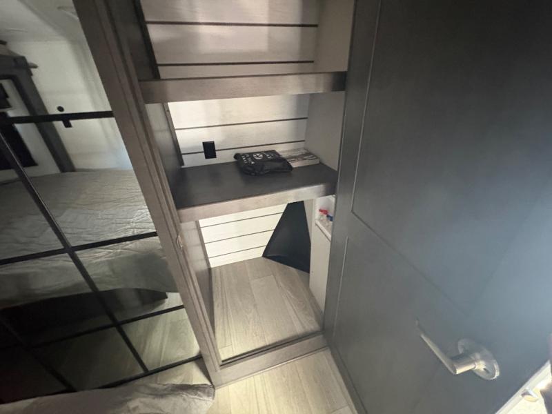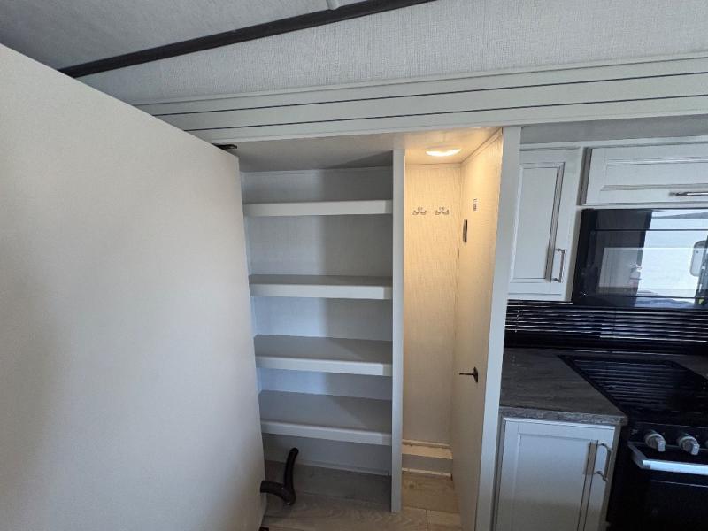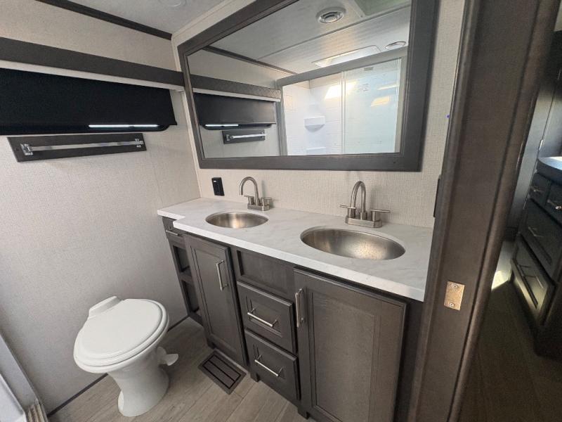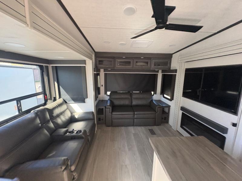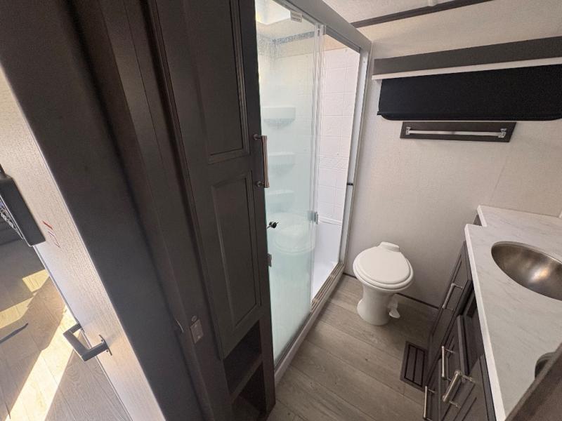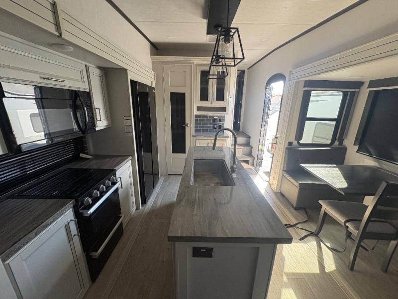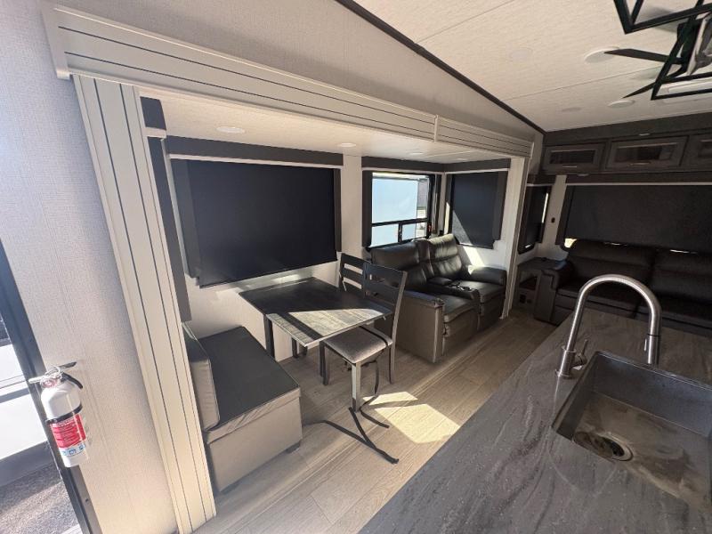 The dual-sink vanity in the full bathroom on this Cougar fifth wheel is what will make your morning routine feel just the same on the road as it does at home! You'll also sleep just as well on the queen-size bed in the front private bedroom, and there is under-bed storage, a full-height wardrobe, and a dresser with hidden storage for all of your personal belongings. As you spend time in the main living area, you'll appreciate having extra space thanks to the set of opposing slides, and the kitchen island will be easy to work around. You'll be able to relax on the tri-fold sleeper sofa and theater seating while you watch the LED HDTV with an pivoting entertainment door and hidden pantry. There is also a booth dinette with storage drawers, convenient shoe storage right as you enter the unit, and an exterior unobstructed pass-thru storage so nothing gets left behind.