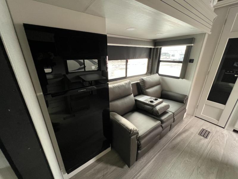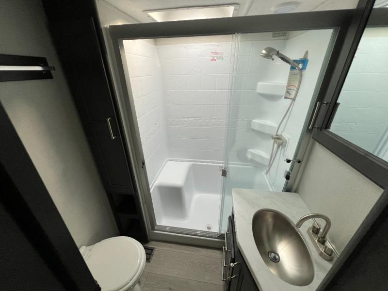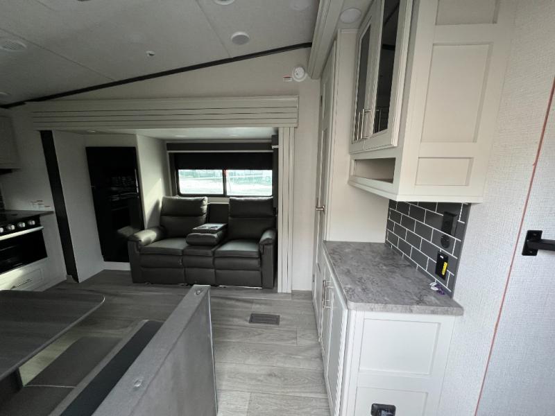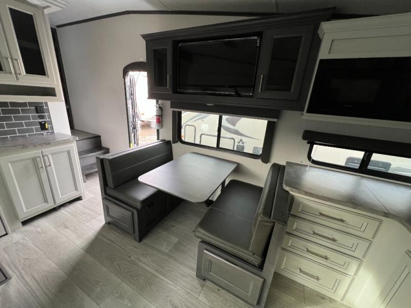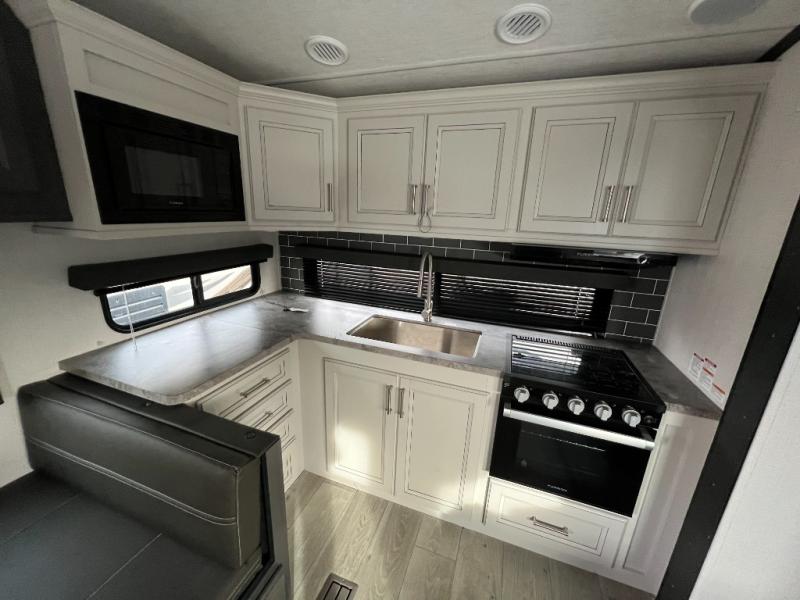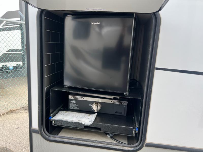 If you are looking for a fifth wheel that sleeps four to six with inside and outside cooking then check this unit out! This unit offers a short, mid-living layout with a bedroom wardrobe slide and combined 12 volt refrigerator and 68" tri-fold sofa sleeper slide for added floorspace to move about. Up front, you will enjoy a private bedroom with a queen bed and bedside wardrobe/nightstands as well as a larger wardrobe that slides out along the curbside wall. A complete bath provides a large shower, toilet and sink, plus linen storage which you are sure to appreciate as you travel. There are plenty of options for this unit making it easy to customize to your use and style. The theater seating and free standing dinette options can be selected in place of the sleeper sofa and booth dinette if you prefer. If you enjoy spending time outdoors, imagine making breakfast for your friends and family using the outside griddle. There is also a 16' awning to create even more living space to enjoy, and the unobstructed pass-through storage compartment can easily house all of your outdoor camping gear like lawn chairs and yard games.