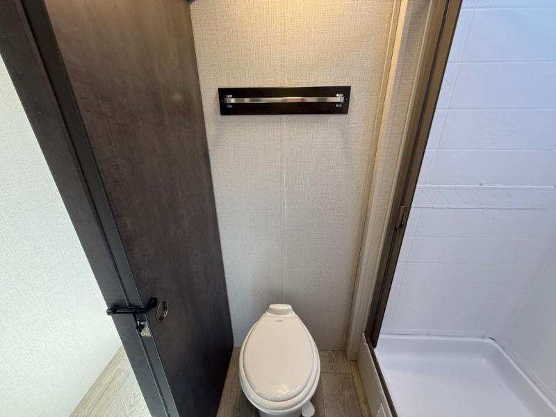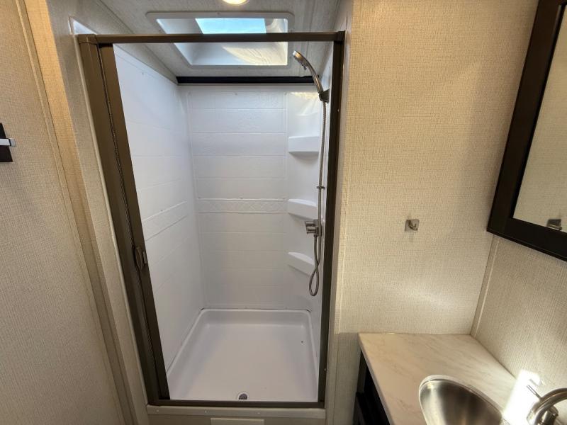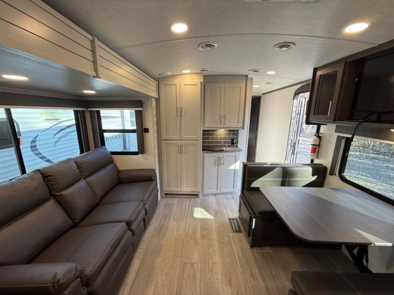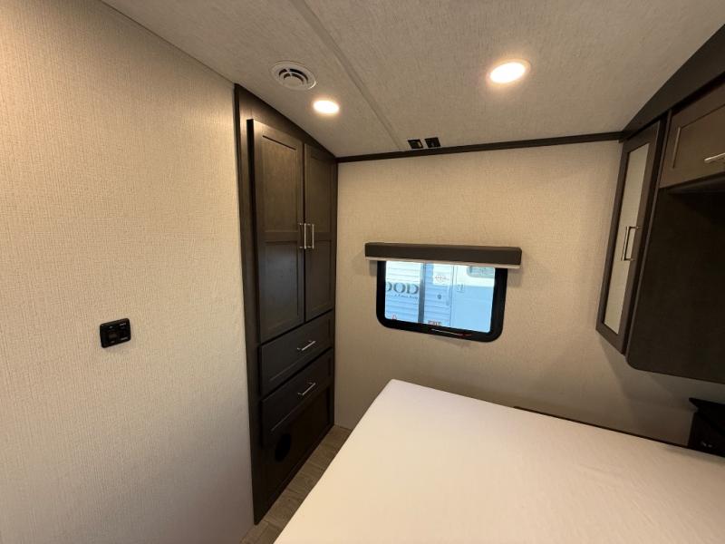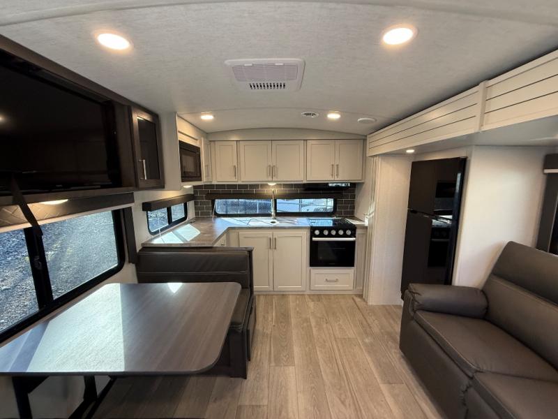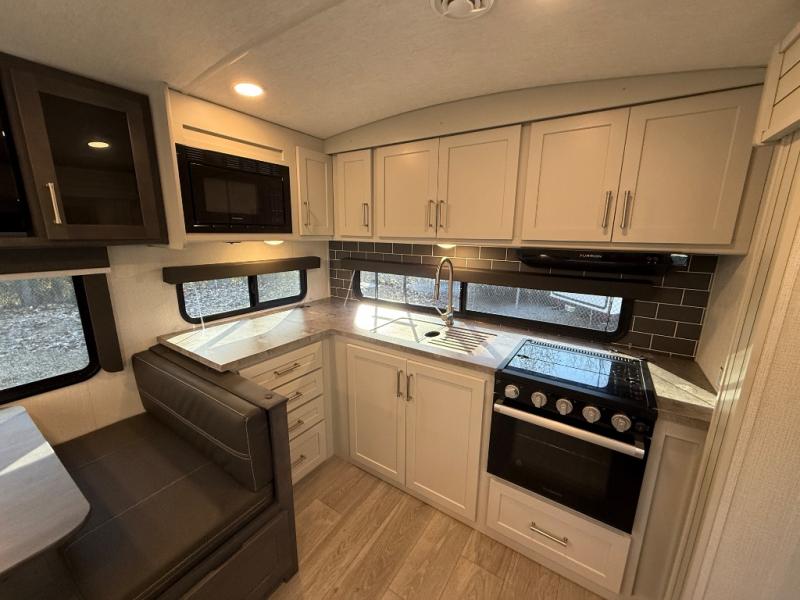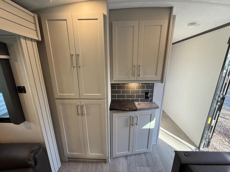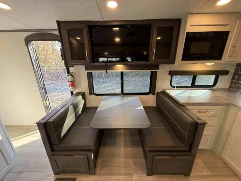 If you're ready for fun summers at the lake, make your adventures complete with this travel trailer in tow. The rear kitchen includes ample counter space to prep burgers, and you can take your preparations outside to cook on the outdoor kitchen! If the weather is nice, you might just want to eat outside too under the 18' power awning, or dine inside at the booth dinette. There is also a tri-fold sleeper sofa within the large slide out and an LED HDTV for movie nights. You'll find plenty of storage throughout, including a kitchen pantry, overhead cabinets, plus dual bedroom wardrobes on either side of the king bed!