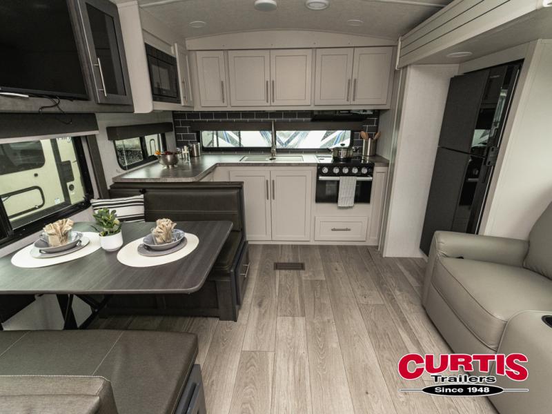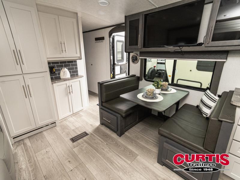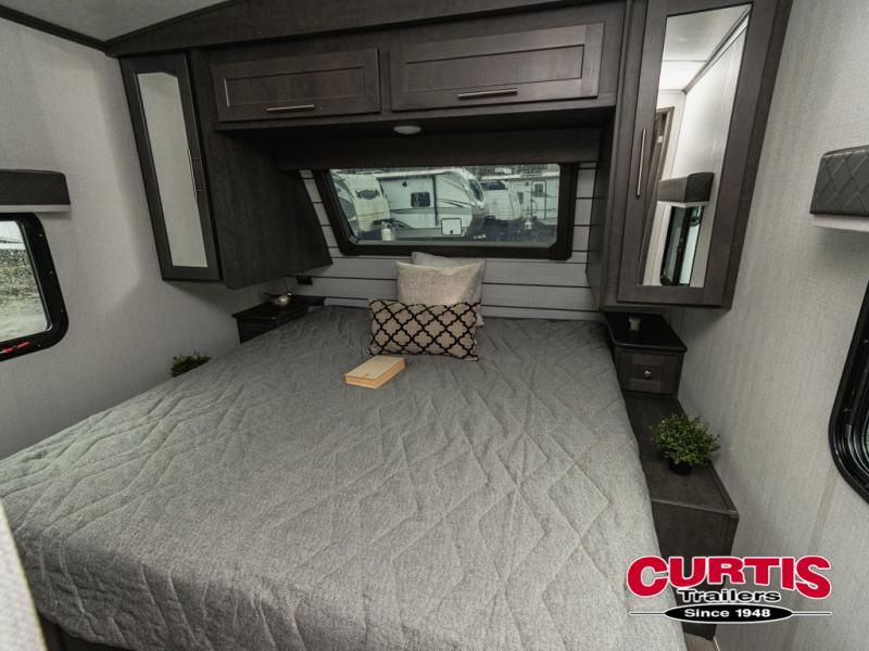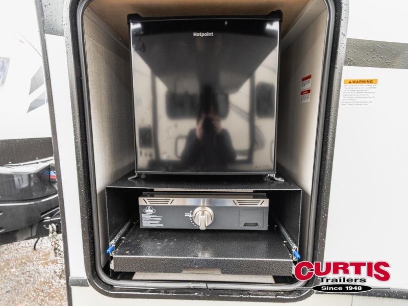 If you're ready for fun summers at the lake, make your adventures complete with this travel trailer in tow. The rear kitchen includes ample counter space to prep burgers, and you can take your preparations outside to cook on the outdoor kitchen! If the weather is nice, you might just want to eat outside too under the 18' power awning, or dine inside at the booth dinette. There is also a tri-fold sleeper sofa within the large slide out and an LED HDTV for movie nights. You'll find plenty of storage throughout, including a kitchen pantry, overhead cabinets, plus dual bedroom wardrobes on either side of the king bed!