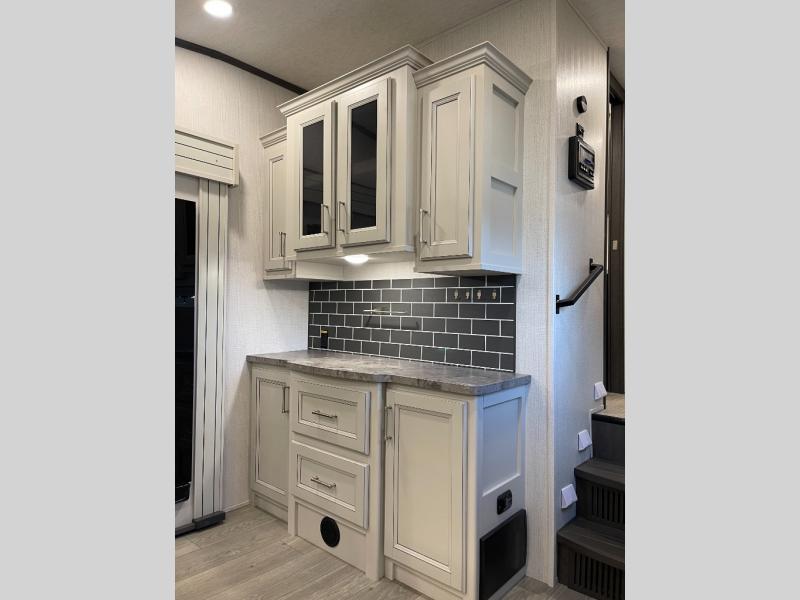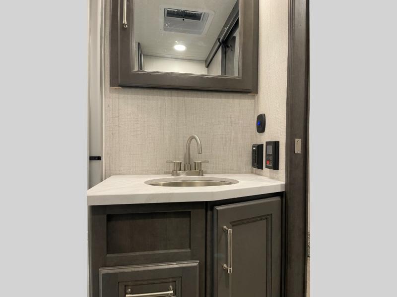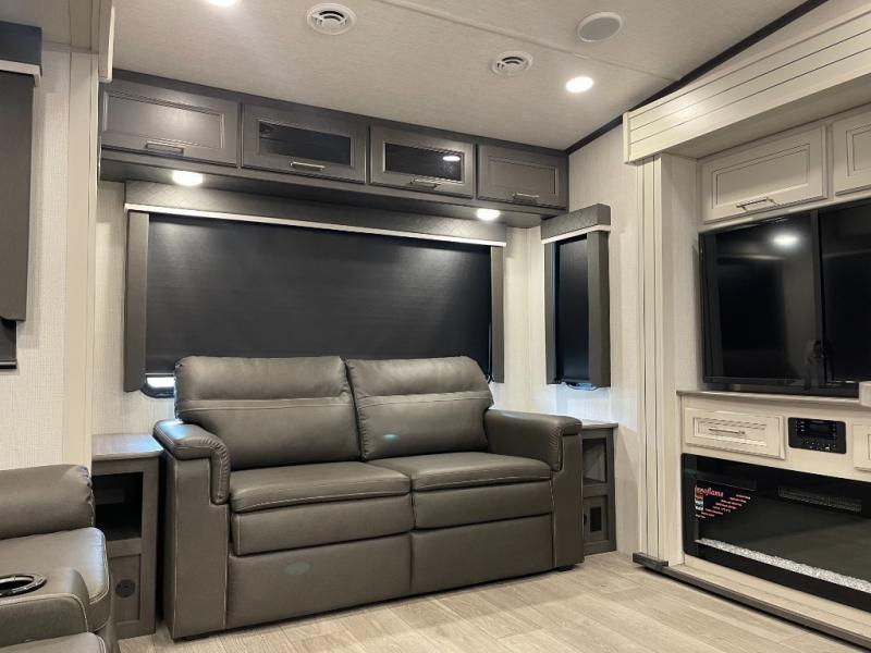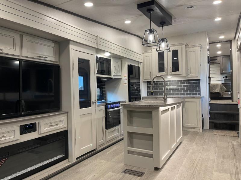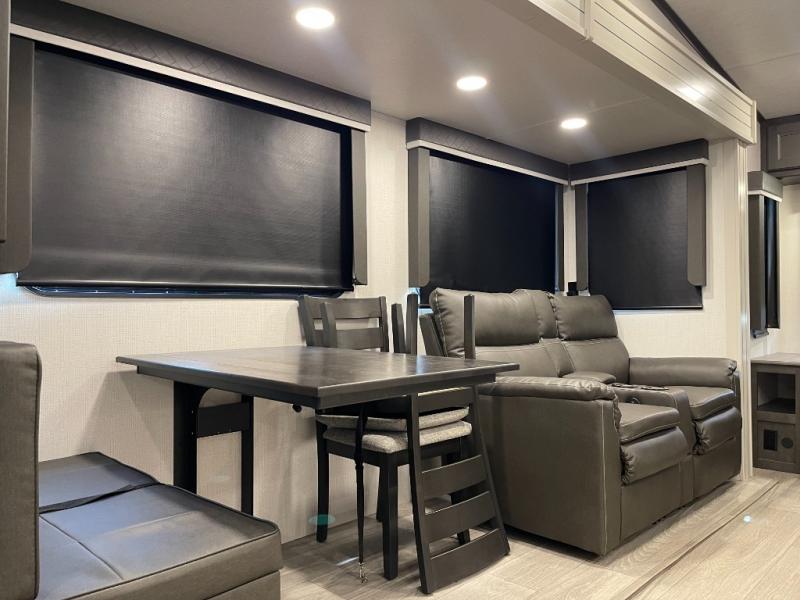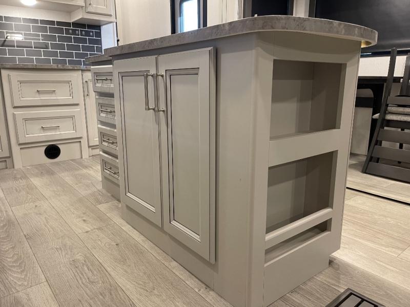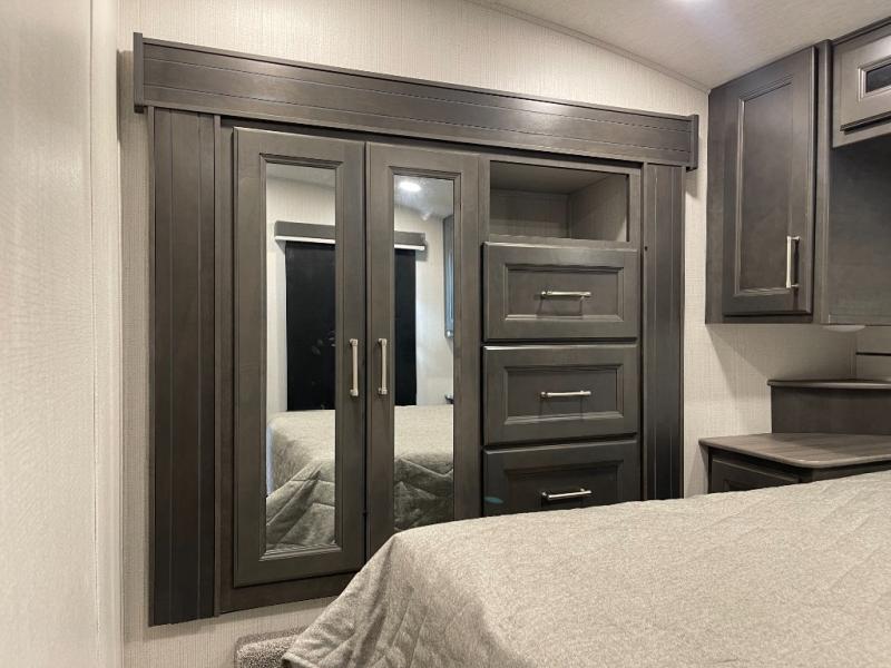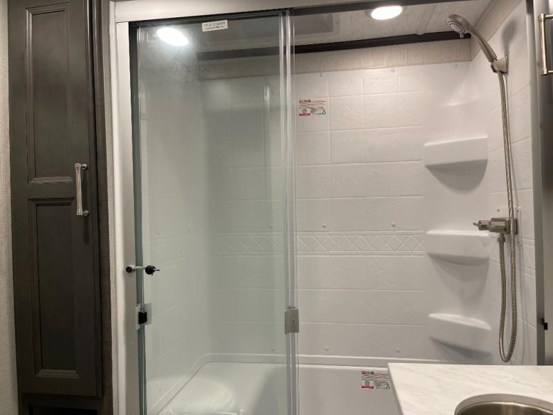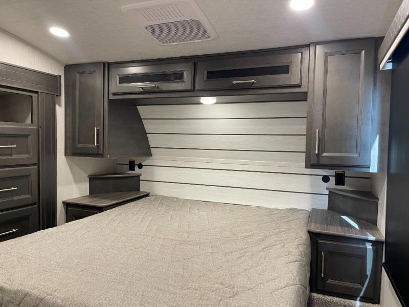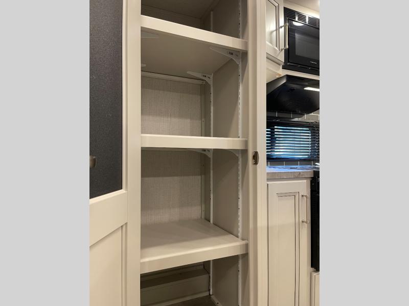 You will have the time of your life in this Cougar Half-Ton fifth wheel! There is so much comfort with the theater seating and 68" tri-fold sleeper sofa with end tables in the living area, and the comfort is taken up a notch with the addition of the fireplace below the entertainment center. You also have lots of space in this area because of the opposing slides, so you can work freely around the kitchen island preparing dinner or washing dishes. The booth dinette is right next to the kitchen, so you won't have to go far to set the table. If you don't need the dinette to serve as a bed, then you might be interested in switching it out for the optional free-standing table with chairs. The pantry is big enough to keep your favorite foods stored away, and the 10.4 cu.ft. refrigerator can hold the items that need to be kept chilled.