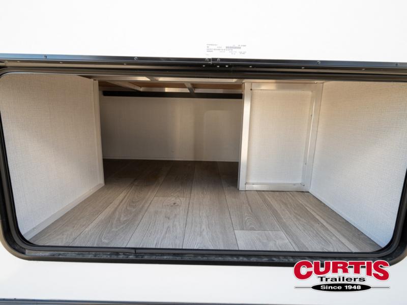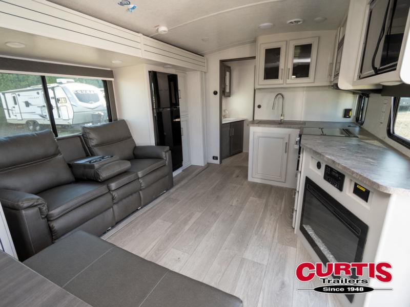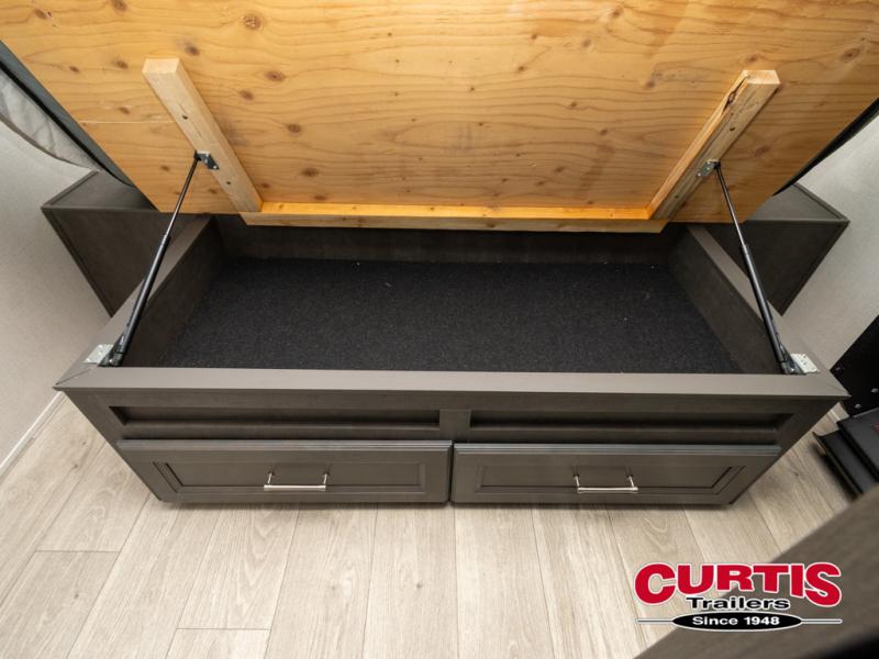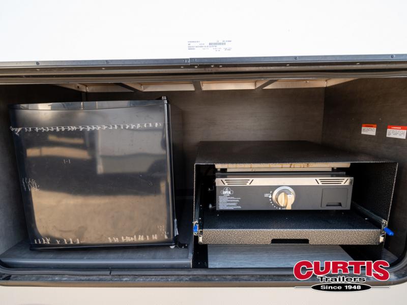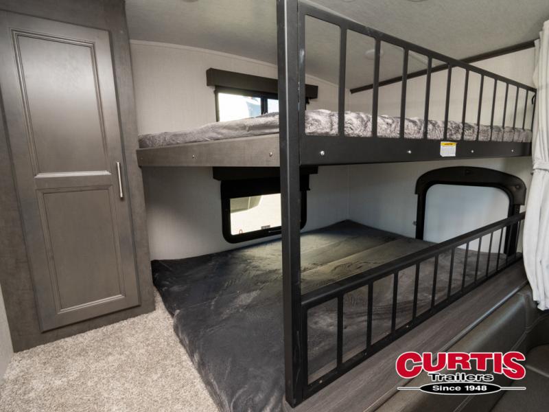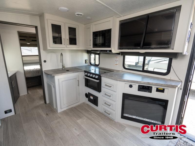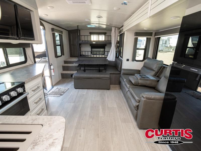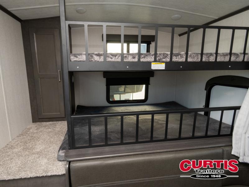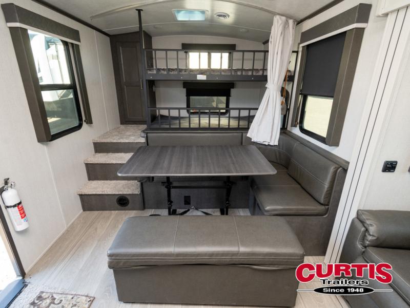 There is so much flexible space in this Cougar Half-Ton travel trailer! The rear bunkhouse has double bed bunks to sleep up to four. The lower bunk can flip up to create a storage area, and there is a cargo door here for direct access to the outdoors so you can load your bikes, toys, or gear easily. At the other end, you will love the private front bedroom with a king bed, dual night stands, and dual wardrobes for maximum space for your clothing. A roomy pass-through compartment runs underneath this bedroom if you should need additional room for outdoor gear. The kitchen/living area is centrally located and has a fireplace with a TV above it for a cozy gathering space. A corner booth dinette has an ottoman/bench seat that can be used for seating as needed. A 68" tri-fold sofa offers additional seating or sleep space if needed, or you can exchange it for the optional theater seating.
