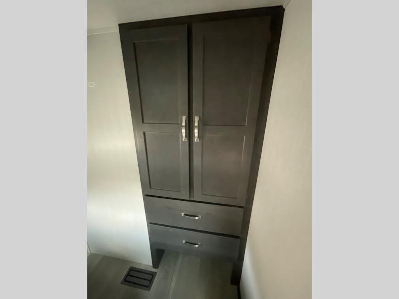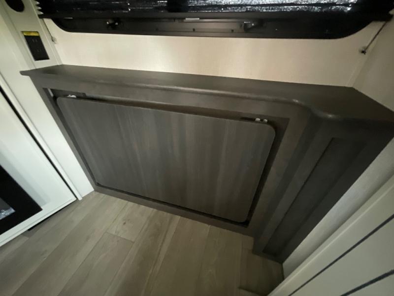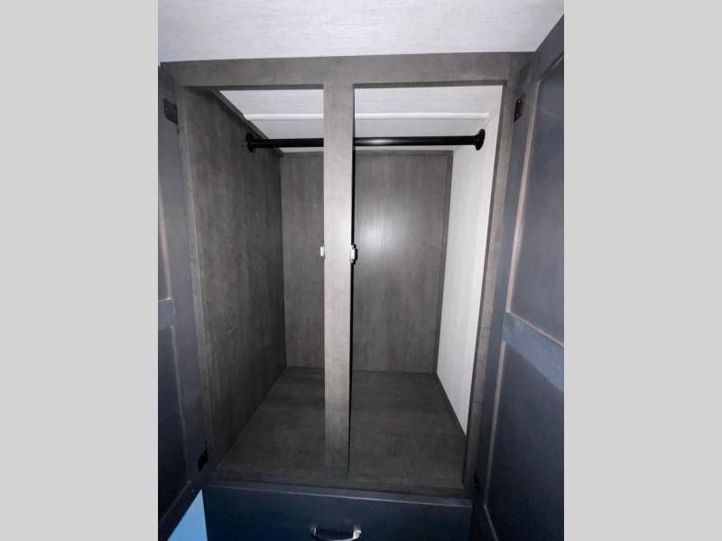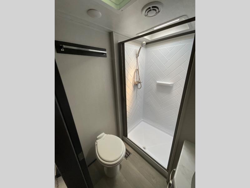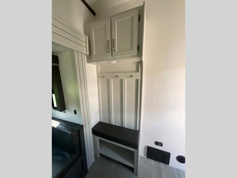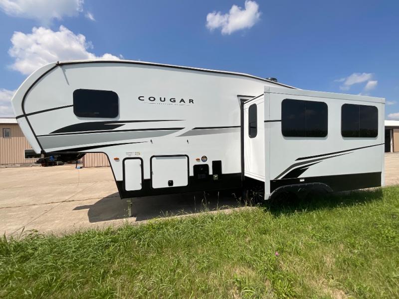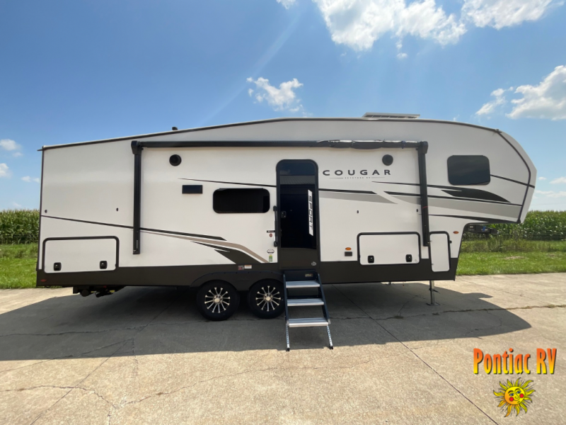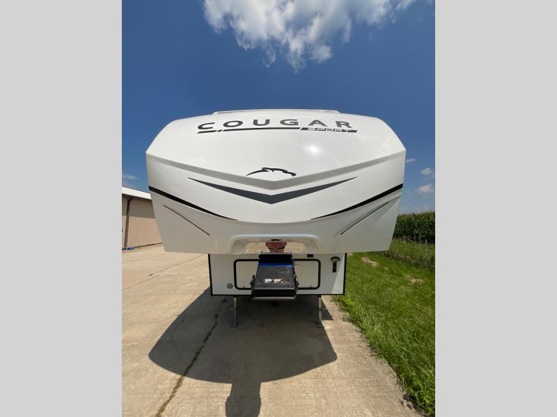 The Cougar Sport structural I-beam frame with stamped steel cross-members and outriggers, plus its laminated sidewalls with five-sided aluminum superstructure and Alpha Super Flex roof membrane are what active RVers love about the construction of the Cougar line. The Cougar Sport models are no exception when it comes to a great package, as well as being smaller and lighter weight than their big brother Cougar models. A one-piece, heated and enclosed polypropylene underbelly means a longer camping season. On the inside, residential shaker style hardwood cabinet doors and decorative crown molding, plus seamless pressed countertops and an on-demand water heater will make your unit feel even more like home. You are also sure to appreciate the shiplap style decorative accent wall behind the bed, a porcelain foot flush toilet in the bathroom, plus residential kitchen hardware, and so much more.