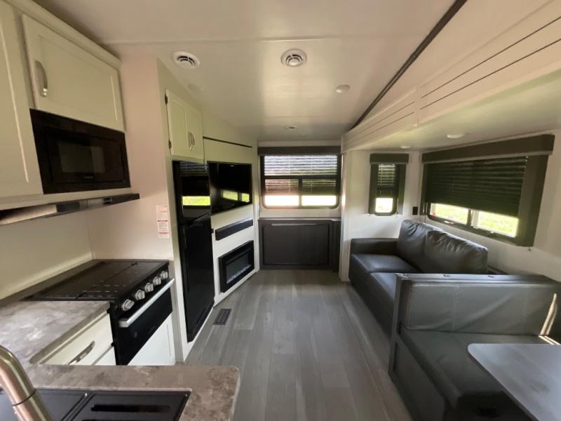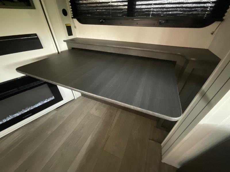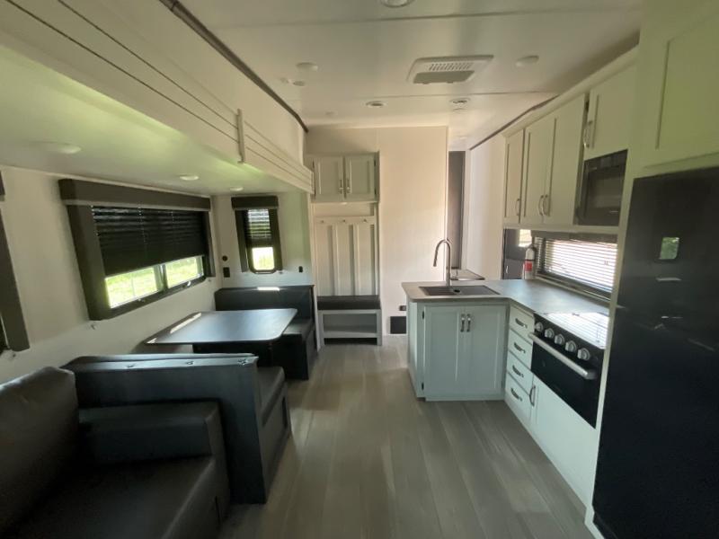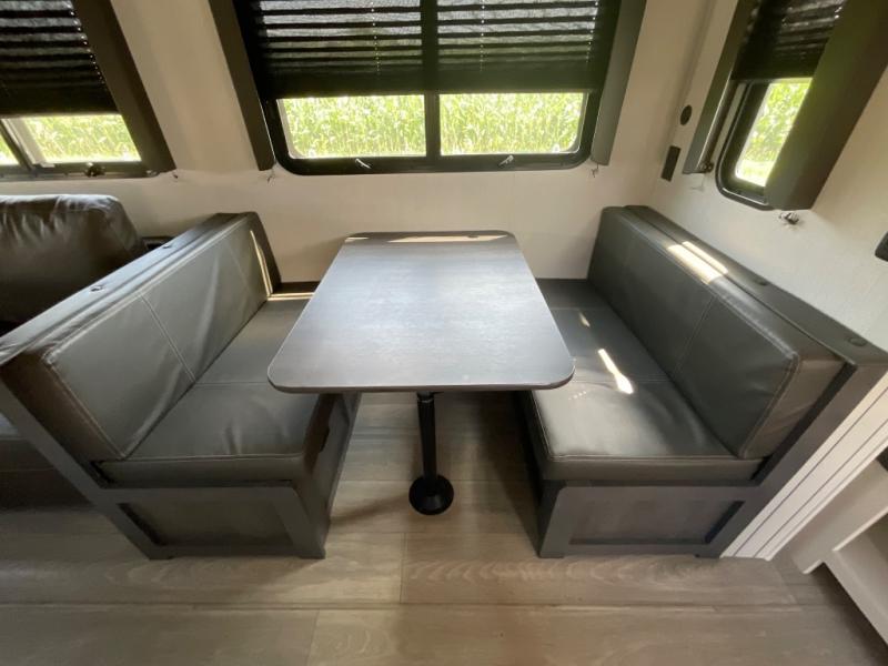 This lightweight fifth wheel is big enough for your small family to camp together! Enter to find a convenient combined kitchen and living space with large slide for added space. The slide features theater seating and a booth dinette which offers ample seating for meals and hanging out. There is a flip up table along the rear wall with a nearby 40" LED TV which features a butler pantry behind. Head up the steps to the right of the entry door to a complete bath and private front bedroom featuring a queen size bed with dual shirt wardrobes and nightstands on both sides of the bed. The bathroom offers a shower with a skylight for added headroom and natural lighting. Outside, a 16' awning provides added living space protected from the elements!