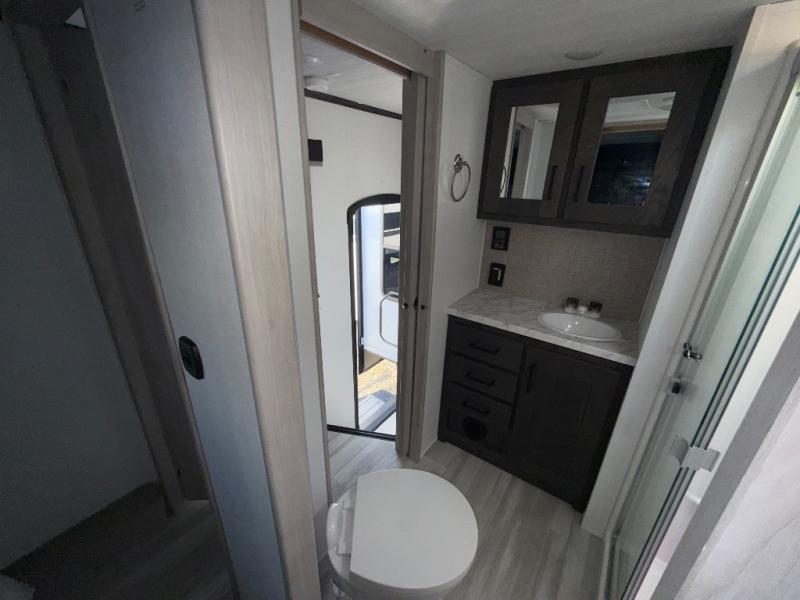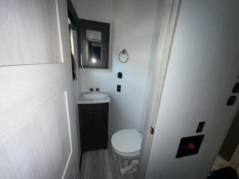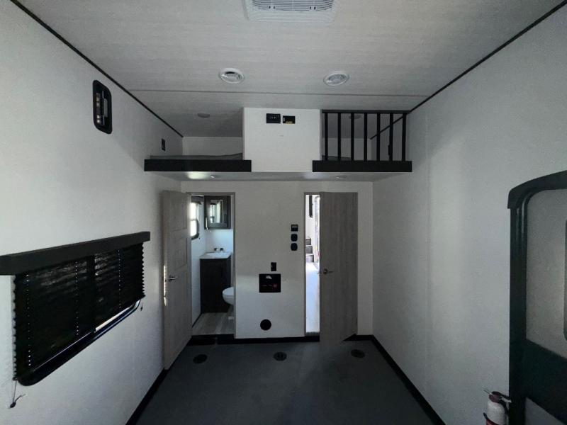 Fun with your toys is made easy with this 14' garage area toy hauler! Once the toys are unloaded, relax on the dual opposing sofas, or take a rest on the electric queen bed. The kids or guests can climb up into the loft that includes a bunk mat, and there is a half bath in the garage for added convenience. This model includes a peninsula countertop with plenty of space to prep meals and clean up, and there is a 16 cu. ft. 12V refrigerator for perishables. You'll find a residential shower with a seat in the dual entry bath, and the front bedroom will feel just like home with its Fuzion king bed and wardrobe slide for all your clothes.