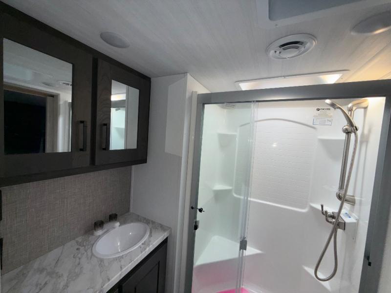 Embrace the great outdoors with a Fuzion Impact Edition toy hauler by Keystone! There are laminated fiberglass sidewalls and a 8' 4" wide-body construction for your toys and gear! The one-piece polypropylene heated underbelly includes enclosed tanks and valves which will help extend your camping season, and the leaf spring suspension system will provide smooth towing. Head inside to enjoy night shades, hardwood cabinetry, and fiberglass backed linoleum floor with no carpet for easy cleaning. Each model also includes a Girard on-demand water heater, two 30 lb. LP tanks, recessed LED puck lighting throughout, and the list of comforts goes on!