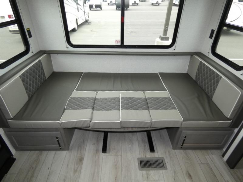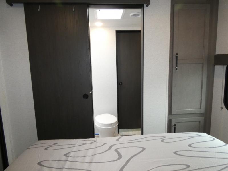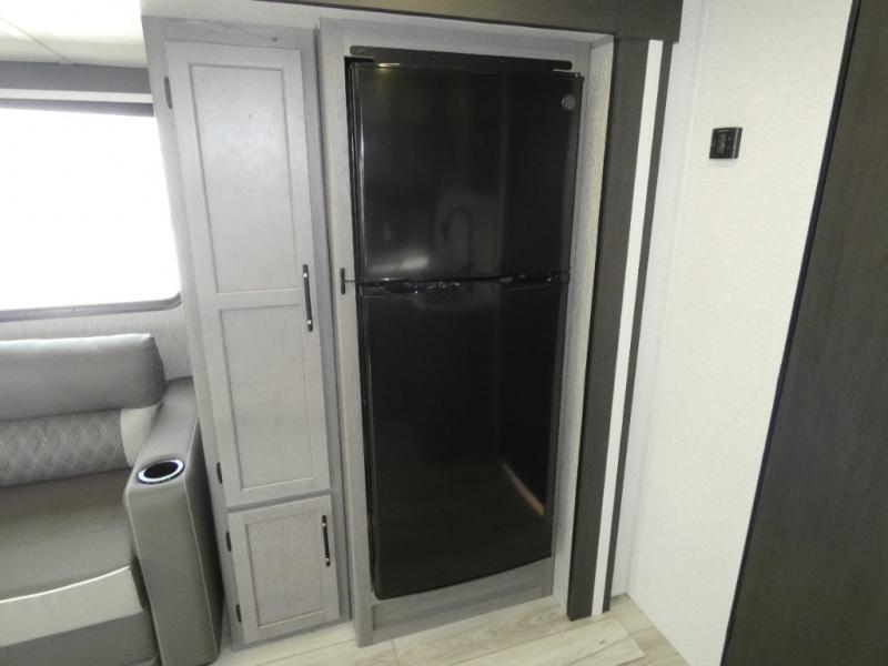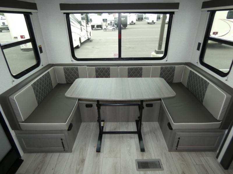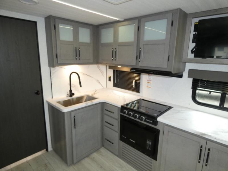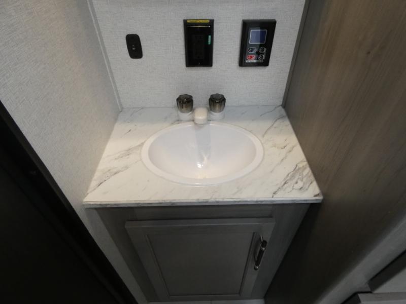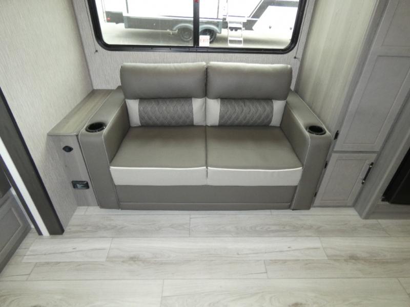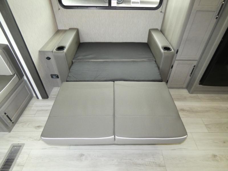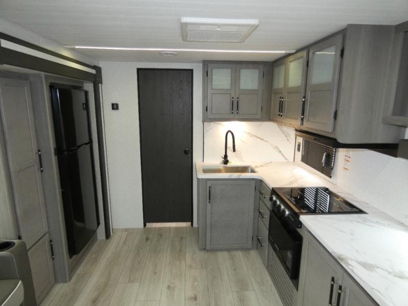 Enjoy every camping trip in this spacious dual entry travel trailer for six. You will love the rear U-dinette and the tri-fold sofa within the large slide out, and there is TV prep in the living area if you plan to bring along your television. Home cooked meals can be whipped up in a hurry on the three burner range, and there is plenty of counter space to cut up fresh veggies. The walk-through bath is convenient for everyone to access, and here you'll find a spacious shower and a linen closet for clean towels. Head to the master bedroom where you'll be met with a queen bed, dual nightstands and closets, a laundry chute, plus your own exterior entry door; how convenient. The exterior even has an outdoor refrigerator for cold drinks under the awning!