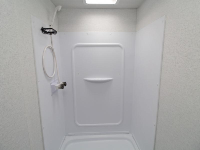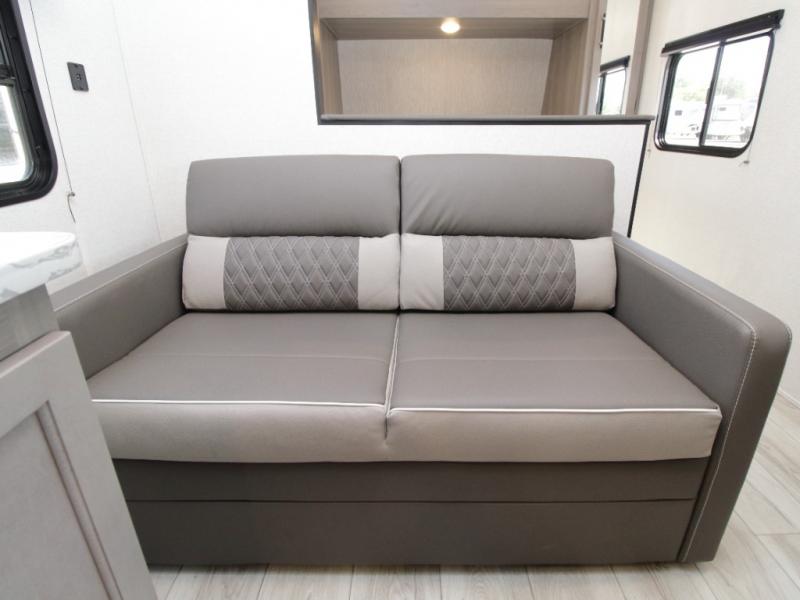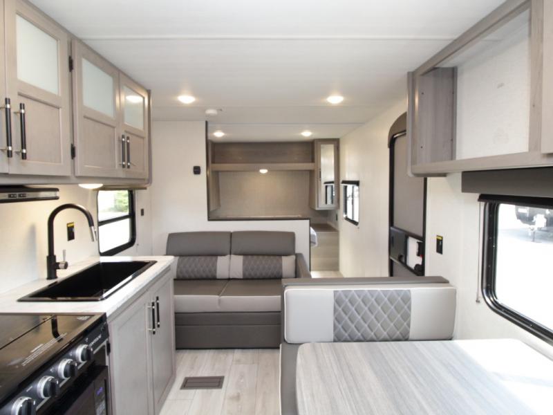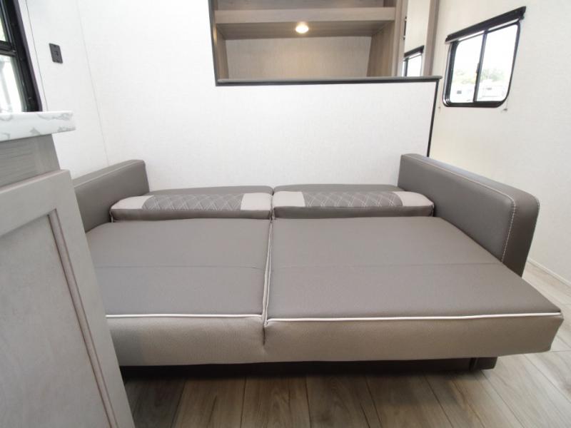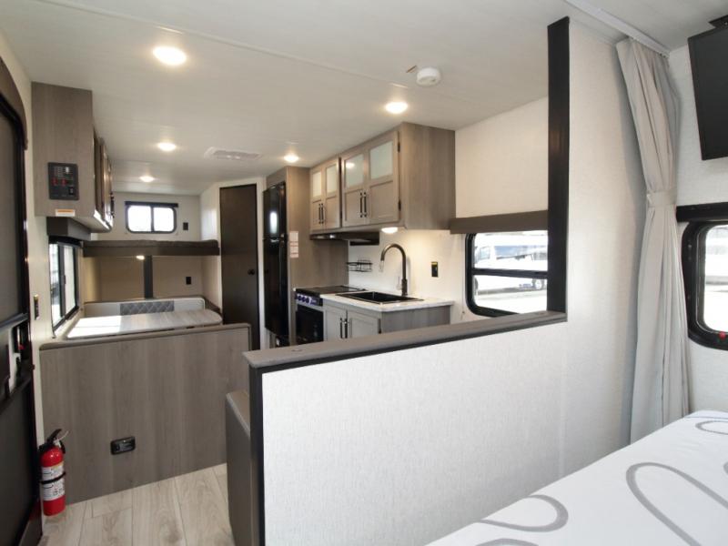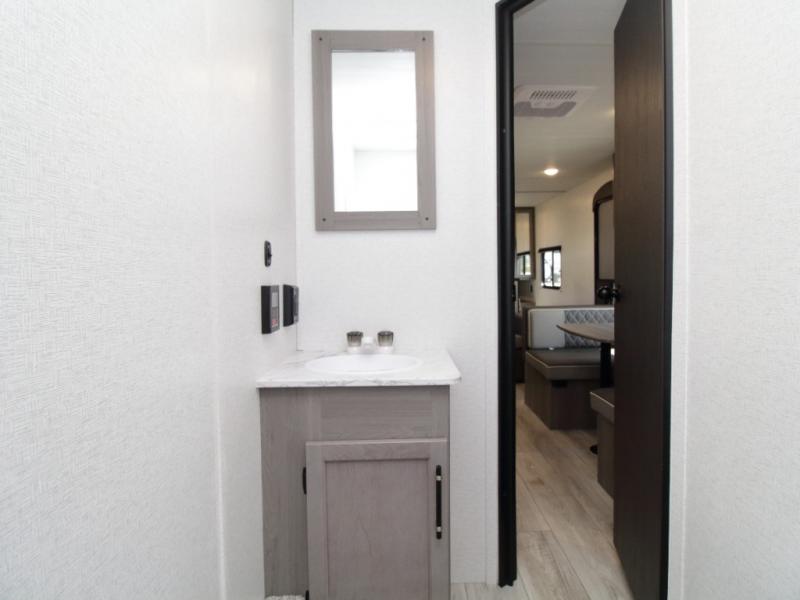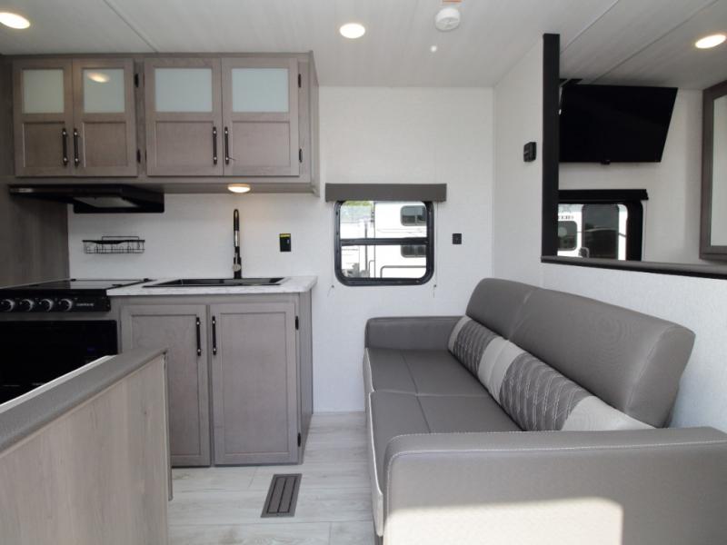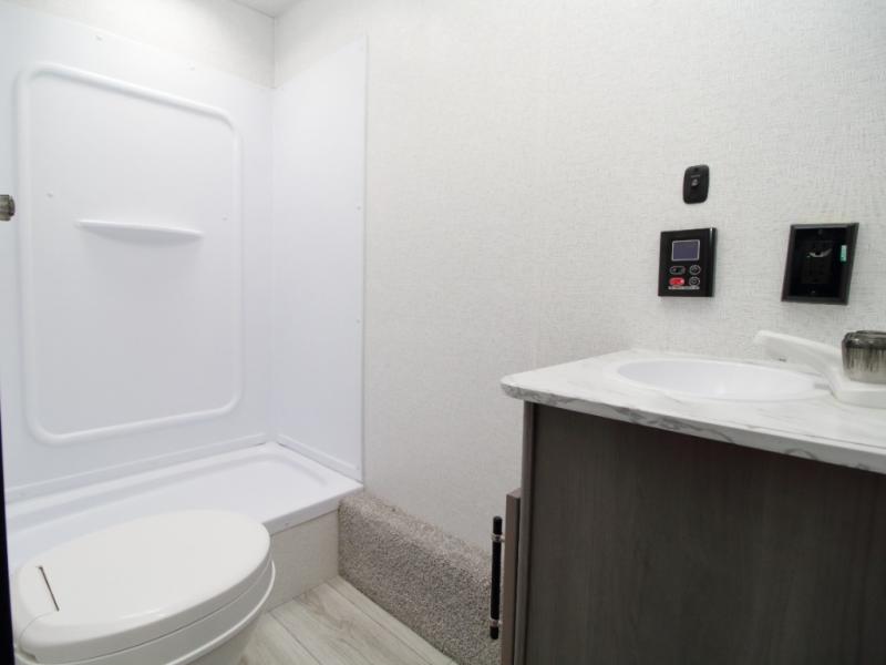 The kitchen is equipped with a cooktop, sink, and large 10 cu. ft. 12V refrigerator so you can prepare meals with ease, while TV prep makes it simple to enjoy movie nights after a day of adventure. The full bathroom ensures added convenience with its shower, toilet, and sink just steps away.