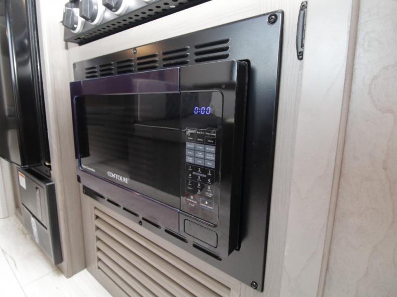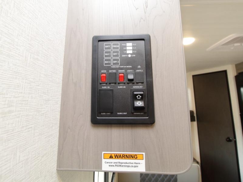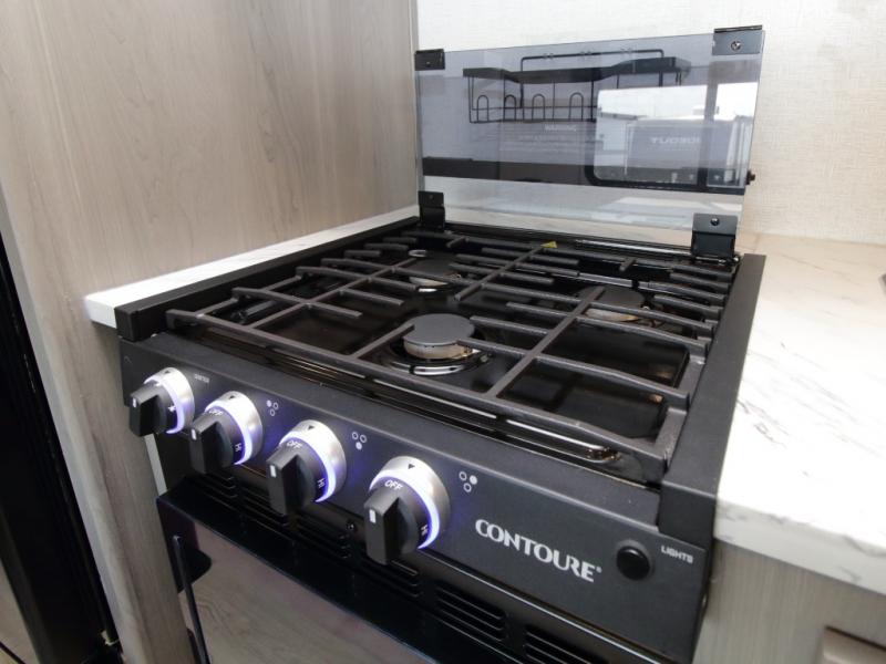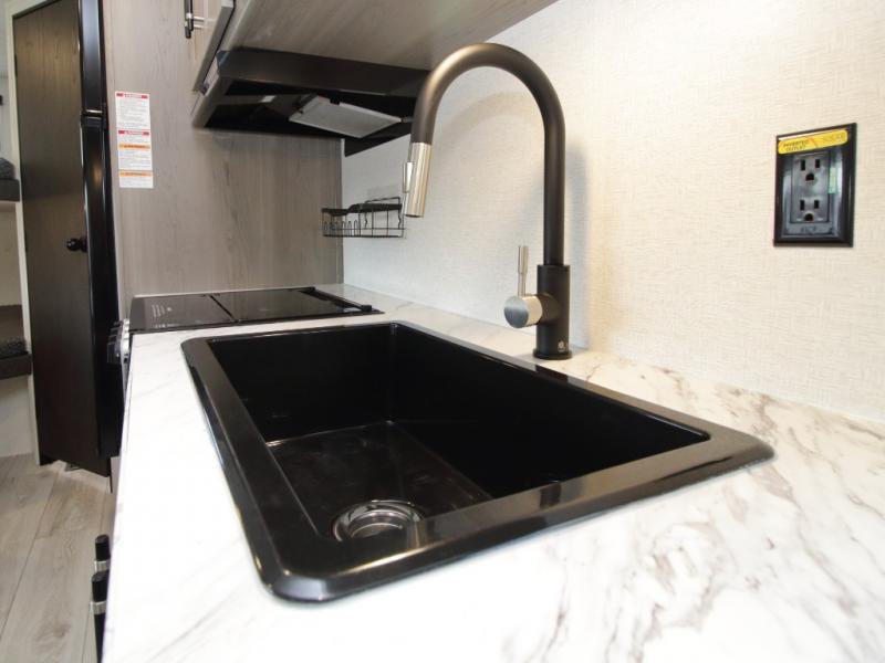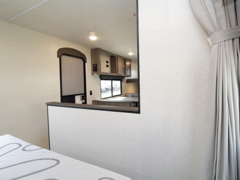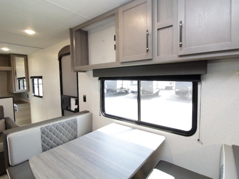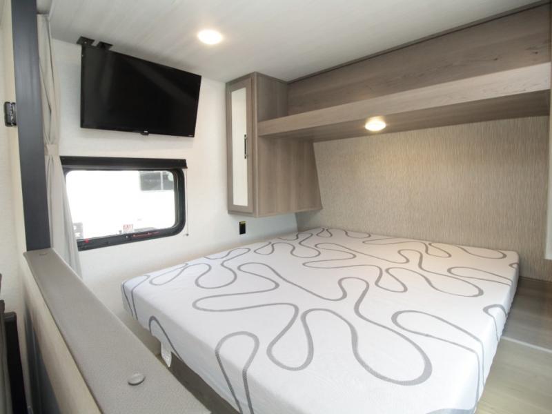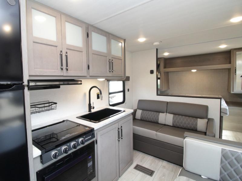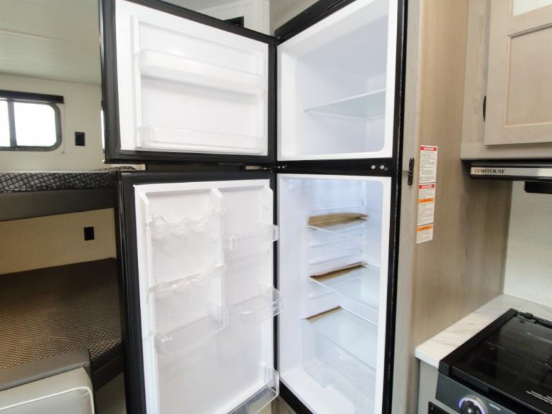 The kitchen is equipped with a cooktop, sink, and large 10 cu. ft. 12V refrigerator so you can prepare meals with ease, while TV prep makes it simple to enjoy movie nights after a day of adventure. The full bathroom ensures added convenience with its shower, toilet, and sink just steps away.