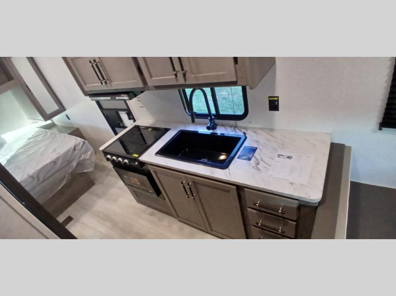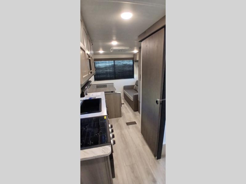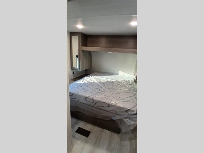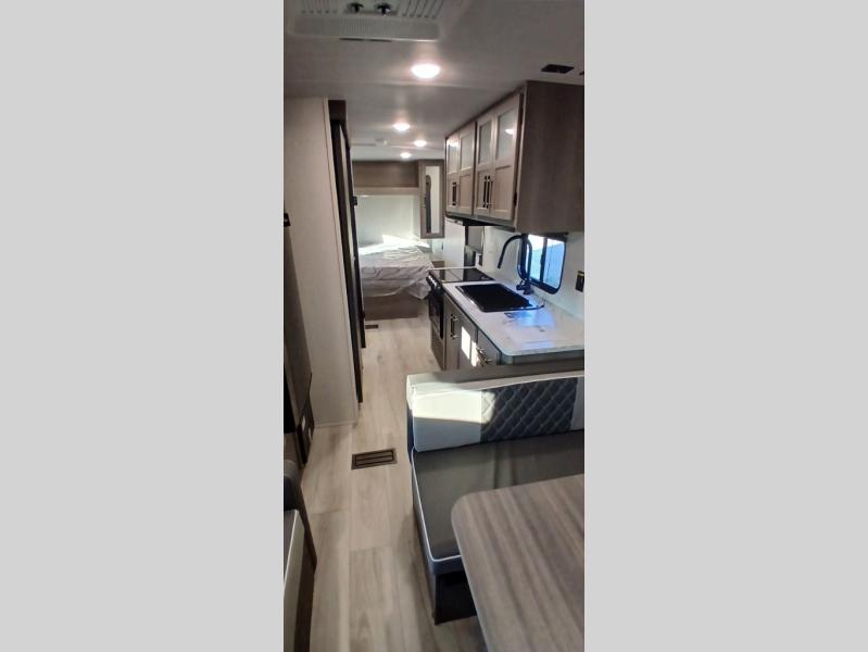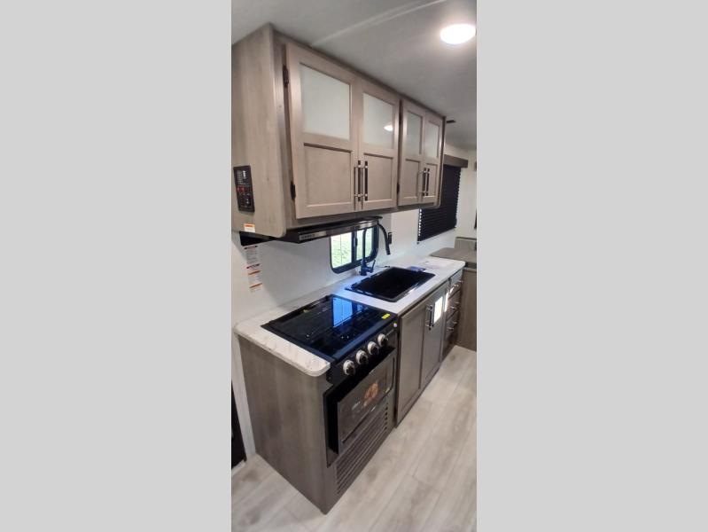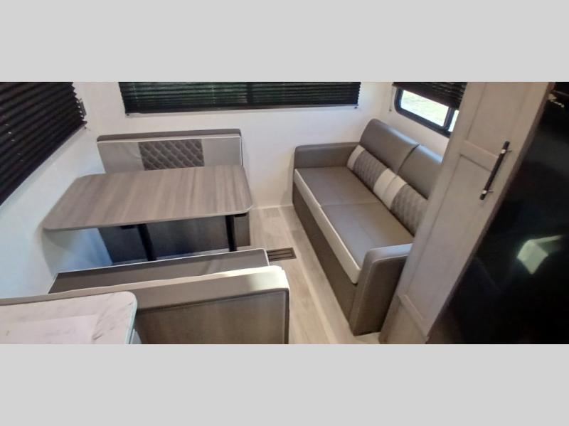 This is the perfect starter travel trailer since it includes everything you need while you're away from home. You'll enjoy the queen bed up front with underbed storage and nightstands for your things, plus a full bath on board so you won't have to use the camp's facilities. This model includes a cooktop that will allow you to cook meals each day, and there is a pantry and a 10 cu. ft. 12V refrigerator for food storage! A booth dinette in the back provides a place to dine and the sofa will be perfect to relax on after a day outdoors. And these pieces of furniture can double as your guests sleeping space at night!