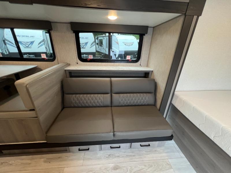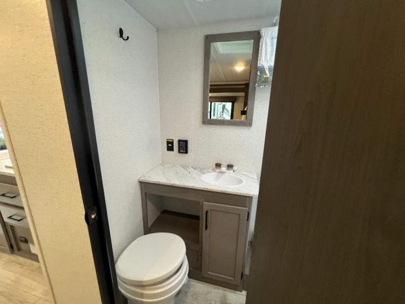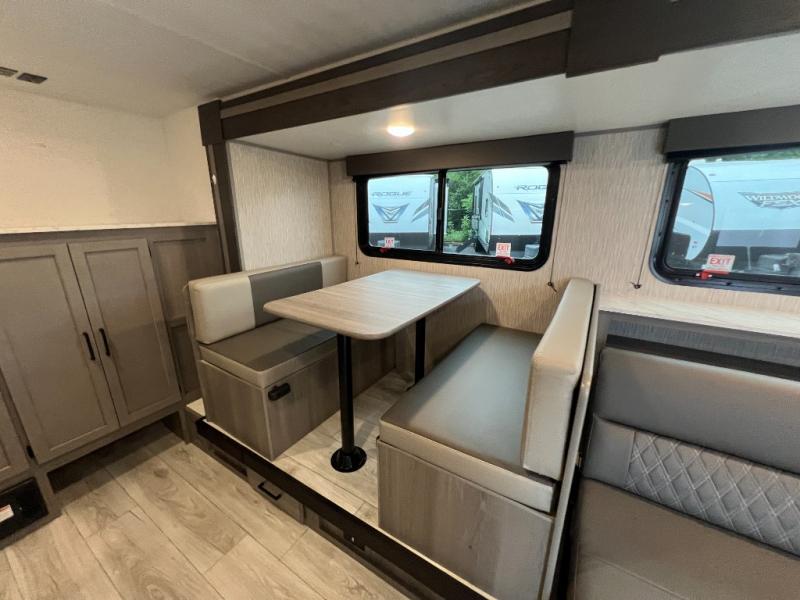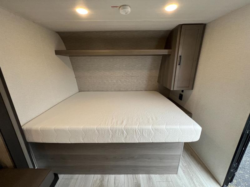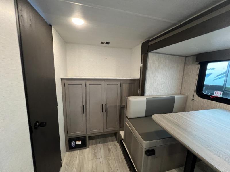 Head to the lake in this spacious trailer that can sleep five to six each night. There is a front queen bed for you, plus a sofa and booth dinette within the large slide out that doubles as seating and sleeping space. You will also find storage drawers below, and there is a pantry and closet along the rear wall for all your goodies and such. The cook will love the galley kitchen with a two burner cooktop and a 7.7 cu. ft. refrigerator for food storage. The TV prep means you can bring along your television for movie nights, and the countertop behind the sofa provides more space for belongings!