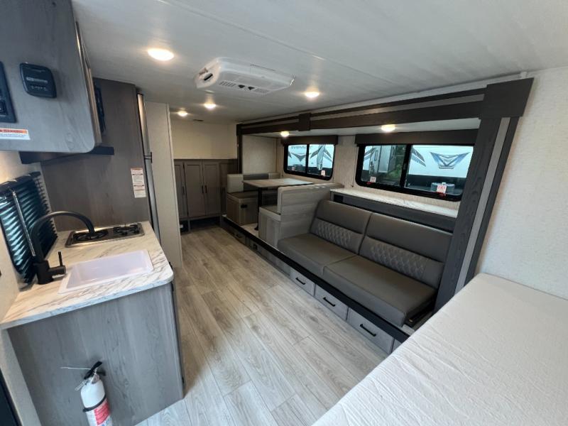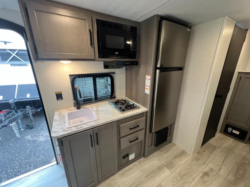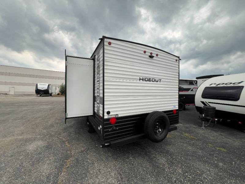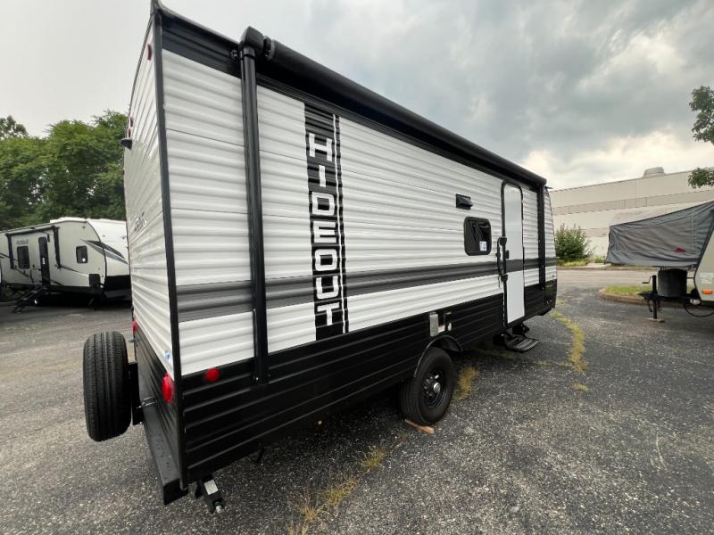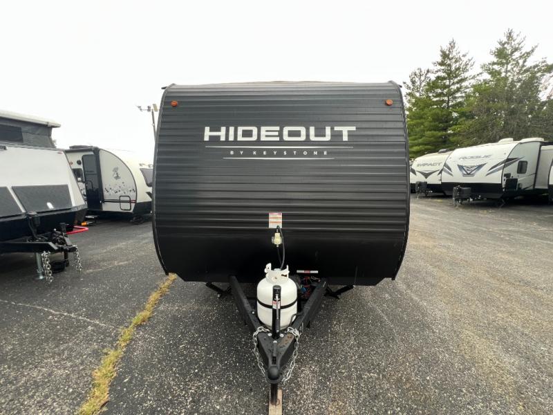 Open your horizons with the Hideout Sport Single Axle travel trailers by Keystone. They are compact, convenient, and lightweight; everything you're looking for in an RV! Each model features an aluminum exterior, tinted safety glass windows, and a Super Flex TPO roof membrane for added durability. The interior includes blackout night shades for added privacy and solid wood doors and drawers that will give a more at-home touch. The Girard tankless water heater is a feature you won't want to camp without, and the LED lighting will keep your space bright and open!