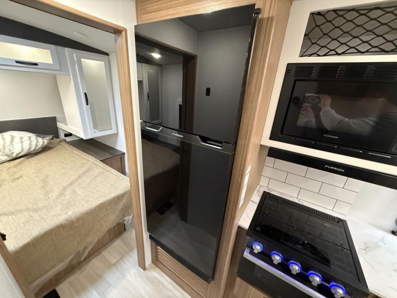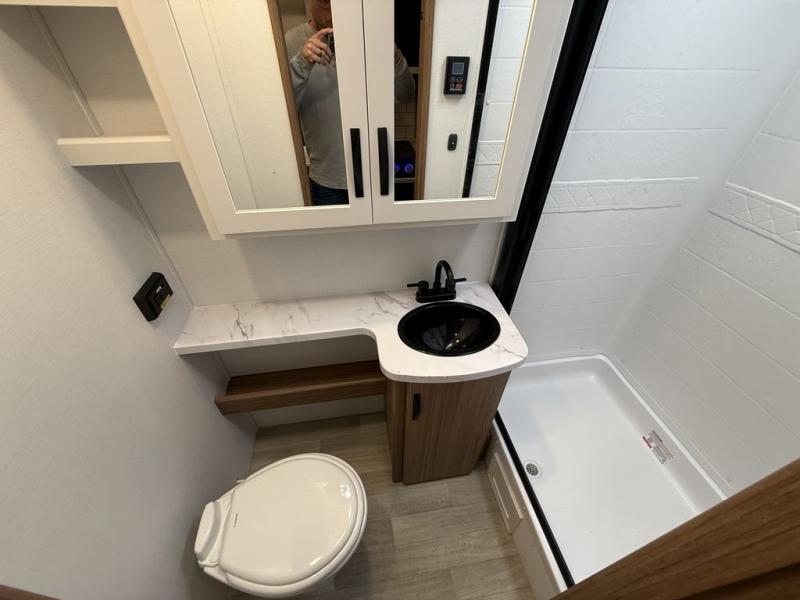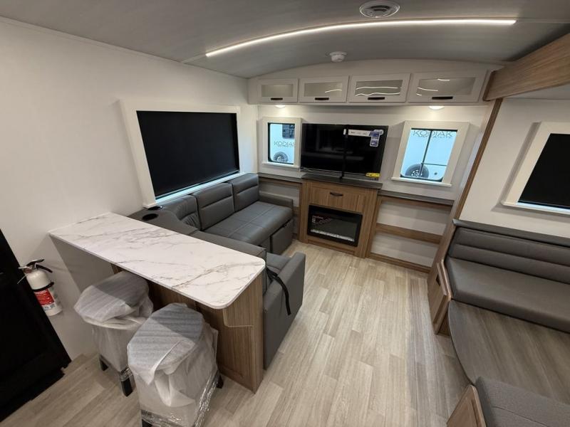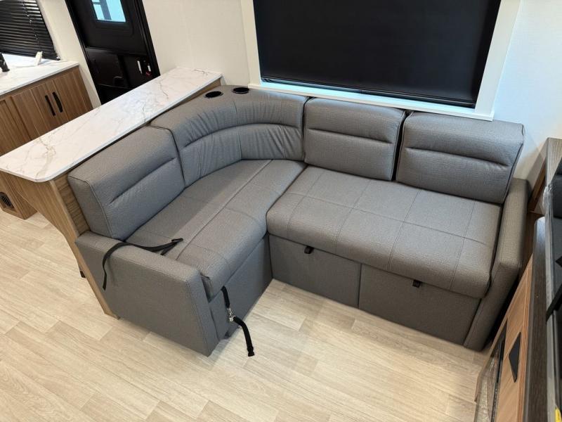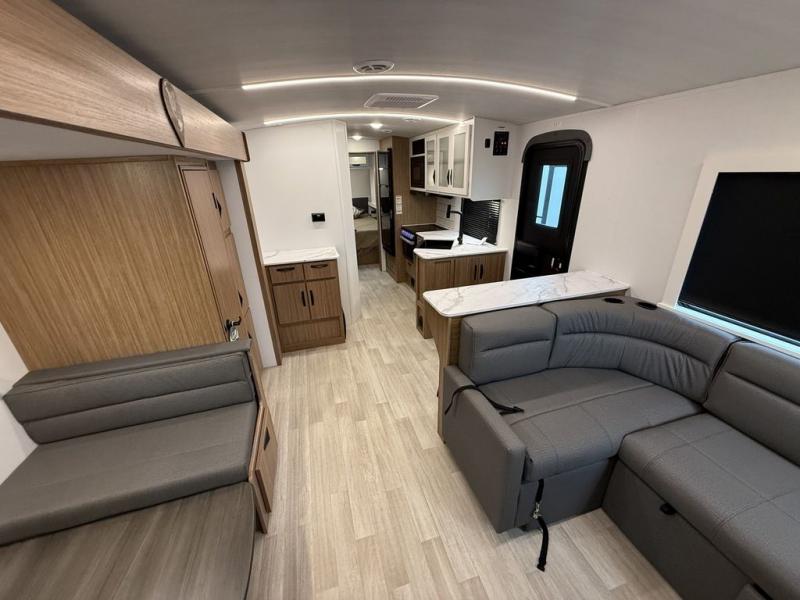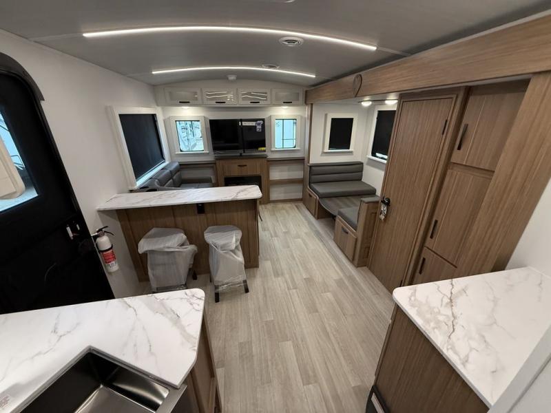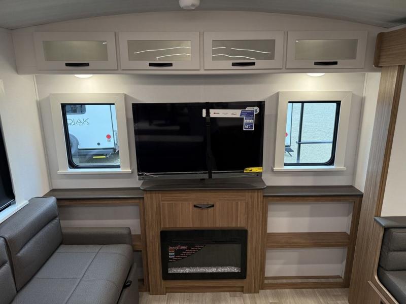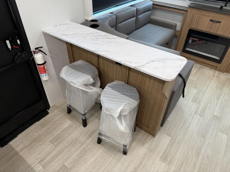 Step right into this rear living travel trailer for fun trips at the lake! There is an L-shaped sectional sofa in the back, along with an entertainment center and a fireplace to enjoy cozy evenings indoors. The booth dinette will provide a place to dine, play games, and even let a guest or two littles ones sleep. This unit also includes a spacious pantry and a coffee station where you can set up your own Keurig machine. A full kitchen will let you prepare meals each day, and the mid-coach full bath will be easily accessible for everyone to use. You will also love the front private bedroom with its queen bed, plus dual wardrobes and dual nightstands so everything has its own place!