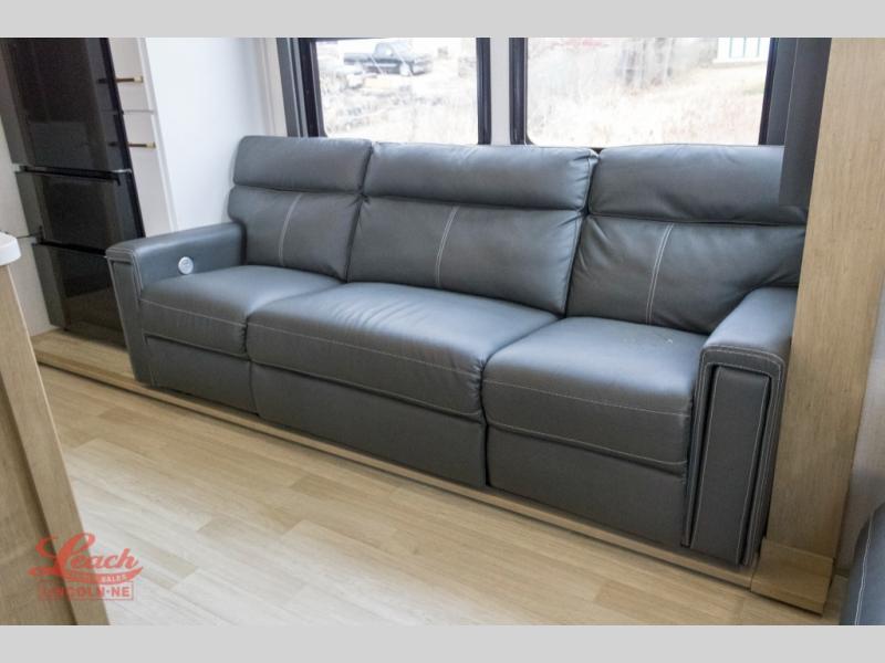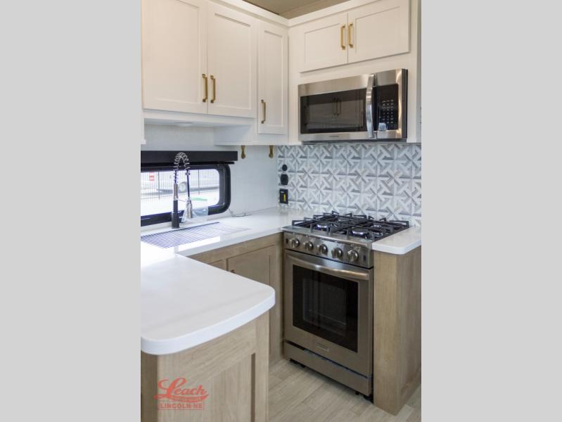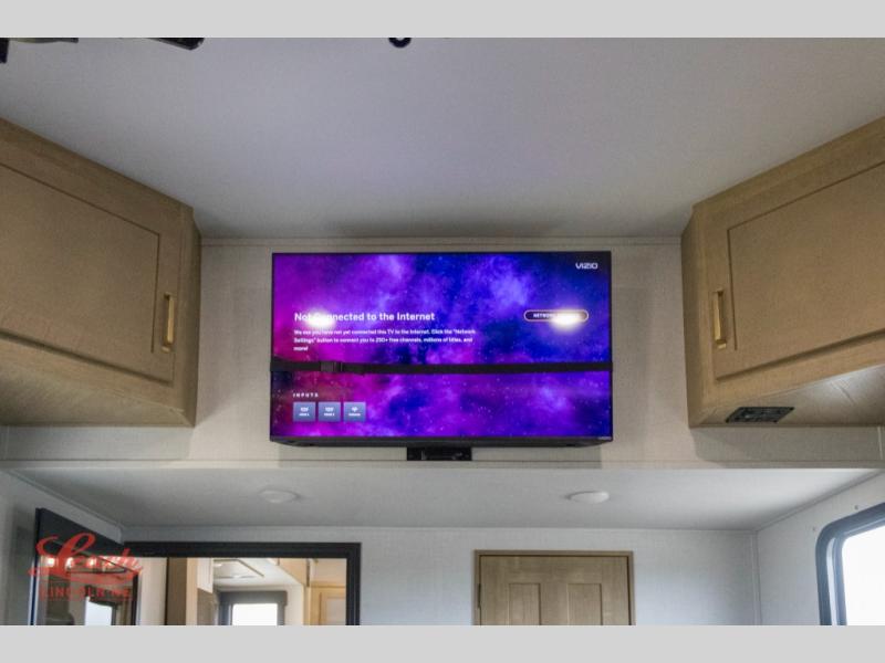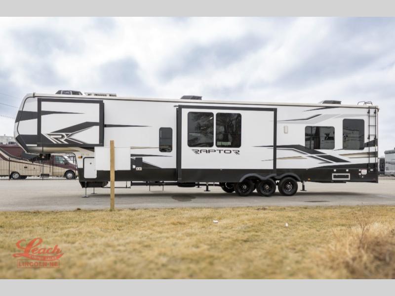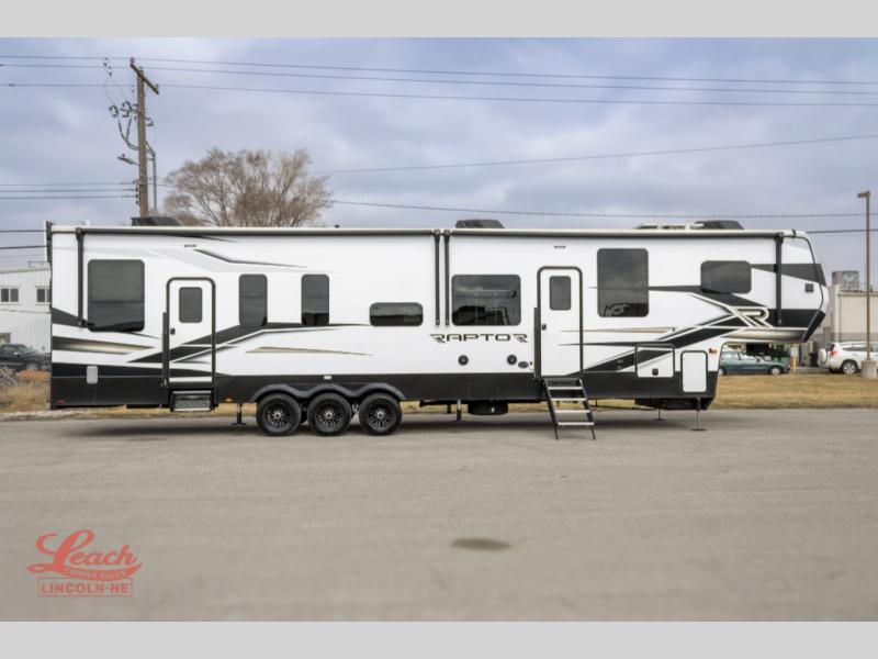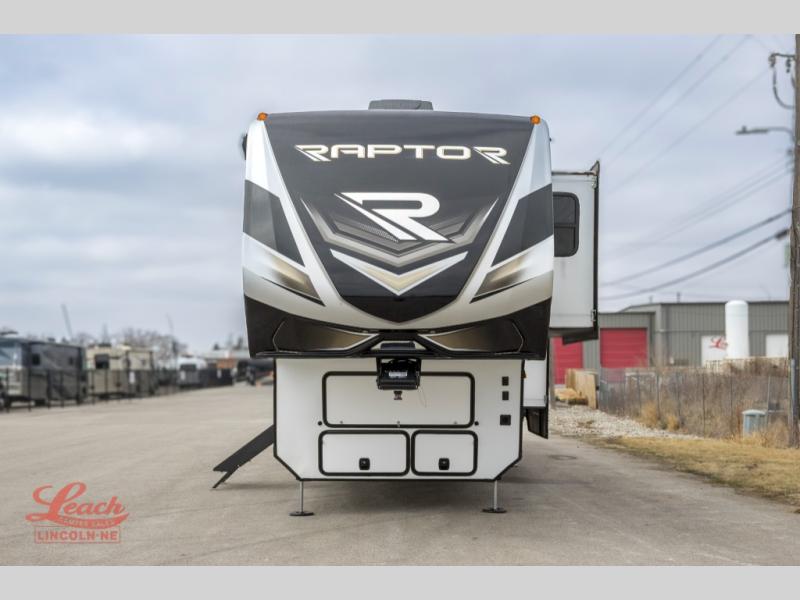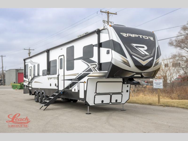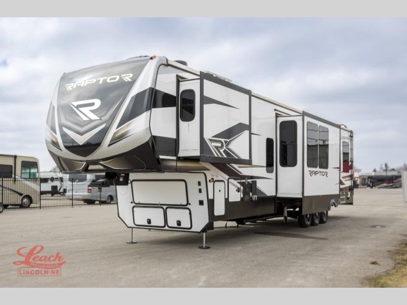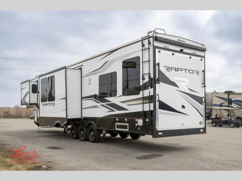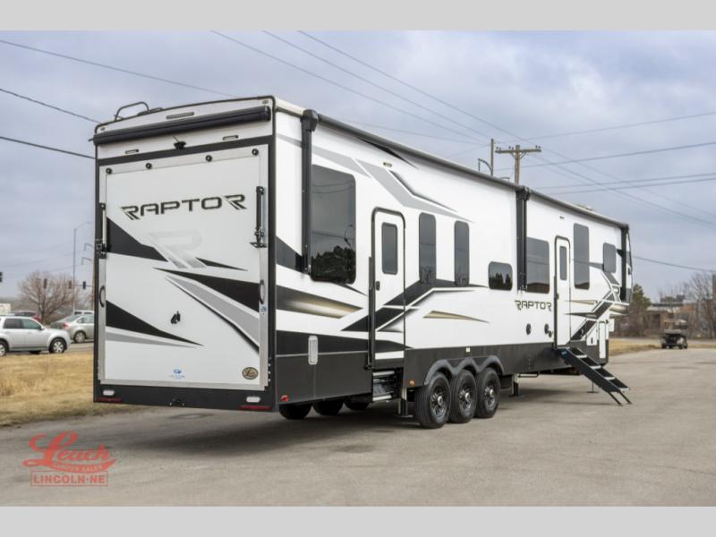 Experience a breath of fresh air with one of these Keystone RV Raptor fifth wheel toy haulers! Their rugged construction consists of a one-piece Alpha Super Flex TPO roof membrane, Dyna Span floor decking, and 5,000 lb. frame-welded tie- downs to keep your toys in place as you travel. Some unexpected conveniences you will appreciate include an Omni-Chill A/C system to keep you cool on those hot summer days, a Furrion backup camera, MaxTurn™ technology with a Helux™ pin box, and a Generation 3 iN-Command smart automation system with Global Connect to make life easier. There is also designer style vinyl flooring throughout, along with hardwood ceiling treatment with LED accent lighting, beach wood and white cabinetry, and many more interior comforts!