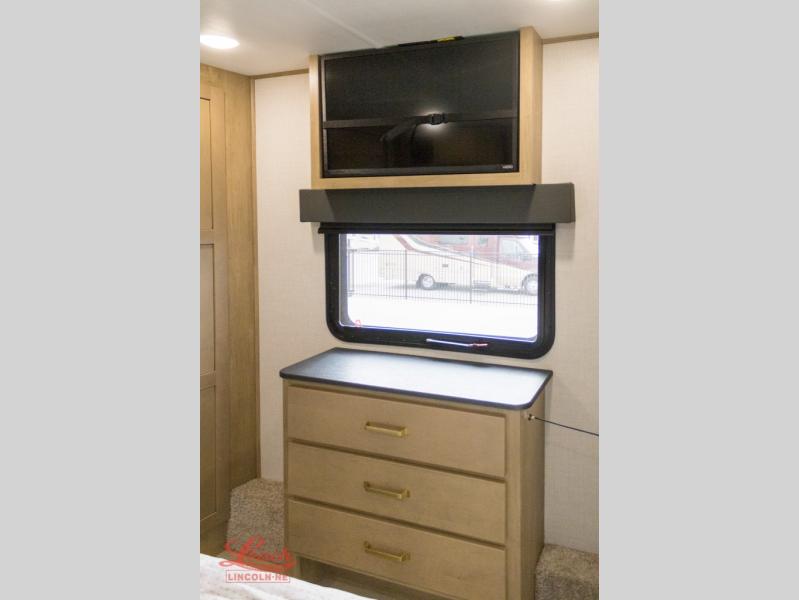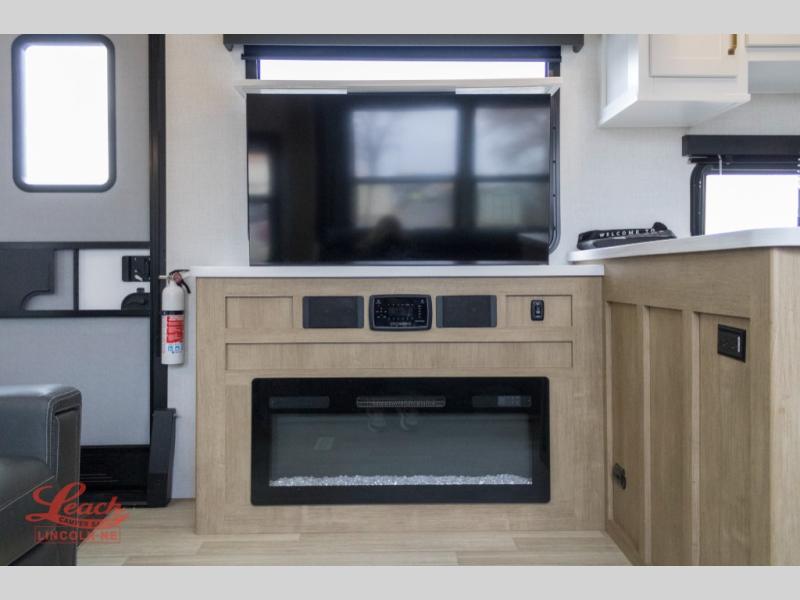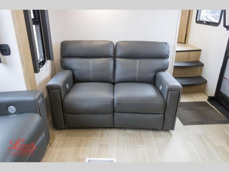 Head out to your favorite playground with this awesome Raptor fifth wheel toy trailer in tow! You will love the dual 30 gallon fuel tanks to keep all the toys fueled and running all week long! The 13' garage easily converts to living space once you remove the toys using the zero gravity rear ramp door. Set up the flip-sofas and table for meals and games when you are not riding the trails, and there is a pull-down bed for two as well. The flip sofas and dinette can easily accommodate two more tired campers at night, plus a twin loft will certainly be a favorite for the younger trail rider in the group. A convenient half bath is nice for running in while outdoors to keep the dirt and grime out of the main living area up front. This space includes triple seat recliners in the slide along with a refrigerator, and a second two seat recliner adjacent off the slide. All seating can easily view the entertainment center with fireplace below. Up the steps to a private front king bed suite and dual entry bath. The king bed slides out to create more space, and there is ample storage within the rear closet, wardrobe, and dresser. The bath features a shower, toilet, vanity with sink, and dual medicine cabinets for your personal items and toiletries, plus a linen cabinet for your towels. And two 20' awnings offer a huge outdoor living area that is protected from the elements!