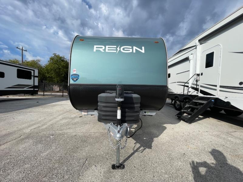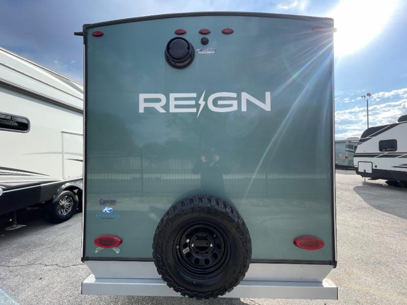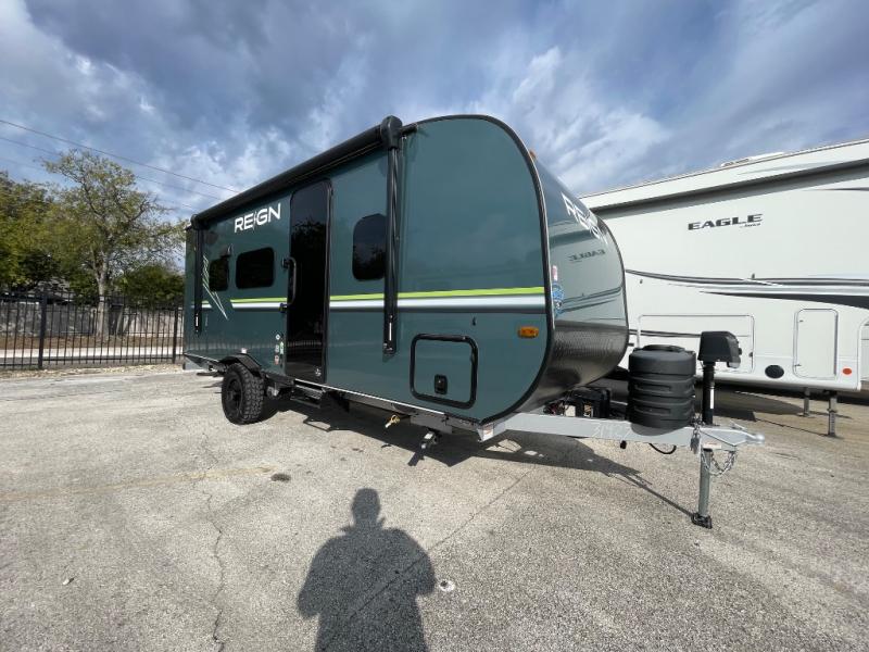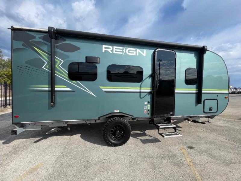 The Reign travel trailers by Keystone are premium single-axle units that are sure to make an impression at the campground. Each one is built with an exclusive automotive-finished aluminum exterior, a walkable roof, and a 100% composite floor for added durability. There are also tinted safety glass windows, quick drop stabilizer jacks, and an exterior shower with hot and cold water. The European inspired interior design is unique and cozy, and the 78" interior height will give you plenty of space to move about. You will also enjoy the ultra bright LED light strip and solid surface countertops in the kitchen, along with blackout night shades, and many more interior comforts.