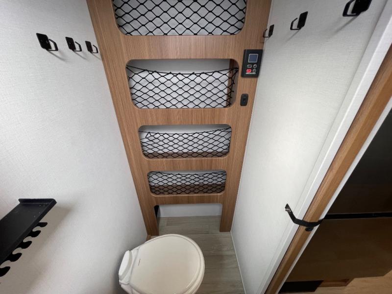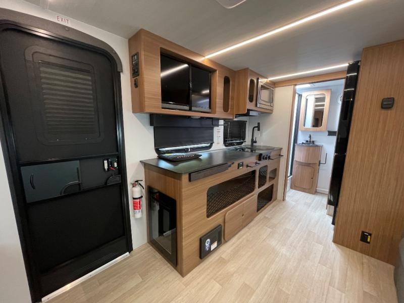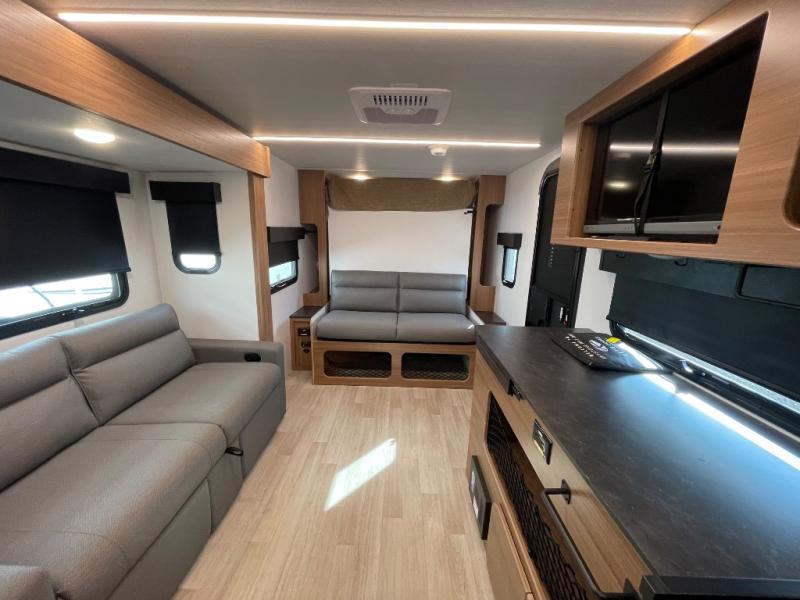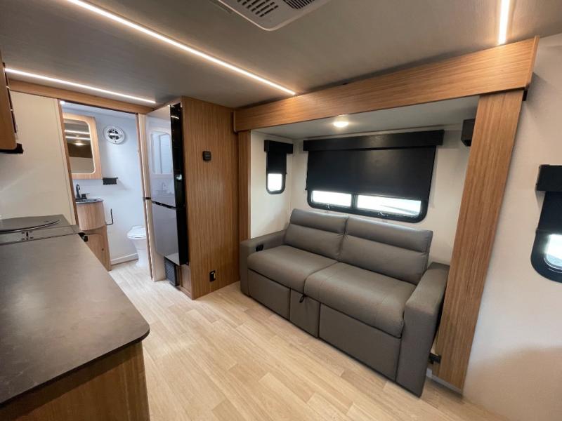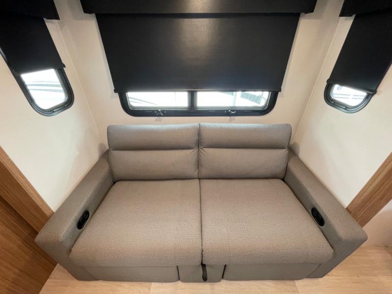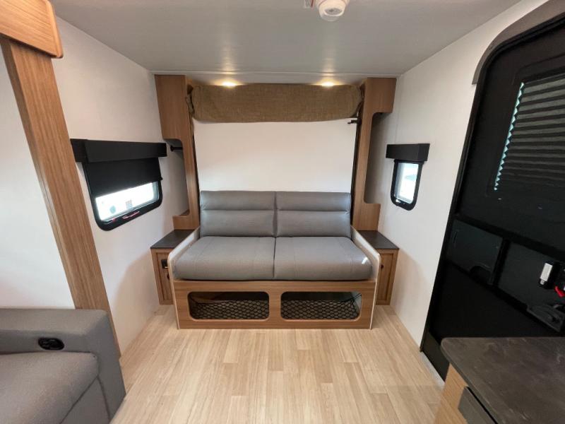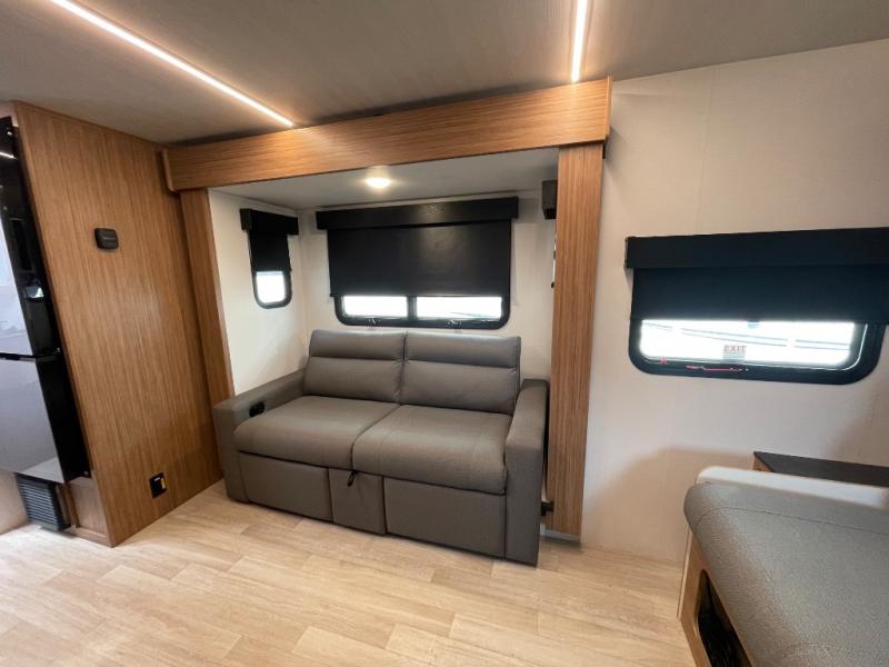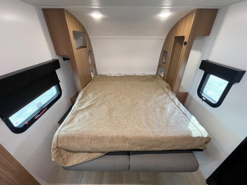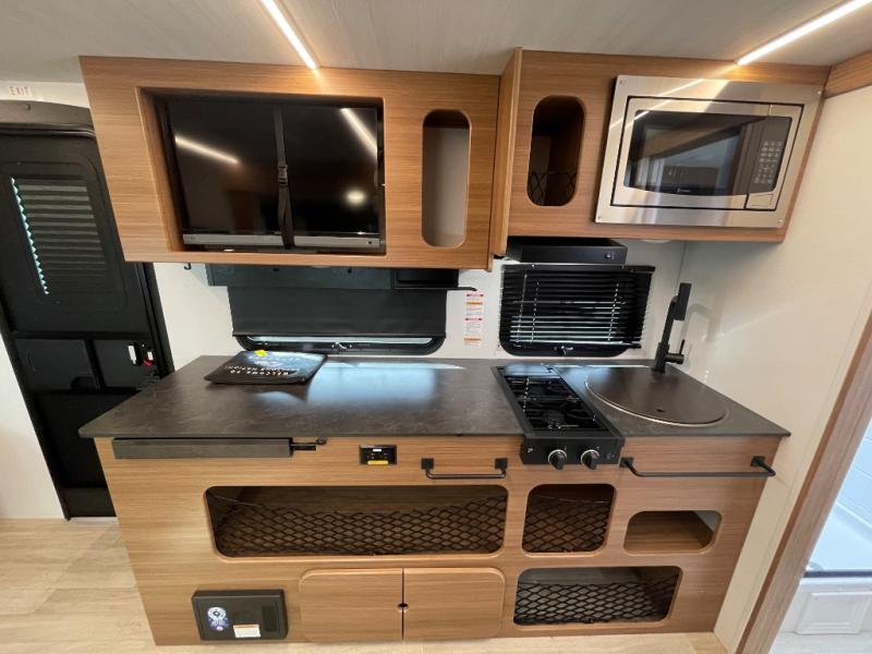 This single axle trailer is both cozy and versatile since there is a fold down sofa/Murphy bed up front! Now you can easily convert seating space into sleeping space, plus there are dual bedside closets to keep your things tidy. A two burner cooktop and air fryer/convection microwave will let you cook meals each day, and there is a huge countertop plus a flip-up extension for even more prep space. This unit also includes a theater dinette where you can relax each day, and the fireplace is sure to make your space feel like home!