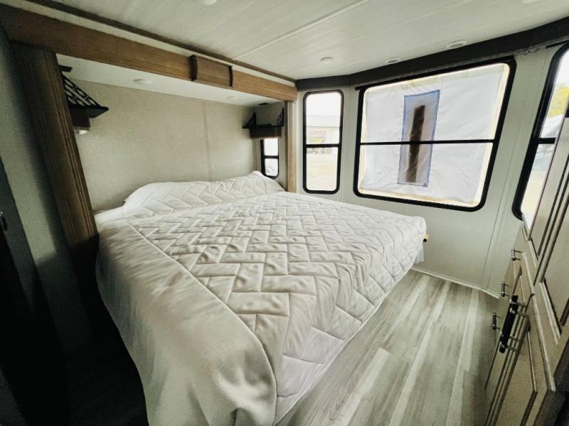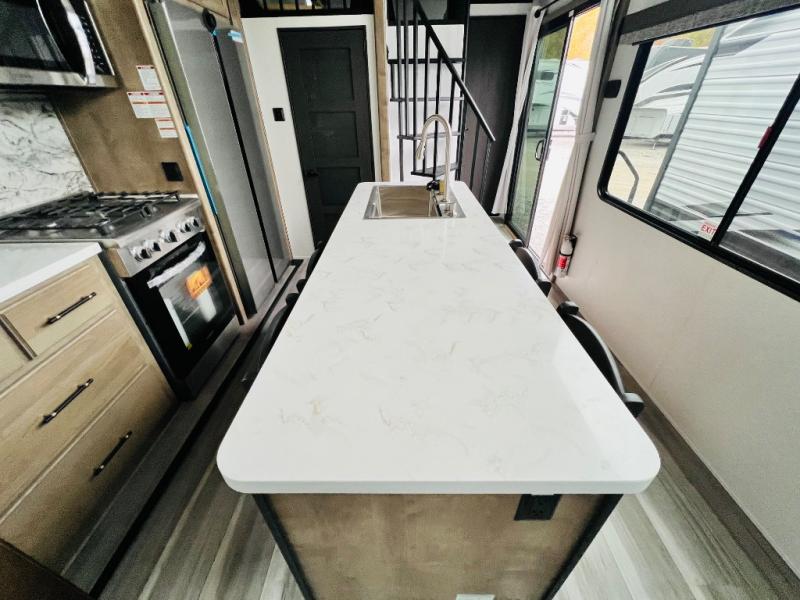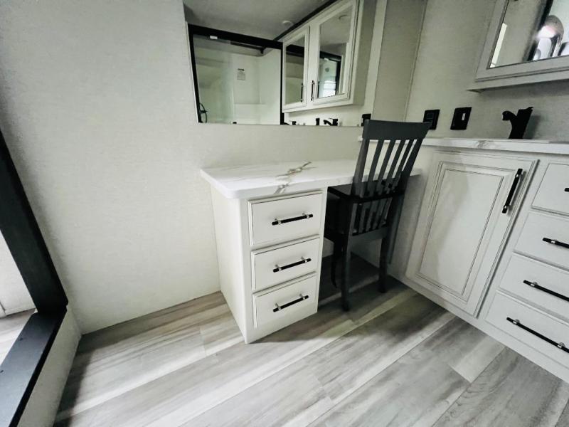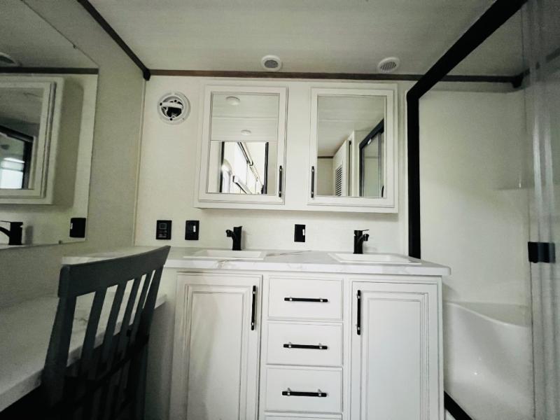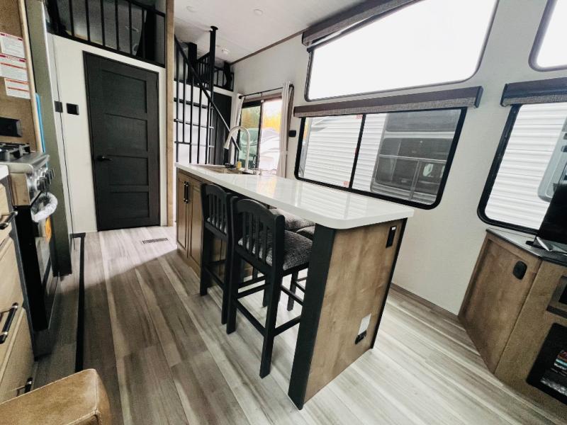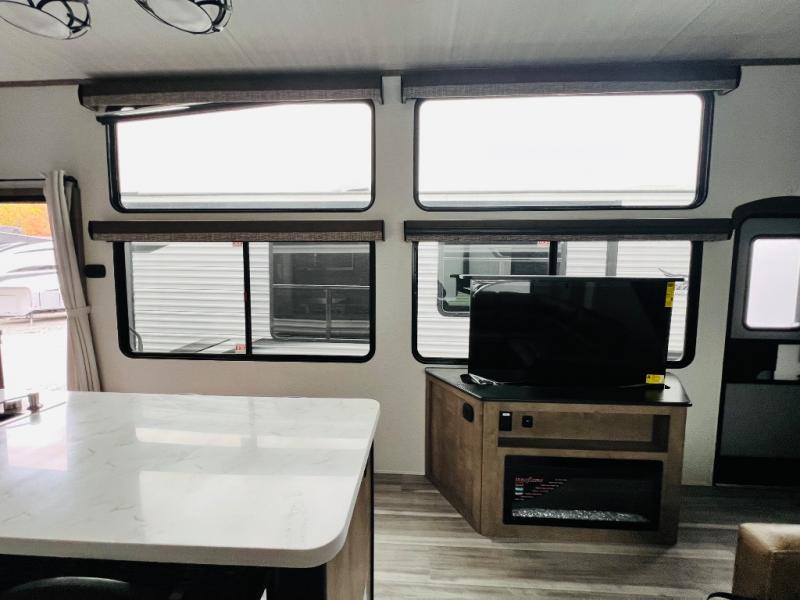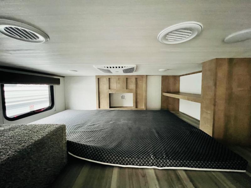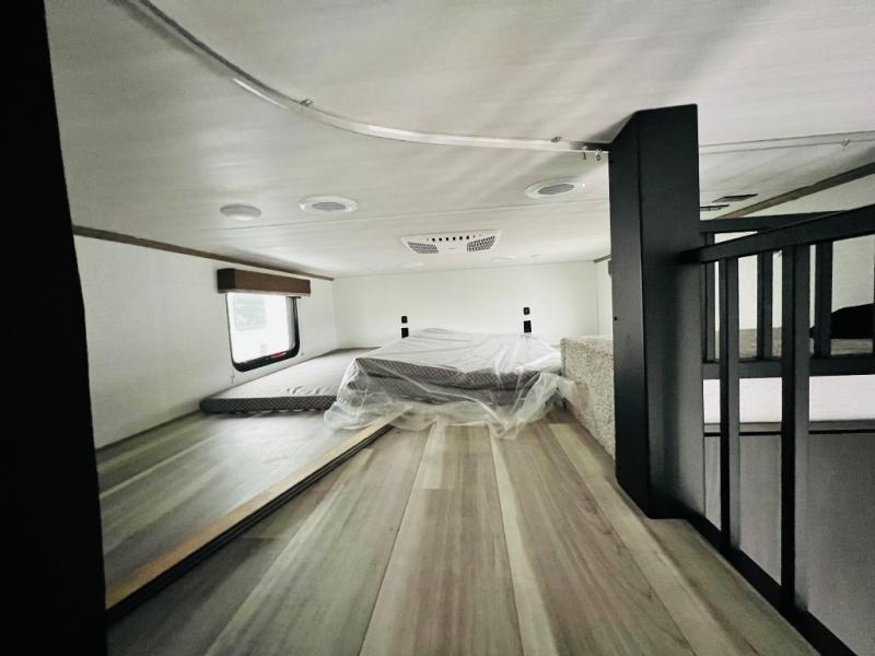 This destination trailer is a home away from home where comfort, relaxation, and entertainment come together in perfect harmony. The rear bathroom is a serene oasis, featuring washer and dryer prep, dual sink, and makeup vanity. Above, the loft area offers a cozy bunk mat, storage shelves, and an entertainment center - perfect for kids or guests. The living area is designed for relaxation and entertainment, featuring a comfortable sectional sofa, entertainment center, and warm fireplace. The kitchen is a gourmet's paradise, boasting a refrigerator, pantry, three-burner cooktop, kitchen island with chairs, and spacious pantry. The front bedroom is a peaceful retreat, complete with a half bath, overhead cabinets, a king bed, a wardrobe, and a dresser. Above, the loft area offers three bunk mats - perfect for kids or guests. Outside, enjoy the shade and protection of our 26' awning and convenient access via two entry/exit doors.